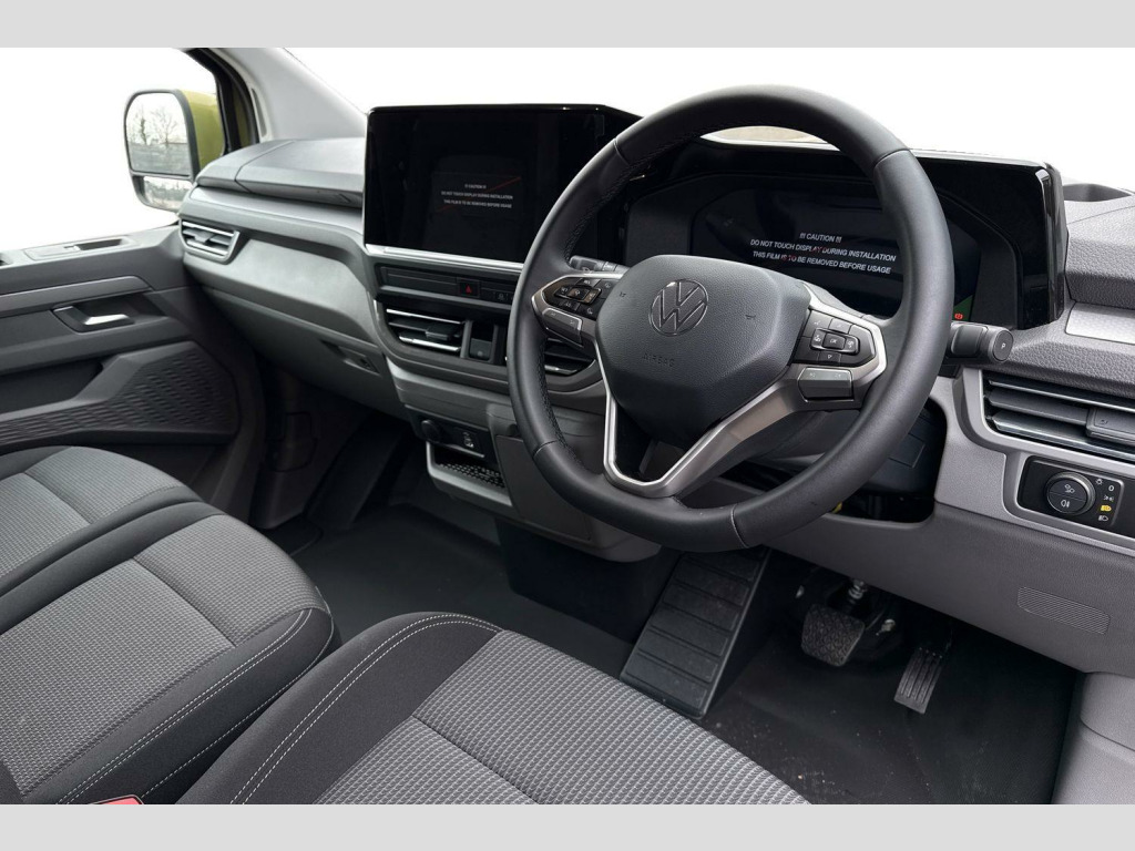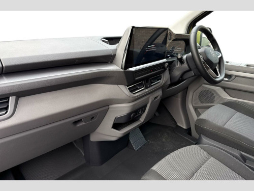 Volkswagen Transporter 2.0 TDI 150 Commerce Pro Van Heat reflecting side window glass, Body colour bumpers, Body coloured door handles, Body coloured radiator grille, Mud flaps front and rear, Rear Transporter nameplate in black grained decorative trim, Vehicle opening configuration 1x 1st row of seats, 2x all doors, Electromechanical brake booster, Electronic stability control, ABS, ASR with deactivation button, hill start assist and brake assist system, Adaptive cruise control, Electromechanical speed sensitive power steering, height and longitudinally adjustable steering column, Lane and blind spot assist with exit warning system, Wrong way driver warning, Body coloured door mirrors, Electrically heated, adjustable and folding door mirrors, Driver and front passenger airbag with front passenger airbag deactivation, Dual tone horn, Front and curtain airbags for driver and front passenger, Seat belt pretensioner for driver seat, Apple CarPlay and Android Auto, Wireless mobile phone charging, 12" digital drivers display, 13" touchscreen infotainment display with wireless app connect and DAB radio, 5G Modem, Dynamic road sign display, eCall emergency system, Preparation of VW connect and connect plus, Alternator - 230A, 2x 15-W USB data/charging ports in dashboard and 1x USB-C, 1x USB-A center bottom, 5 additional USB-C charging ports, Black plastic scuff plate for sliding door in cargo without illumination, Glasses compartment in driver side roof, Grab handle on A-pillar passenger side, Illuminated lockable glovebox, Leatherette gear lever, Narrow centre console with cup holder and compartment for mobile phone, Overhead storage compartment, Rubber floor covering in cab, Striped fabric upholstery, Cabin interior lighting, 12V outlet in centre console and 12V outlet on rear right D-pillar, 2x LED lights in load compartment, 3x additional super bright LED lights in load compartment, Lashing rings for reinforced floor covering, Without passenger seats in load compartment, 4 way height and tilt adjustable head restraints, Anti theft alarm system with interior monitoring in cab, backup horn and towing protection, Electronic immobiliser, Lockable wheel bolts, Preparation for alcohol ignition interlock, 5+ Promise