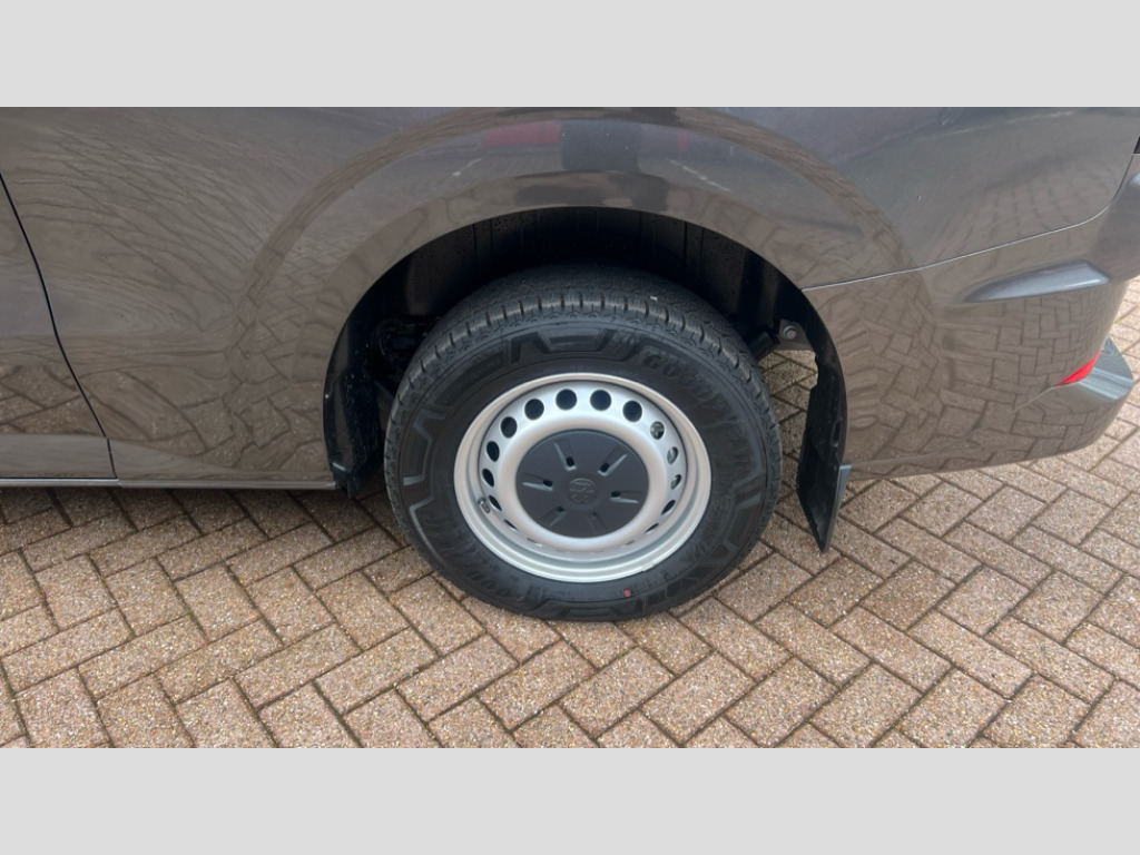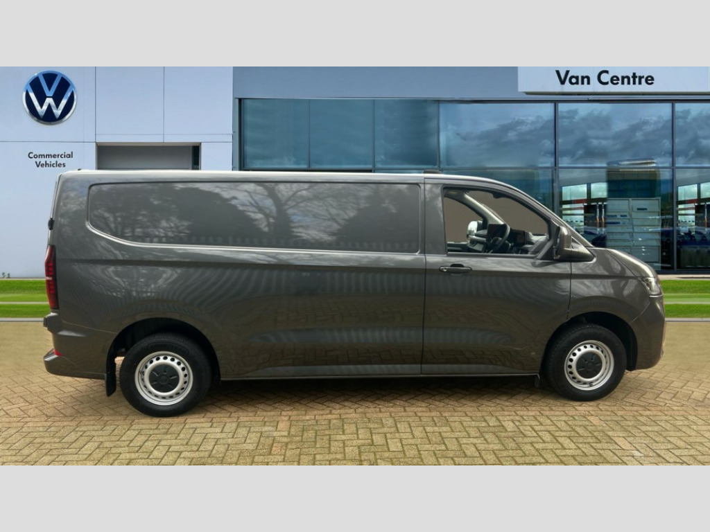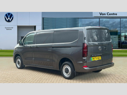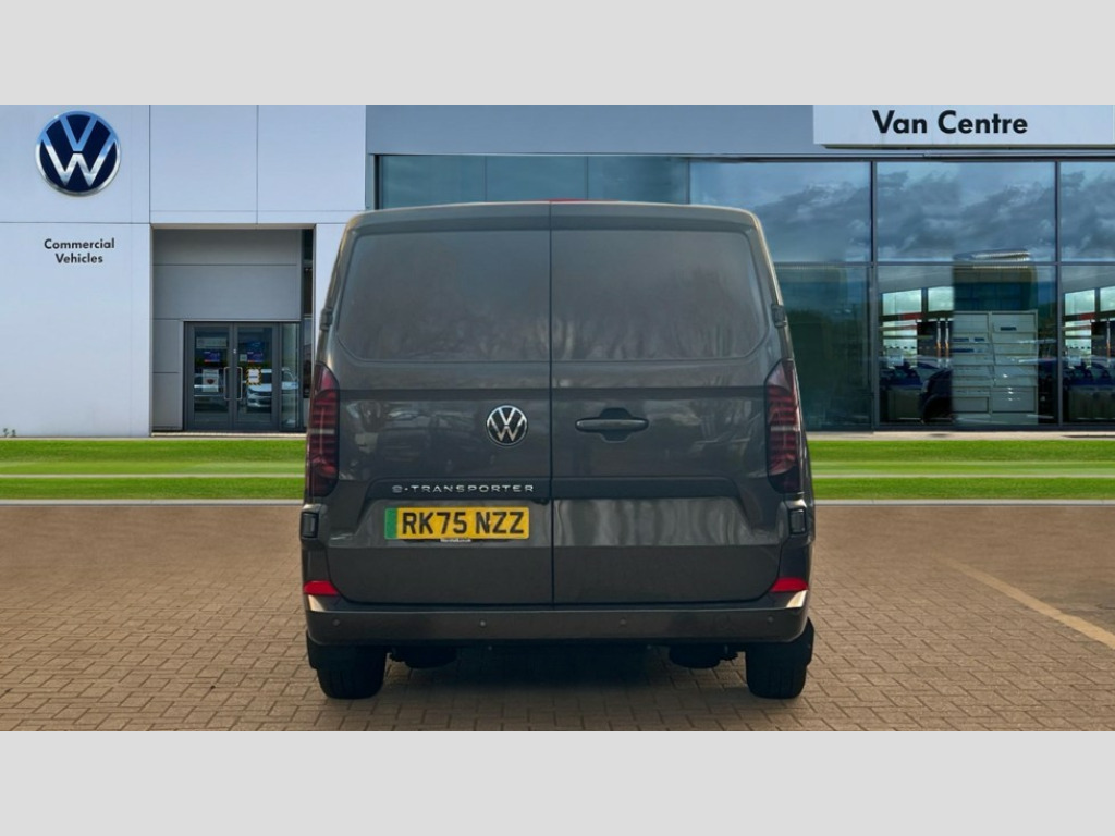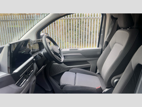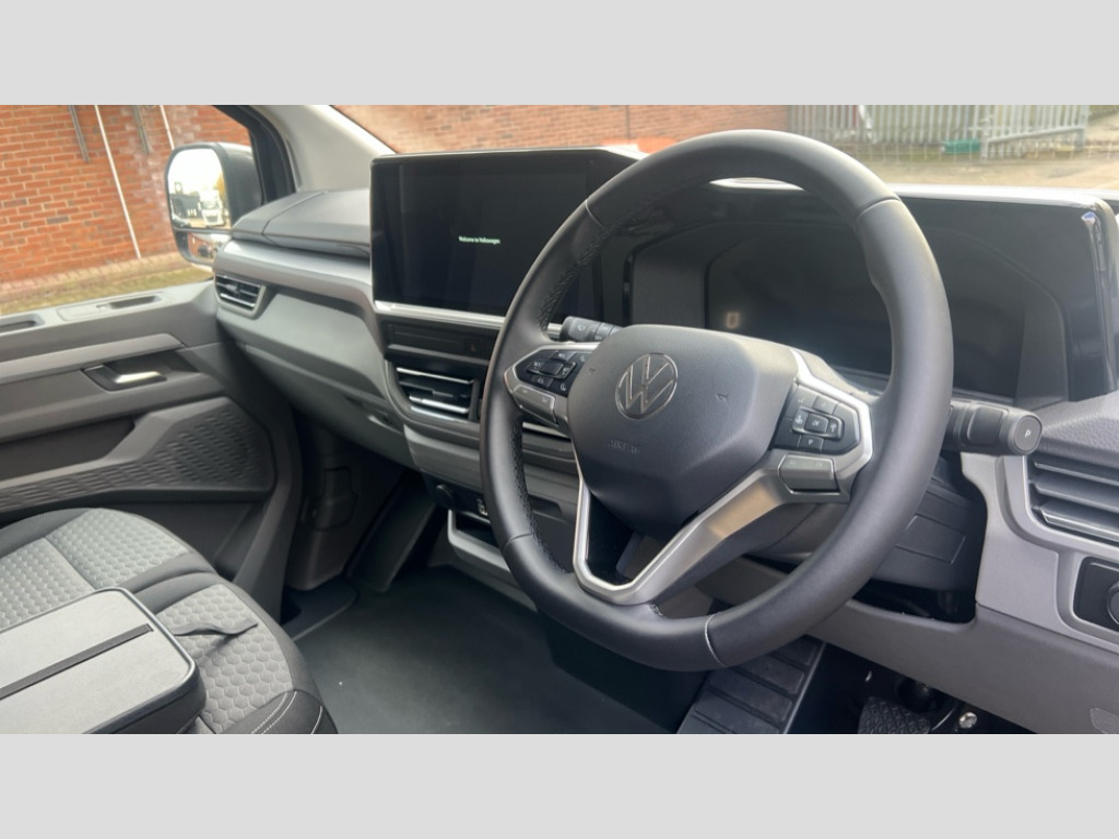 Volkswagen Transporter 100kW 65kWh Commerce Plus Van Auto 12" digital drivers display, 13" touchscreen infotainment display with wireless app connect and DAB radio, 5G Modem, Apple CarPlay and Android Auto, Cruise control, Dynamic road sign display, eCall emergency system, Electromechanical speed sensitive power steering, height and longitudinally adjustable steering column, Lane assist, Preparation of VW connect and connect plus, Wrong way driver warning, 4 speakers - 2x dashboard, 2x cab doors, Body coloured door handles, Heat reflecting side window glass, Mud flaps front and rear, Rear Transporter nameplate in black grained decorative trim, Vehicle opening configuration 1x 1st row of seats, 2x all doors, 2x 15-W USB data/charging ports in dashboard and 1x USB-C, 1x USB-A center bottom, 2x LED lights in load compartment, 4 way height and tilt adjustable head restraints, Black plastic scuff plate for sliding door in cargo without illumination, Cabin interior lighting, Electric auxiliary heater, Heat pump, Lashing rings for reinforced floor covering, Narrow centre console with cup holder and compartment for mobile phone, Overhead storage compartment, Roof grab handle on front passenger side, Rubber floor covering in cab, Striped fabric upholstery, Without passenger seats in load compartment, Driver and front passenger airbag with front passenger airbag deactivation, Front and curtain airbags for driver and front passenger, Seat belt pretensioner for driver seat, Single tone horn, Anti theft alarm system with interior monitoring in cab, backup horn and towing protection, Electronic immobiliser, Preparation for alcohol ignition interlock, 5+ Promise, Electromechanical brake booster, Electronic stability control, ABS, ASR with deactivation button, hill start assist and brake assist system, Mode 3 charging cable, type 2, 3-phase, 32A, cable length 5m, Goodyear all season tyres, Tyre mobility kit in lieu of spare wheel with 12 volt compressor and tyre sealant