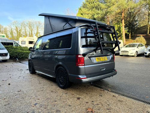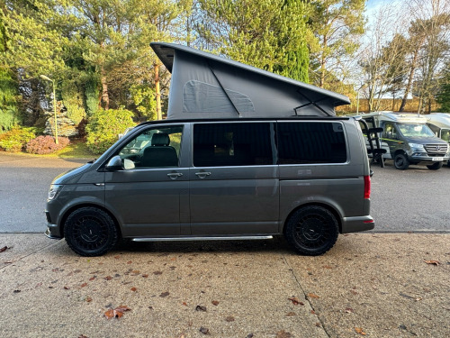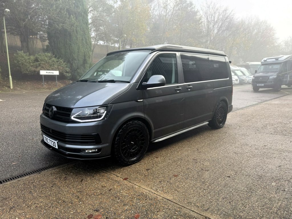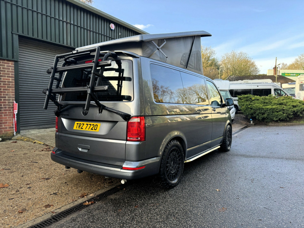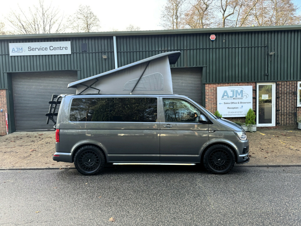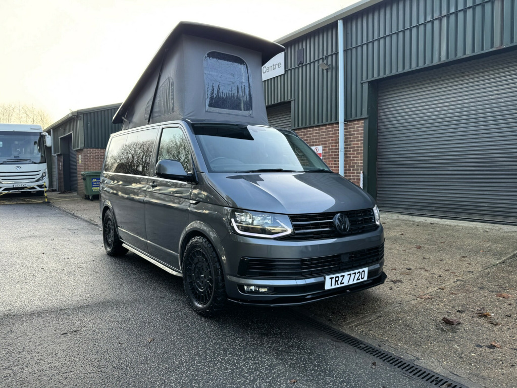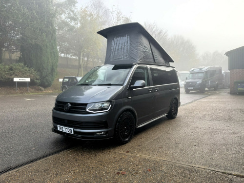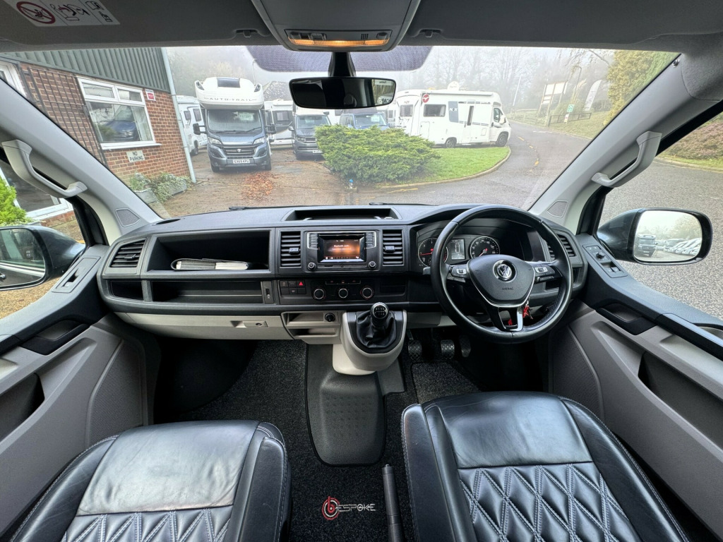*** NEW ARRIVAL *** We are delighted to offer this stunning conversion carried out by BeSpoke conversions on the popular T6 chassis.The conversion has been carried out to the highest standard with multiple features courtesy of the previous owner and original converter.Volkswagen T6 chassis, 150BHP, manual 6 speed gearbox, heated windscreen, Air-Con, reversing sensors, Cruise control, multi functional steering wheel, Twin single captains chairs with twin swivel base frames.Full leather throughout with white stitching and cross hatch design detail, Rib red rear bench seat with under bench storage draw unit and stow away cupboard for Porta Potti toilet cassette, LED lighting throughout.Equiped kitchen with Dometic under counter compressor fridge, storage cupboard, 2x gas burner hob with single bowl sink with glass lid covers, 2x 240v sockets and double USB 12v points, Gas tank level gauge. Pop up roof with front window and twin side mesh vent side windows, double bed option with memory foam mattress.Rear boot with tailgate with twin cupboards additional storage, Kenwood rear speakers.Exterior of the campervan features: LED DRL headlights with xenon headlights, Carbon fibre effect rear boot tailgate bumper protector sill, front lower bumper splitter, Reimo awning rail, T6.1 side running bars, Thule 2x rail bike rack tailgate mounted, Rear boot spoiler, Lowered suspension, Super Metal block gloss alloys with BF Goodrich tyres., Black Gloss VW badges front and back.Viewing highly recommended here at the dealership today.Disclaimer: Whilst every effort is made to ensure the accuracy of the data shown, it is not a definitive statement of specification of the vehicle and no responsibility will be accepted for errors in listing made on this site. r conditioning, bluetooth connection, full leather, xenon headlamps, captain chairs, drivers arm rest, tailgate, cruise control, multi-function steering wheel, parking sensors, power steering, steering wheel reach adjustment, trip computer, abs, quick-clear screen, service indicator, twin air bags, immobiliser, privacy glass, remote central locking, electric mirrors, heated door mirrors, windscreen heating, radio/cd, front armrest, height adjustable drivers seat, body coloured bumpers, colour coded body, front fog lights, full size spare wheel, led 3rd brake light, led daytime running lights, rear spoiler, 12v compressor fridge, 12v points, 12v usb charging points, 18, colour coded wing mirrors, dometic hob & sink, fresh water onboard tank, internal fitted curtains, led lighting throughout, leisure battery, m1 type approved bed, mains 240v sockets, overhead led lighting, reimo side awning rail, swivel captains chairs, t6.1 running side bars, underslung gas tank