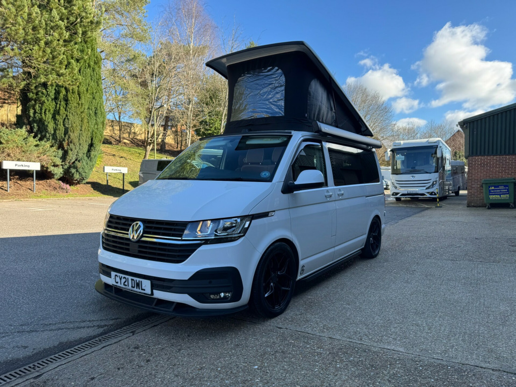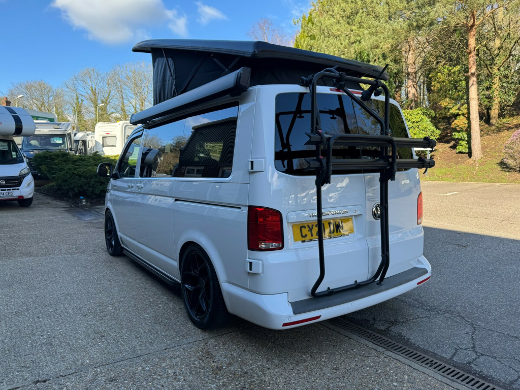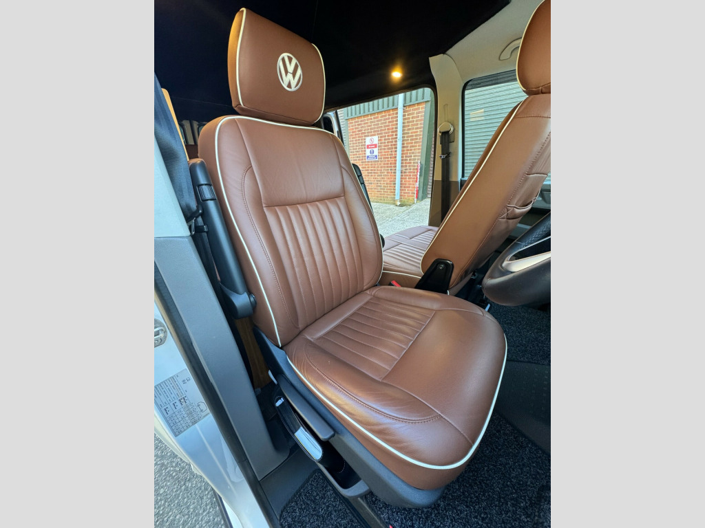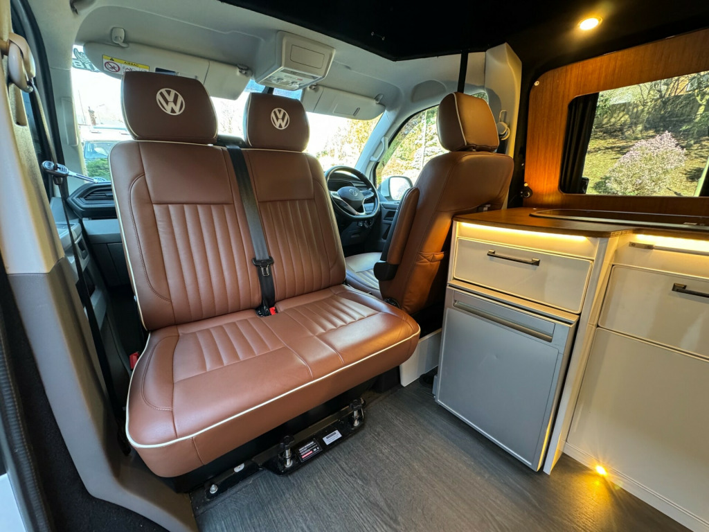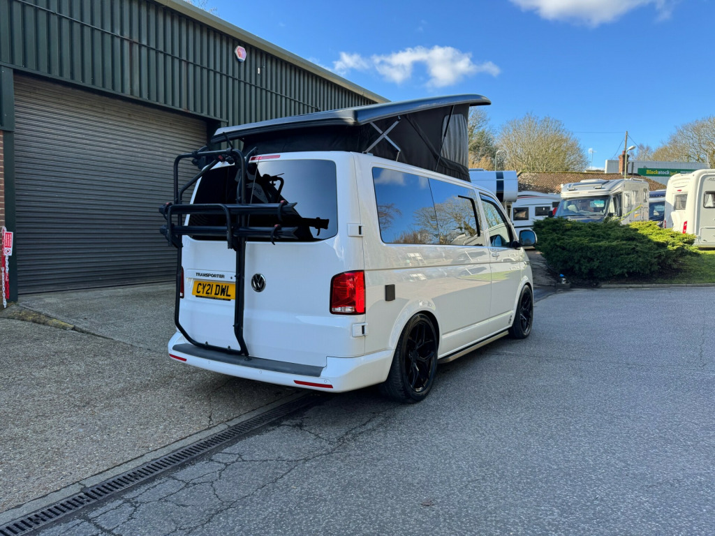 *** NEW ARRIVAL *** We are delighted to offer this stunning conversion on the ever popular 2021 VW Transporter Hi-Line chassis previously supplied by ourselves. This conversion has been carried out to a very high standard and has many features such as, Rear heating, 4000watt inverter system, Dometic Fridge with freezer box, USB and Mains sockets throughout, 2x burner gas hob and sink unit with black gloss lid cover, ample storage throughout, Pop up roof with side net breather windows and front window with complete black out blinds. this pop top also completely un zips and opens up to create the desired open panoramic view, twin leisure batteries, space for one 907 gas bottle in secure gas locker, fresh water and waste water tanks, rock and roll bed with isofix connection, full tan leather throughout with VW embroidery on the head restraints, suede backing effect on the back of the rock-n-roll for bed makeup.The exterior of the camper is in a white colour with front lower splitter, 19inch black gloss alloy wheels, T6.1 Black gloss side running bars, Rear tinted glass, Thule 2.6m awning, 2 Rail Bike Rack, side wall mounted mains hook up socket.The pop-top roof has the upgraded roof selected option with full unzippable front face to create full open front view.Engine BHP available on request..The overall condition of the camper is excellent and viewing is highly recommended.Disclaimer: Whilst every effort is made to ensure the accuracy of the data shown, it is not a definitive statement of specification of the vehicle and no responsibility will be accepted for errors in listing made on this site. r conditioning, bluetooth connection, door mirrors electrically foldable, full leather, double bed, hand basin, 2-burner hob, fridge freezer, side kitchen, 3 point seatbelts, central locking, electric windows, power steering, cruise control, multi-function steering wheel, parking sensors, steering wheel rake adjustment, steering wheel reach adjustment, trip computer, abs, isofix child seat anchor points, quick-clear screen, service indicator, twin air bags, immobiliser, privacy glass, remote central locking, electric mirrors, heated door mirrors, windscreen heating, bluetooth enabled stereo, digital radio, media storage, mobile phone app interface, steering wheel audio controls, front armrest, front head restraints, height adjustable drivers seat, auto lighting, body coloured bumpers, colour coded body, front fog lights, led 3rd brake light, led rear lights, 12v points, 12v usb charging points, 1400 watt inverter system, 19, ample storage offered, colour coded wing mirrors, diesel heating, fiamma 2 rail bike rack, fresh water onboard tank, front bumper splitter, internal fitted curtains, led lighting throughout, m1 type approved bed, mains 240v sockets, omnistor thule awning, overhead led lighting, overhead pop roof bed guard, rear heating, roof mounted solar panel, side & rear curtains, side opening window, space for 907 gas bottle, swivel bench seat, twin leisure batteries, under counter led lighting, 19, 19'' Alloys