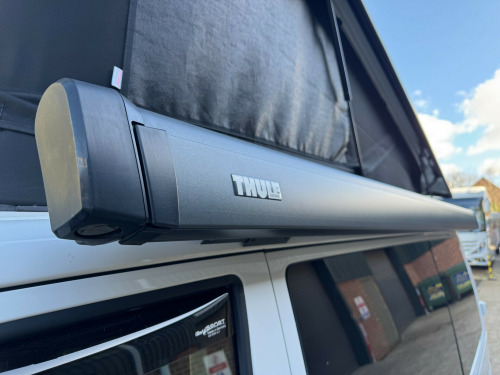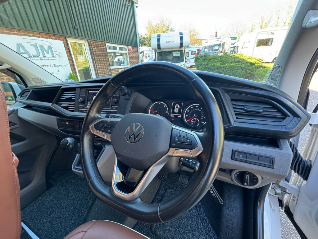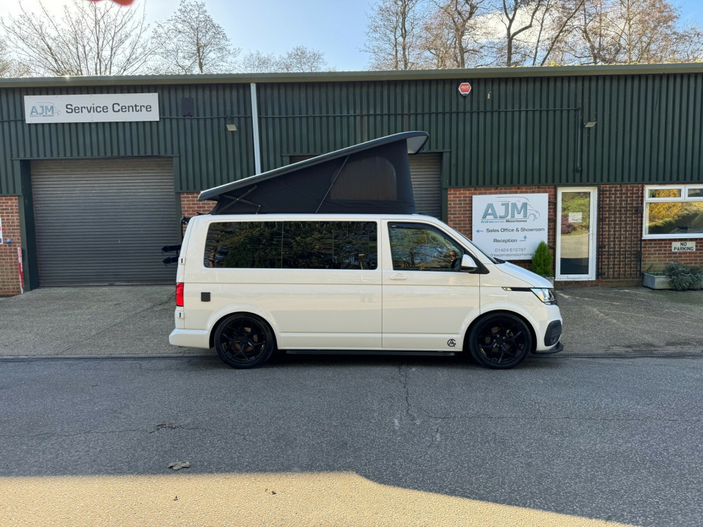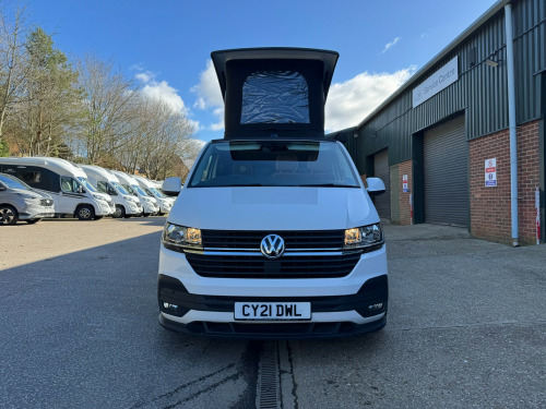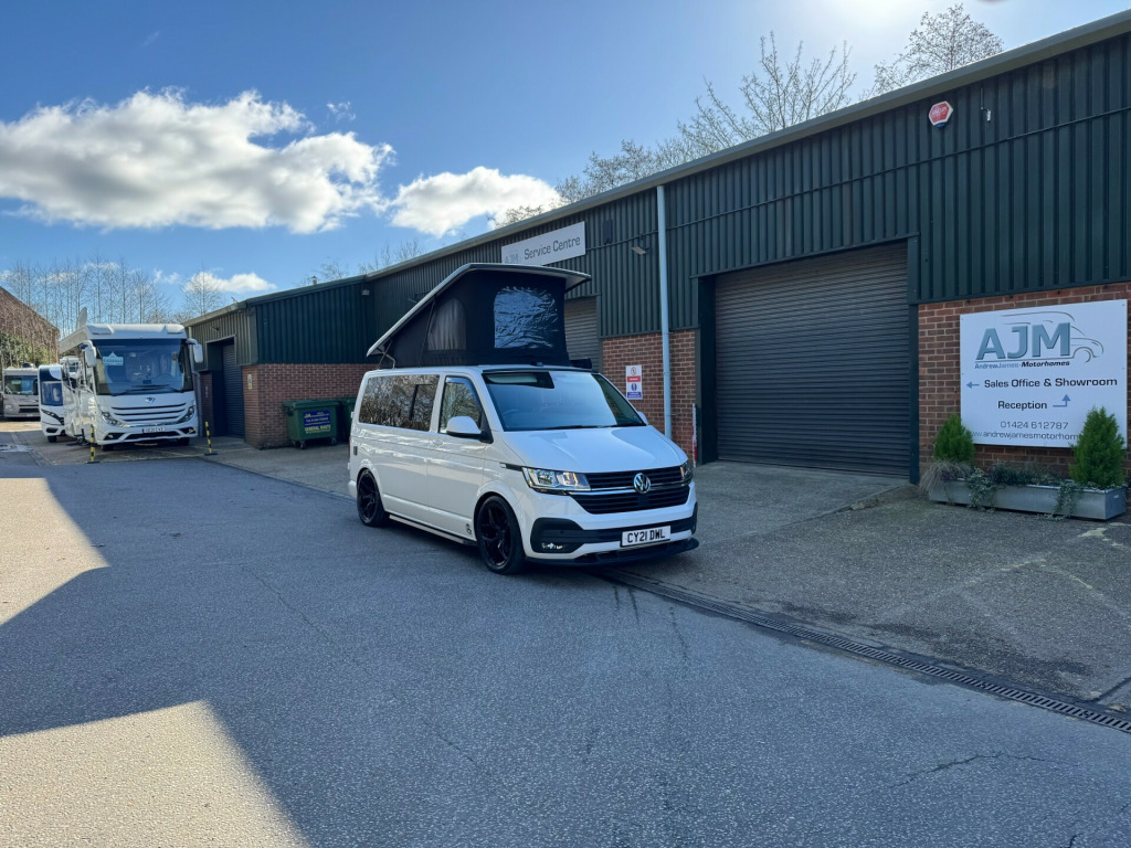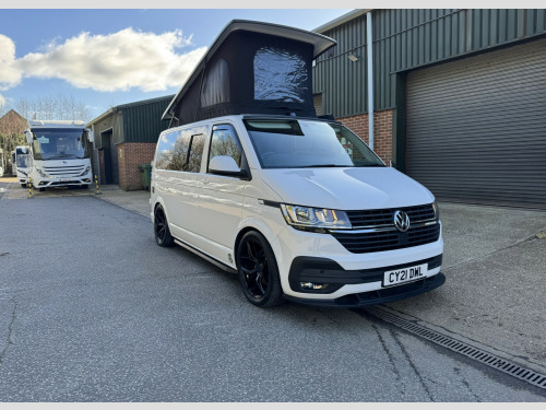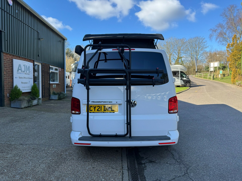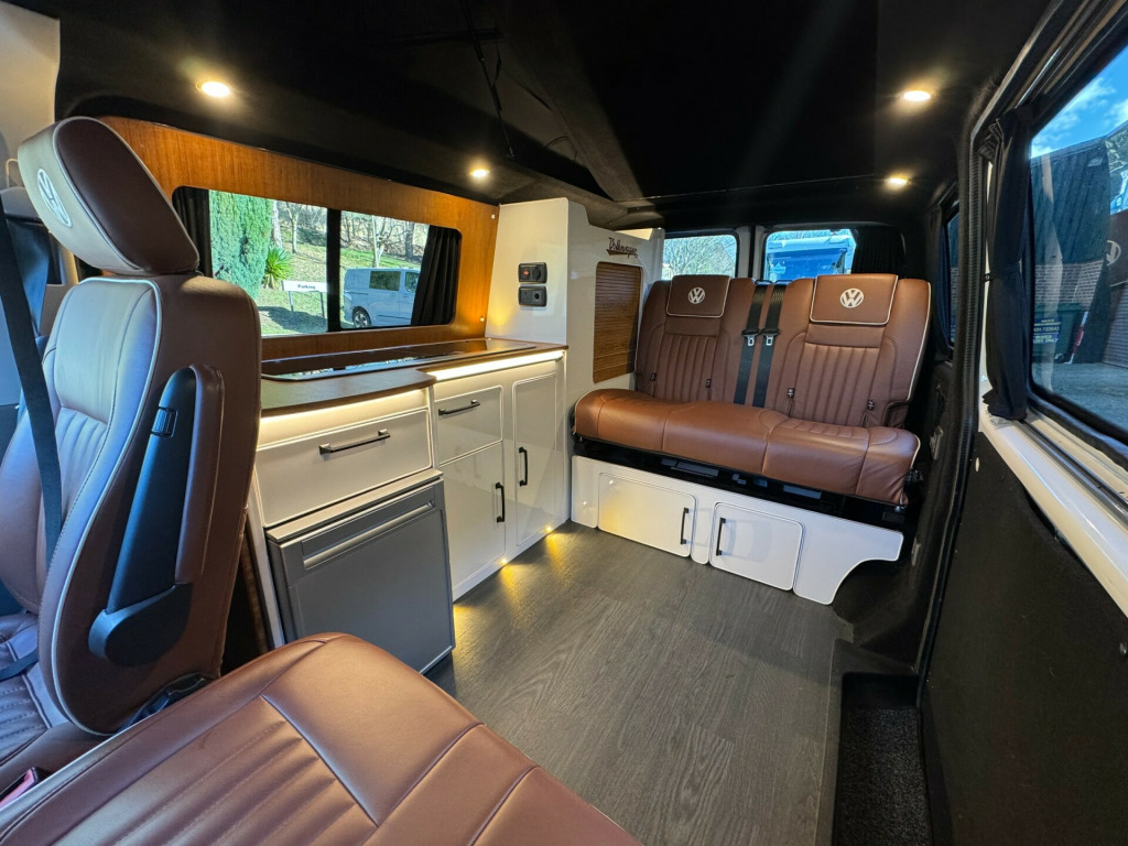 *** NEW ARRIVAL *** We are delighted to offer this stunning conversion on the ever popular 2021 VW Transporter Hi-Line chassis previously supplied by ourselves. This conversion has been carried out to a very high standard and has many features such as, Rear heating, 4000watt inverter system, Dometic Fridge with freezer box, USB and Mains sockets throughout, 2x burner gas hob and sink unit with black gloss lid cover, ample storage throughout, Pop up roof with side net breather windows and front window with complete black out blinds. this pop top also completely un zips and opens up to create the desired open panoramic view, twin leisure batteries, space for one 907 gas bottle in secure gas locker, fresh water and waste water tanks, rock and roll bed with isofix connection, full tan leather throughout with VW embroidery on the head restraints, suede backing effect on the back of the rock-n-roll for bed makeup.The exterior of the camper is in a white colour with front lower splitter, 19inch black gloss alloy wheels, T6.1 Black gloss side running bars, Rear tinted glass, Thule 2.6m awning, 2 Rail Bike Rack, side wall mounted mains hook up socket.The pop-top roof has the upgraded roof selected option with full unzippable front face to create full open front view.Engine BHP available on request..The overall condition of the camper is excellent and viewing is highly recommended.Disclaimer: Whilst every effort is made to ensure the accuracy of the data shown, it is not a definitive statement of specification of the vehicle and no responsibility will be accepted for errors in listing made on this site. r conditioning, bluetooth connection, door mirrors electrically foldable, full leather, double bed, hand basin, 2-burner hob, fridge freezer, side kitchen, 3 point seatbelts, central locking, electric windows, power steering, cruise control, multi-function steering wheel, parking sensors, steering wheel rake adjustment, steering wheel reach adjustment, trip computer, abs, isofix child seat anchor points, quick-clear screen, service indicator, twin air bags, immobiliser, privacy glass, remote central locking, electric mirrors, heated door mirrors, windscreen heating, bluetooth enabled stereo, digital radio, media storage, mobile phone app interface, steering wheel audio controls, front armrest, front head restraints, height adjustable drivers seat, auto lighting, body coloured bumpers, colour coded body, front fog lights, led 3rd brake light, led rear lights, 12v points, 12v usb charging points, 1400 watt inverter system, 19, ample storage offered, colour coded wing mirrors, diesel heating, fiamma 2 rail bike rack, fresh water onboard tank, front bumper splitter, internal fitted curtains, led lighting throughout, m1 type approved bed, mains 240v sockets, omnistor thule awning, overhead led lighting, overhead pop roof bed guard, rear heating, roof mounted solar panel, side & rear curtains, side opening window, space for 907 gas bottle, swivel bench seat, twin leisure batteries, under counter led lighting, 19, 19'' Alloys