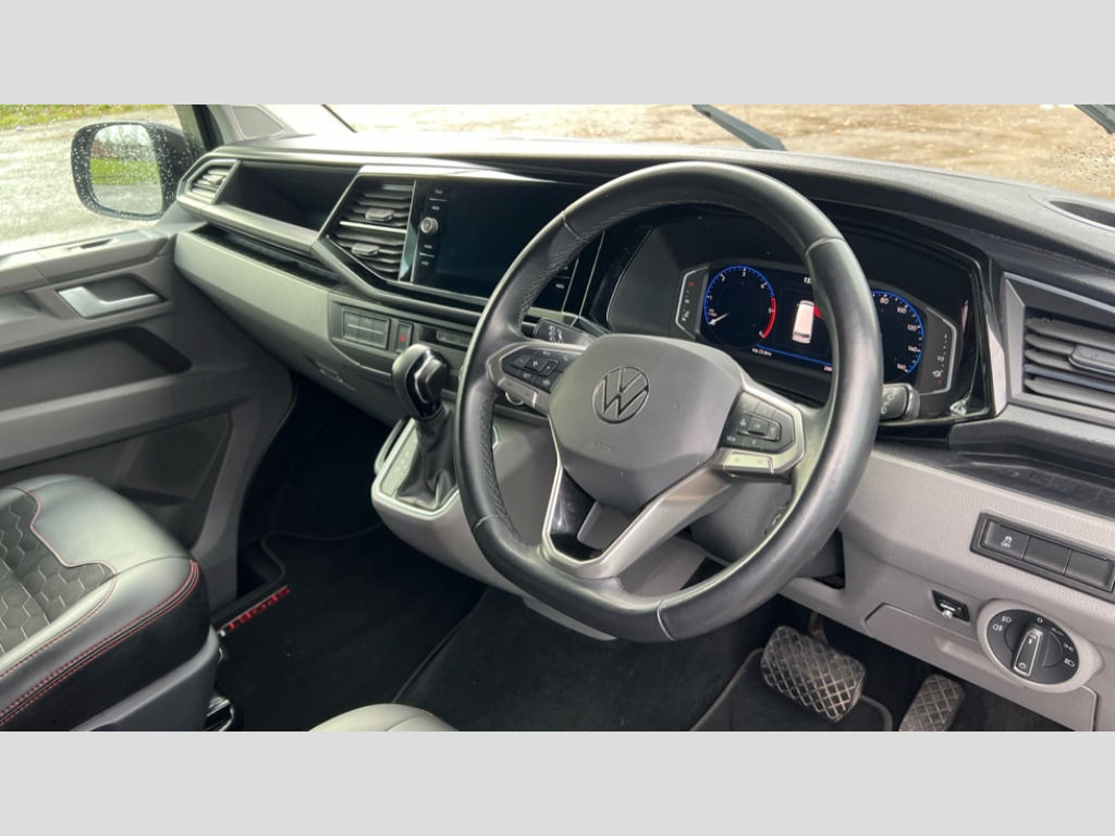 Volkswagen Transporter 2.0 BiTDI 204 Sportline Kombi Van DSG Adaptive cruise control, Cross wind assist, Digital cockpit, Dimmable dashboard ilumination, Driver alert system, eCall emergency system, Electromechanical steering, Forward collision warning front assist with autonomous emergency braking, Front and rear parking sensors, Front assist including city emergency braking system, Multi function display plus with black and white display, Rear view camera, Tyre pressure loss indicator, 2 USB interfaces type C in dashboard, 4 speakers with 2 tweeters and 2 woofers, Digital radio reception (DAB+), Discover Media navigation system with 8.0" touch-screen including Streaming and Internet, Volkswagen app connect, Auto dimming interior rear view mirror, Automatic headlight control, leaving home and manual coming home feature, Body colour bumpers, Body coloured door handles, Enhanced front bumper including lower front diffuser, Front electric windows, Front fog lamps with cornering light, Front sliding window and rear closed left side panel in load/passenger compartment, Front sliding window and rear closed right side panel in load/passenger compartment, Gloss black wing mirrors, Heat insulating windows in cab, Heated laminated windshield, High beam assist, Illuminated chrome side bars, Illuminated steps in passenger/load compartment, LED headlights with LED daytime running lights and LED tail lights, Power folding door mirrors, Privacy glass from the B-pillar and heat-insulating glass in front, Rear tailgate spoiler, Rear window in tailgate with wiper and washer system, Sportline front wing and rear tailgate badging, Tailgate closing with unlatching from the inside, Windshield wiper with intermittent control with rain sensor, 12V socket, 2 bench seats on driver side and individual seat with easy entry on the passenger side in 2nd row seats, Armrests for both front seats, Carpet floor covering in cab, Comfort dashboard, Dash panel with open stowage compartments, drink holders and lockable glovebox, Dust/pollen filter, Electronically controlled front air conditioning system and second heating system in passenger compartment, Entry handle on A-pillar on drivers and front passengers side, Folding grab handles on roof frame, Full height side trim panels in the load compartment, Gloss black inserts in dashboard, Glove compartment with illumination, Heated driver and front passenger seats, Heavy duty tool kit and jack, Interior lighting with LED technology in load compartment, Interior styling and badging, ISOFIX and top tether child seat anchors for the outer seats of the three-seater bench seat, Leather trimmed multi-function steering wheel with height and longitudinal adjustment, LED Interior lighting with two reading lights in the roof console, Manual height adjustable and lumbar support for driver and single passenger seats, Nappa leather/alcantara upholstery with red contrast stitching, One waste bin in door storage compartment, Reinforced Folding lashing rings for load restraint system, Single front passenger seat, Sportline carpet mats, Sun visors with mirror and airbag label on front passenger sun visor, Driver and front passenger airbag with front passenger airbag deactivation, Single tone horn, Anti theft alarm system with interior monitoring in cab, backup horn and towing protection, Engine immobiliser, Lockable wheel bolts, Automatic post collision braking system, Diesel particulate filter, Eibach 30mm lowering springs, Electronic stability control, ABS, ASR with deactivation button, electronic differnetial lock, hill start assist and brake assist system, Start/stop system with regenerative breaking, Dashboard upper in Titanium Black, dashboard lower in Palladium and floor covering in Titanium Black, 18" Sportline Gloss black alloy wheels, Tyre mobility kit in lieu of spare wheel with 12 volt compressor and tyre sealant