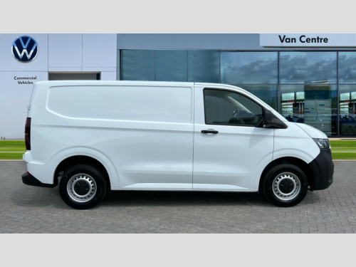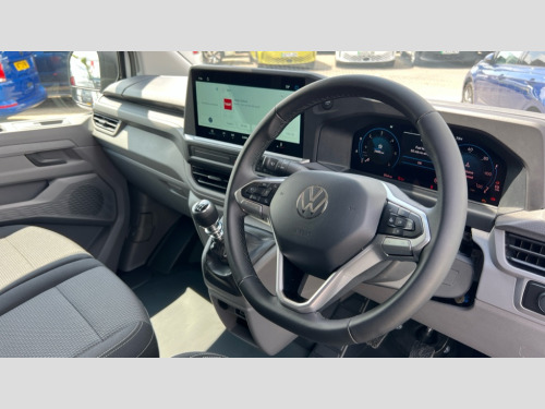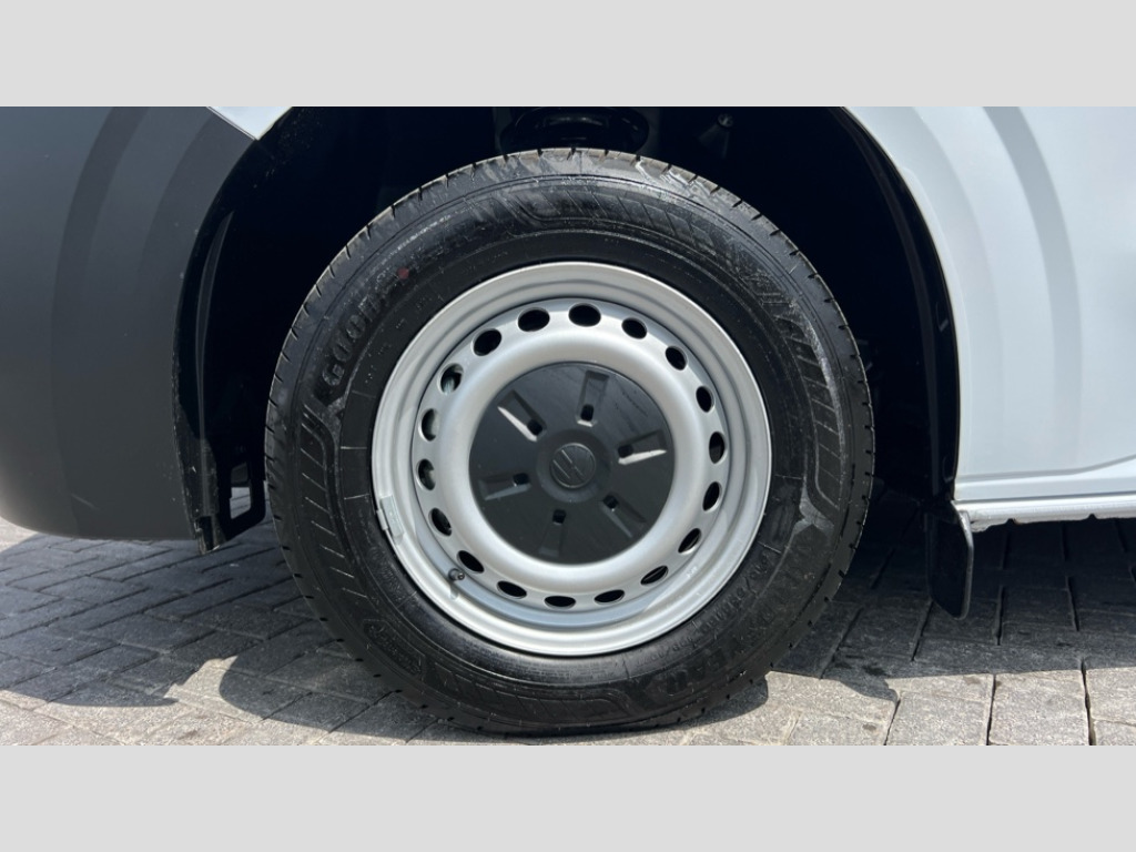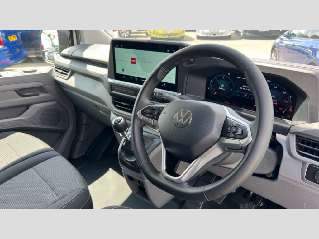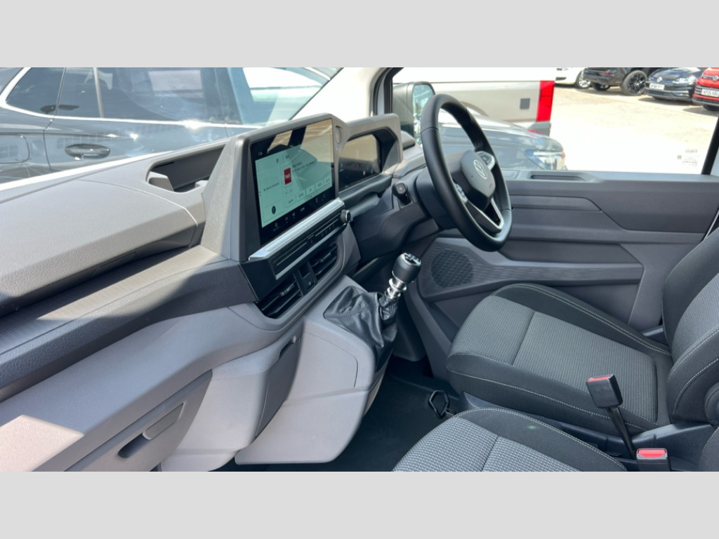 Volkswagen Transporter 2.0 TDI 110 Commerce Plus Van 12" digital drivers display, 13" touchscreen infotainment display with wireless app connect and DAB radio, 5G Modem, Apple CarPlay and Android Auto, Cruise control, Dynamic road sign display, eCall emergency system, Electromechanical speed sensitive power steering, height and longitudinally adjustable steering column, Lane assist, Preparation of VW connect and connect plus, Wrong way driver warning, 4 speakers - 2x dashboard, 2x cab doors, Body coloured door handles, Heat reflecting side window glass, Mud flaps front and rear, Rear Transporter nameplate in black grained decorative trim, Vehicle opening configuration 1x 1st row of seats, 2x all doors, 2x 15-W USB data/charging ports in dashboard and 1x USB-C, 1x USB-A center bottom, 2x LED lights in load compartment, 3 spoke leather wrapped multi function steering wheel, 4 way height and tilt adjustable head restraints, Black plastic scuff plate for sliding door in cargo without illumination, Cabin interior lighting, Lashing rings for reinforced floor covering, Leatherette gear lever, Narrow centre console with cup holder and compartment for mobile phone, Overhead storage compartment, Roof grab handle on front passenger side, Rubber floor covering in cab, Striped fabric upholstery, Without passenger seats in load compartment, Driver and front passenger airbag with front passenger airbag deactivation, Dual tone horn, Front and curtain airbags for driver and front passenger, Seat belt pretensioner for driver seat, Anti theft alarm system with interior monitoring in cab, backup horn and towing protection, Electronic immobiliser, Preparation for alcohol ignition interlock, 5+ Promise, Alternator - 230A, Electronic stability control, ABS, ASR with deactivation button, hill start assist and brake assist system