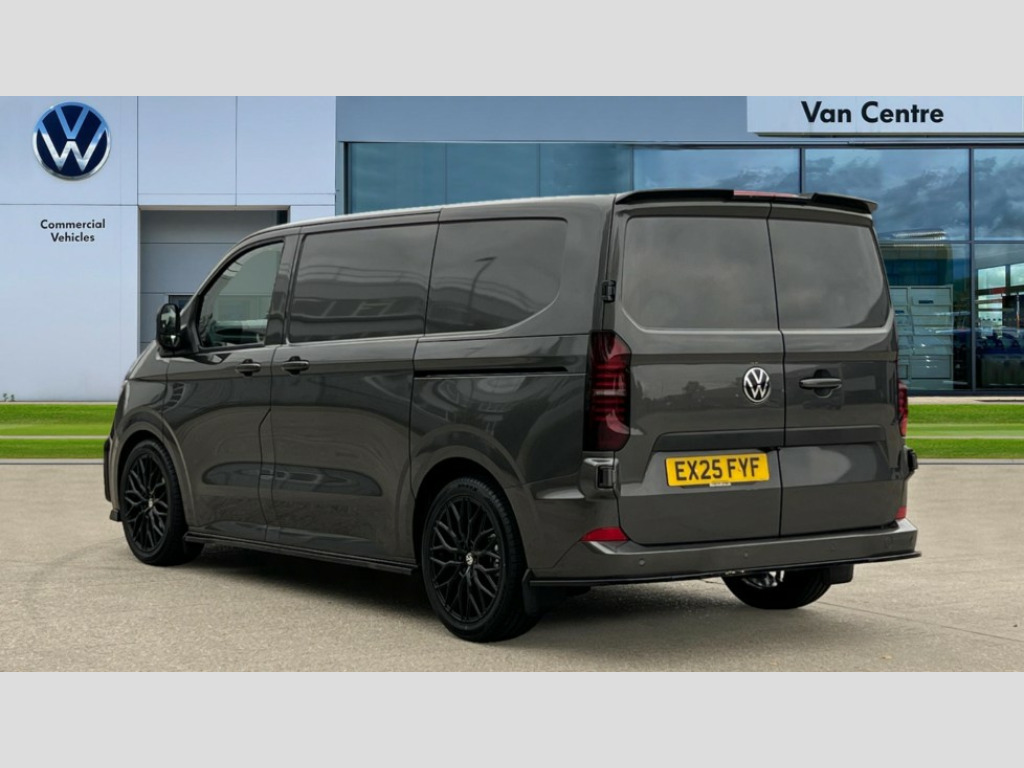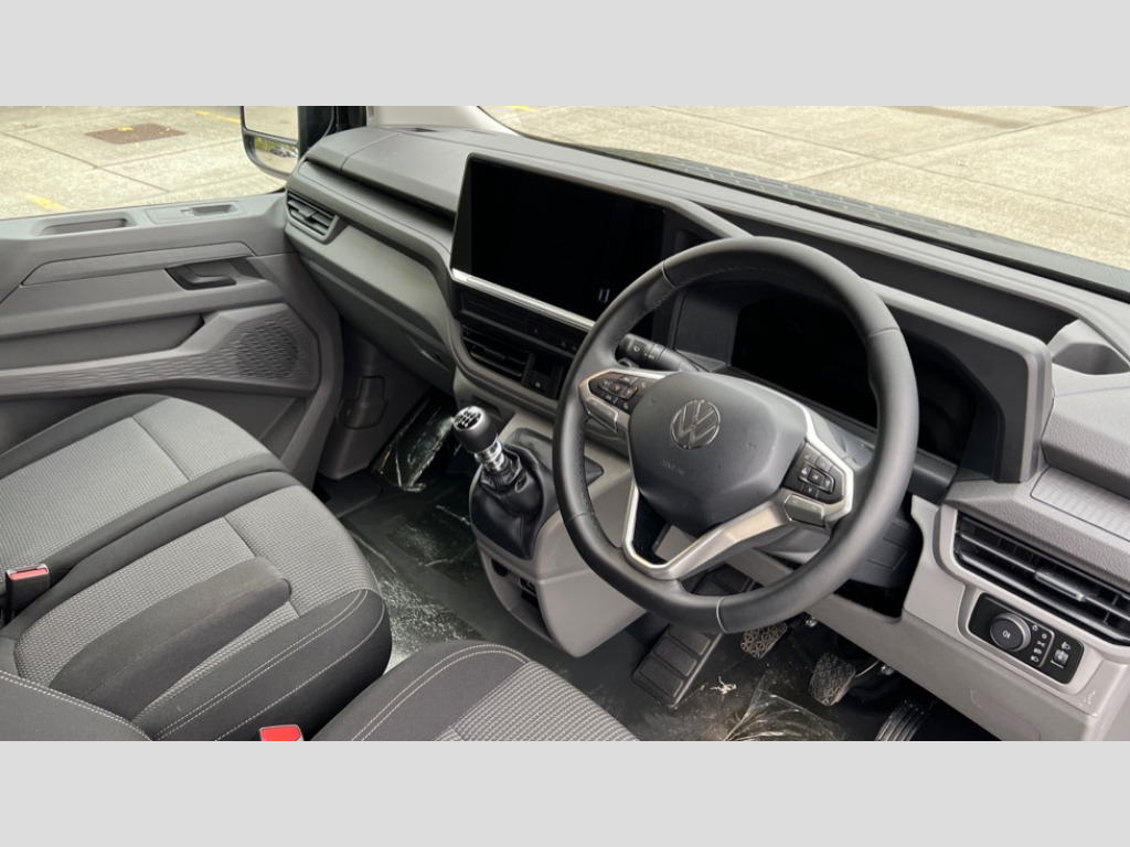 Volkswagen Transporter 2.0 TDI 110 Commerce Pro Van 12" digital drivers display, 13" touchscreen infotainment display with wireless app connect and DAB radio, 5G Modem, Adaptive cruise control, Apple CarPlay and Android Auto, Dynamic road sign display, eCall emergency system, Electromechanical speed sensitive power steering, height and longitudinally adjustable steering column, Lane and blind spot assist with exit warning system, Preparation of VW connect and connect plus, Wireless mobile phone charging, Wrong way driver warning, Body colour bumpers, Body coloured door handles, Body coloured door mirrors, Body coloured radiator grille, Electrically heated, adjustable and folding door mirrors, Heat reflecting side window glass, Mud flaps front and rear, Rear Transporter nameplate in black grained decorative trim, Vehicle opening configuration 1x 1st row of seats, 2x all doors, 12V outlet in centre console and 12V outlet on rear right D-pillar, 2x 15-W USB data/charging ports in dashboard and 1x USB-C, 1x USB-A center bottom, 2x LED lights in load compartment, 3x additional super bright LED lights in load compartment, 4 way height and tilt adjustable head restraints, 5 additional USB-C charging ports, Black plastic scuff plate for sliding door in cargo without illumination, Cabin interior lighting, Glasses compartment in driver side roof, Grab handle on A-pillar passenger side, Illuminated lockable glovebox, Lashing rings for reinforced floor covering, Leatherette gear lever, Narrow centre console with cup holder and compartment for mobile phone, Overhead storage compartment, Rubber floor covering in cab, Striped fabric upholstery, Without passenger seats in load compartment, Driver and front passenger airbag with front passenger airbag deactivation, Dual tone horn, Front and curtain airbags for driver and front passenger, Seat belt pretensioner for driver seat, Anti theft alarm system with interior monitoring in cab, backup horn and towing protection, Electronic immobiliser, Lockable wheel bolts, Preparation for alcohol ignition interlock, 5+ Promise, Alternator - 230A, Electromechanical brake booster, Electronic stability control, ABS, ASR with deactivation button, hill start assist and brake assist system