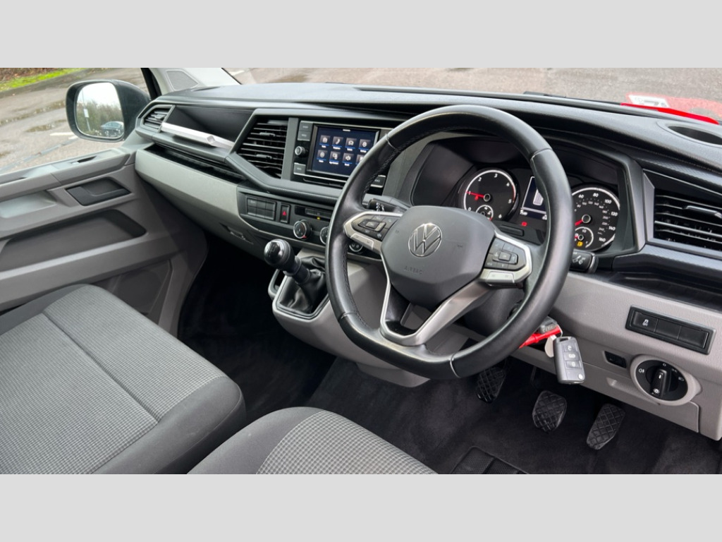 Volkswagen Transporter 2.0 TDI 110 Startline Van Cross wind assist, Dimmable illuminated instruments, Driver alert with Multi-function display plus, eCall emergency system, Forward collision warning front assist with autonomous emergency braking, Mobile phone interface, Multi function display plus with black and white display, 2 USB interfaces type C in dashboard, 4 speakers with 2 tweeters and 2 woofers, Composition colour radio with 6.5" touchscreen, Digital radio reception (DAB+), Volkswagen app connect, Closing rear wing door with unlatching from the inside, H7 twin halogen headlamps, Heat insulating glass (green) in cab and passenger/load compartment, Heat insulating windshield made of laminated glass, Left convex exterior mirror, Rear wing doors without window apertures, Right convex exterior mirror, Separate Daytime running lights, Transporter nameplate on the rear fender, Unpainted radiator grille with 2 chrome trims, 3 spoke leather wrapped multi function steering wheel, Comfort headliner in cab, hardboard roof trim in passenger and load compartment, Dust/pollen filter, Folding grab handles on roof frame, Front and rear left without window closed side panel in load compartment, Front seats on the right in 1st row of seat, Heavy duty tool kit and jack, High partition, Interior plastic loading edge protection, LED Interior lighting in load and passenger compartment, Standard lower part dashboard in palladium, Without refrigerant, Without right side window apertures in passenger and load compartment, Non smoker pack - Transporter, 3 point height adjustable seat belts on outer seats cab with electric pretensioners, Driver and front passenger airbag with front passenger airbag deactivation, Warning buzzer and light for driver and front passenger seat belt not fastened, Without child safety lock in passenger compartment, Electronic immobiliser, Wheel bolts without wheel locks, 16" chassis with 16" brake system, Diesel particulate filter, Electronic stability control, ABS, ASR with deactivation button, hill start assist and brake assist system, Standard anti drum measures, Start/stop system with regenerative breaking