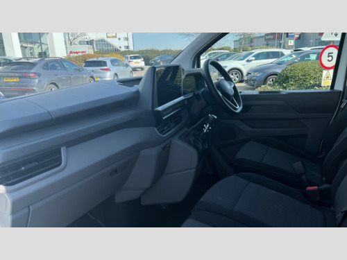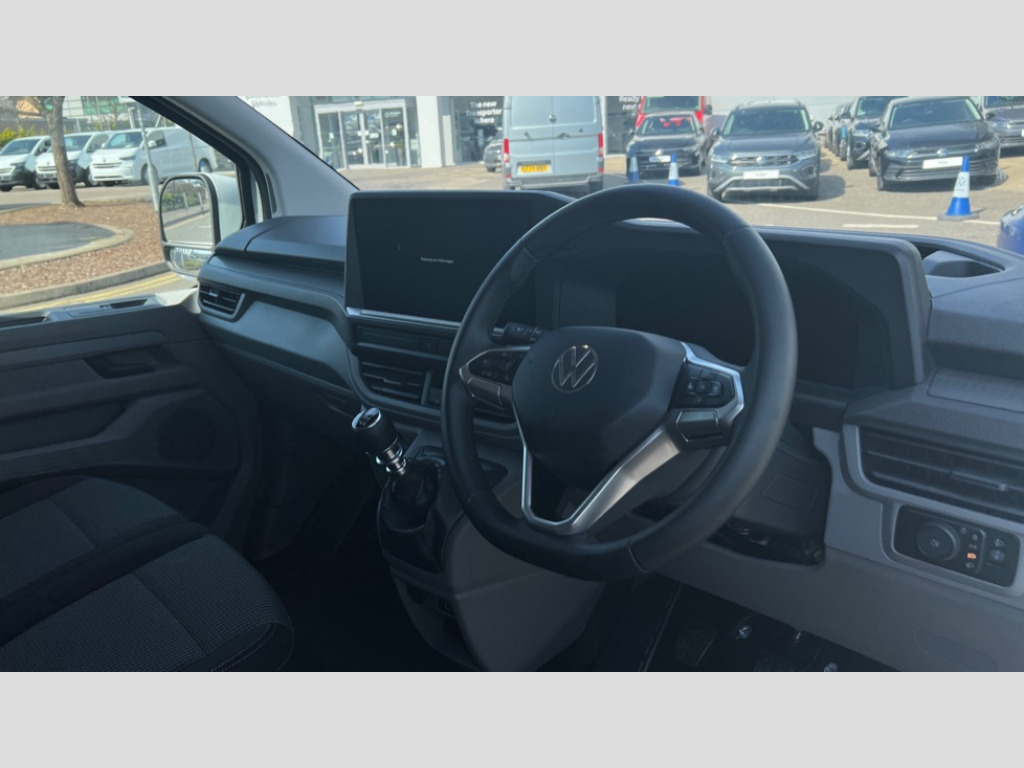 Volkswagen Transporter 2.0 TDI 150 Commerce Plus Van Auto 12" digital drivers display, 13" touchscreen infotainment display with wireless app connect and DAB radio, 5G Modem, Apple CarPlay and Android Auto, Cruise control, Dynamic road sign display, eCall emergency system, Electromechanical speed sensitive power steering, height and longitudinally adjustable steering column, Lane assist, Preparation of VW connect and connect plus, Wrong way driver warning, 4 speakers - 2x dashboard, 2x cab doors, Body coloured door handles, Heat reflecting side window glass, Mud flaps front and rear, Rear Transporter nameplate in black grained decorative trim, Vehicle opening configuration 1x 1st row of seats, 2x all doors, 2x 15-W USB data/charging ports in dashboard and 1x USB-C, 1x USB-A center bottom, 2x LED lights in load compartment, 3 spoke leather wrapped multi function steering wheel, 4 way height and tilt adjustable head restraints, Black plastic scuff plate for sliding door in cargo without illumination, Cabin interior lighting, Gear selector lever on steering wheel, Lashing rings for reinforced floor covering, Narrow centre console with cup holder and compartment for mobile phone, Overhead storage compartment, Roof grab handle on front passenger side, Rubber floor covering in cab, Striped fabric upholstery, Without passenger seats in load compartment, Driver and front passenger airbag with front passenger airbag deactivation, Dual tone horn, Front and curtain airbags for driver and front passenger, Seat belt pretensioner for driver seat, Anti theft alarm system with interior monitoring in cab, backup horn and towing protection, Electronic immobiliser, Preparation for alcohol ignition interlock, 5+ Promise, Alternator - 230A, Electronic stability control, ABS, ASR with deactivation button, hill start assist and brake assist system