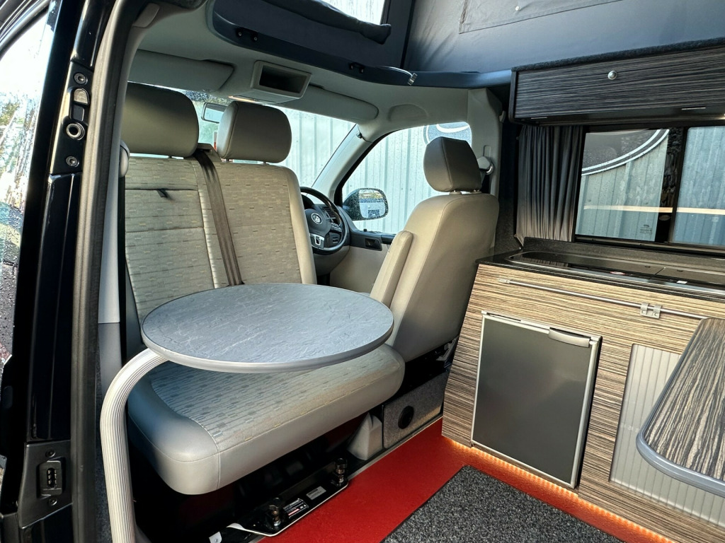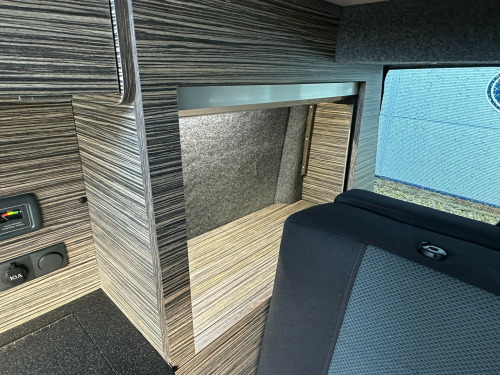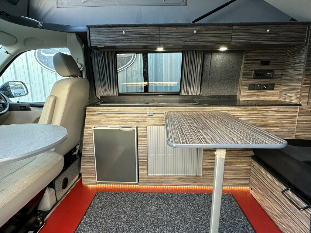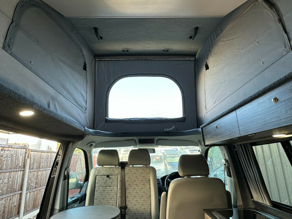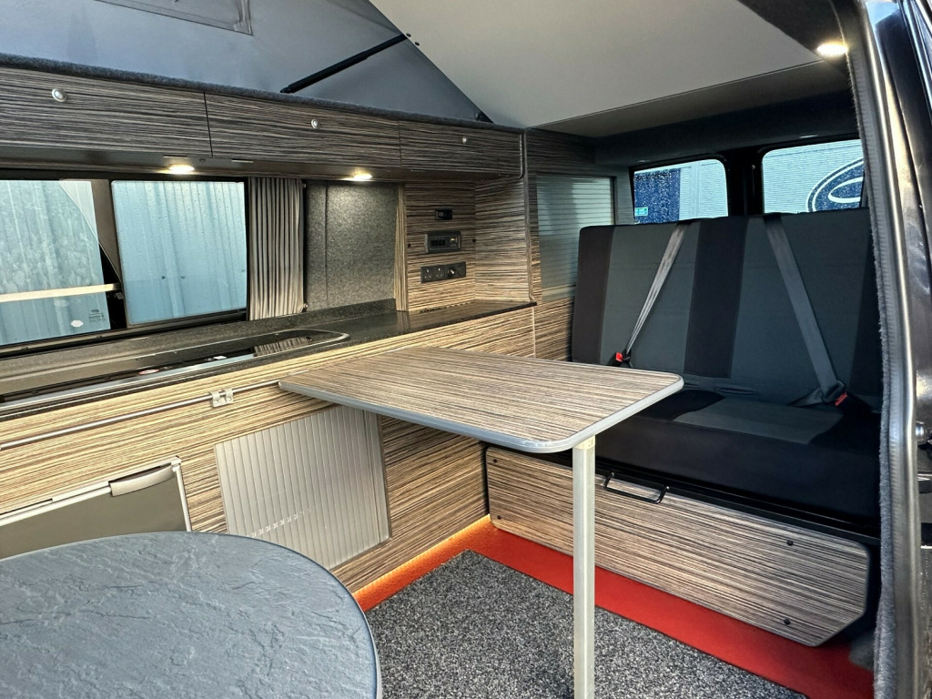 Great sporty looking LWB Camper made by Wessex.Nide half leather Black and red interior with side kitchen - HOB - SINK and FRIDGE , plenty of internal storage and rear barn door with table storage.rock ' n ' roll bed system along with a double swivel passenger seat which allows for extra storage and seating making this a 5 seater for traveling.Don't miss out call 01202 855531 Option 1 for Sales and speak to a member of the Sales Team!!!!!!!!!!!! '' We have attempted to make the above description as accurate as possible but please bear in mind that honest mistakes can happen so this description cannot form any part of any future contract. Some items fitted to models on display may be excluded from said contract' 0 mains & usb sockets, 4 berth, 5 seat belts, alloy wheels, barn doors, battery charger, cab aircon, camera, curtains, double swivel passenger seat, elevating roof, fresh water tank, fridge, gas hob, leisure battery, lovely original condition, lwb, mains hookup, plgv (under 3.5t), roof bed, sink