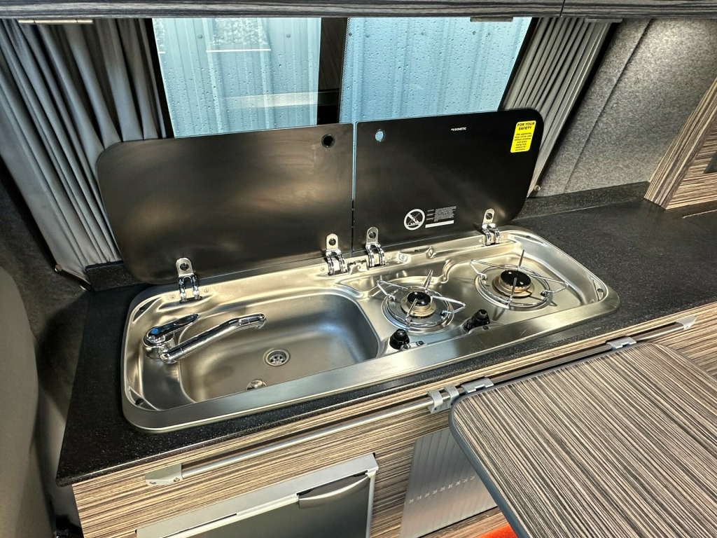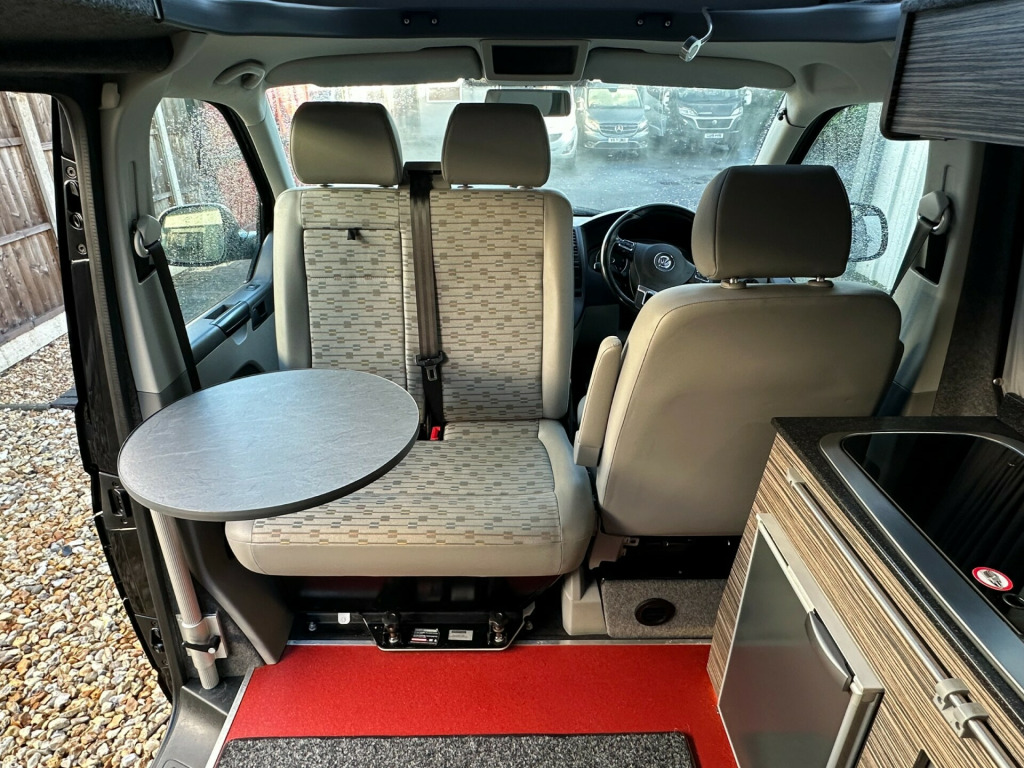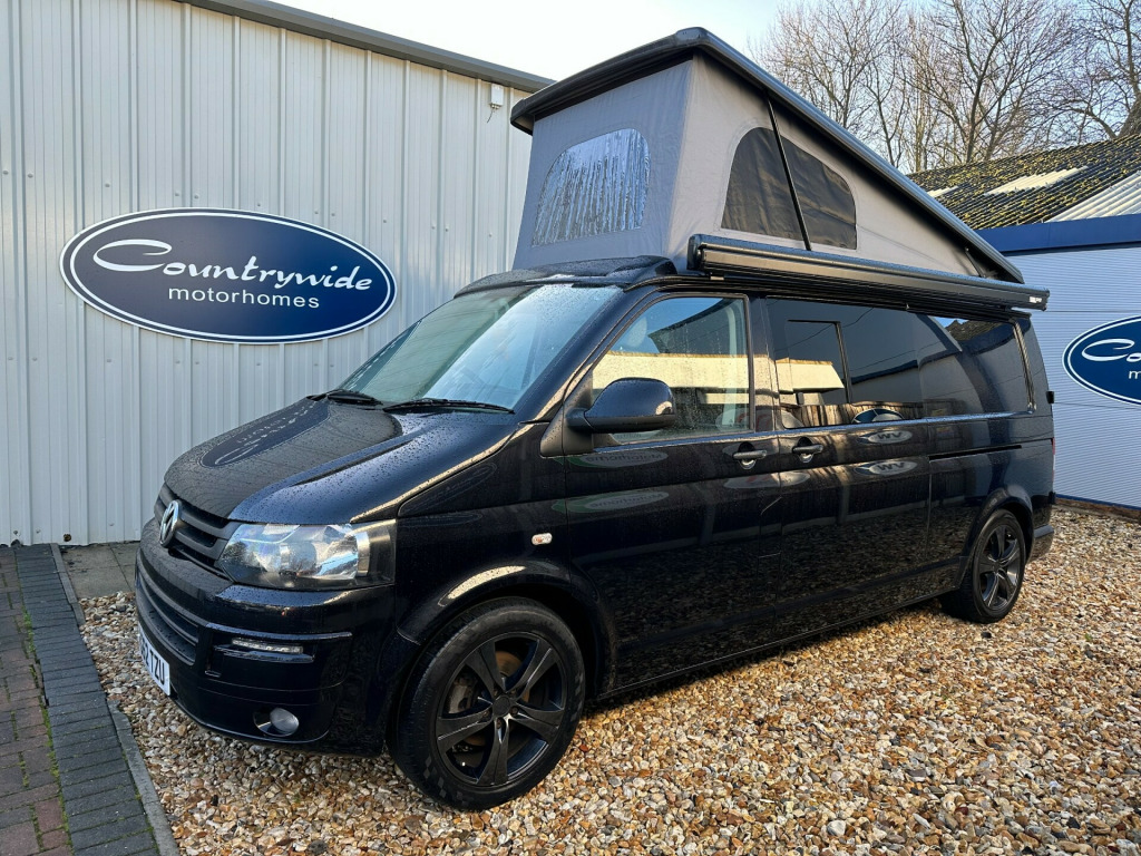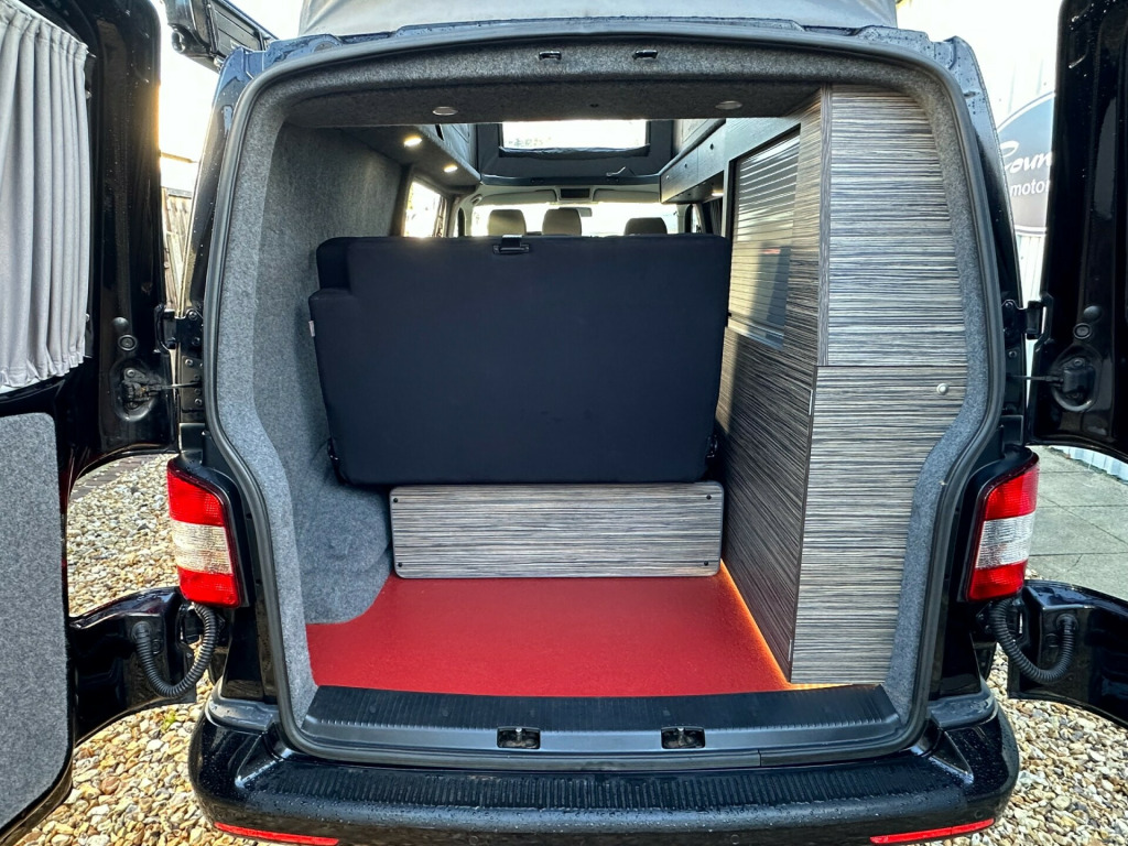 Great sporty looking LWB Camper made by Wessex.Nide half leather Black and red interior with side kitchen - HOB - SINK and FRIDGE , plenty of internal storage and rear barn door with table storage.rock ' n ' roll bed system along with a double swivel passenger seat which allows for extra storage and seating making this a 5 seater for traveling.Don't miss out call 01202 855531 Option 1 for Sales and speak to a member of the Sales Team!!!!!!!!!!!! '' We have attempted to make the above description as accurate as possible but please bear in mind that honest mistakes can happen so this description cannot form any part of any future contract. Some items fitted to models on display may be excluded from said contract' 0 mains & usb sockets, 4 berth, 5 seat belts, alloy wheels, barn doors, battery charger, cab aircon, camera, curtains, double swivel passenger seat, elevating roof, fresh water tank, fridge, gas hob, leisure battery, lovely original condition, lwb, mains hookup, plgv (under 3.5t), roof bed, sink