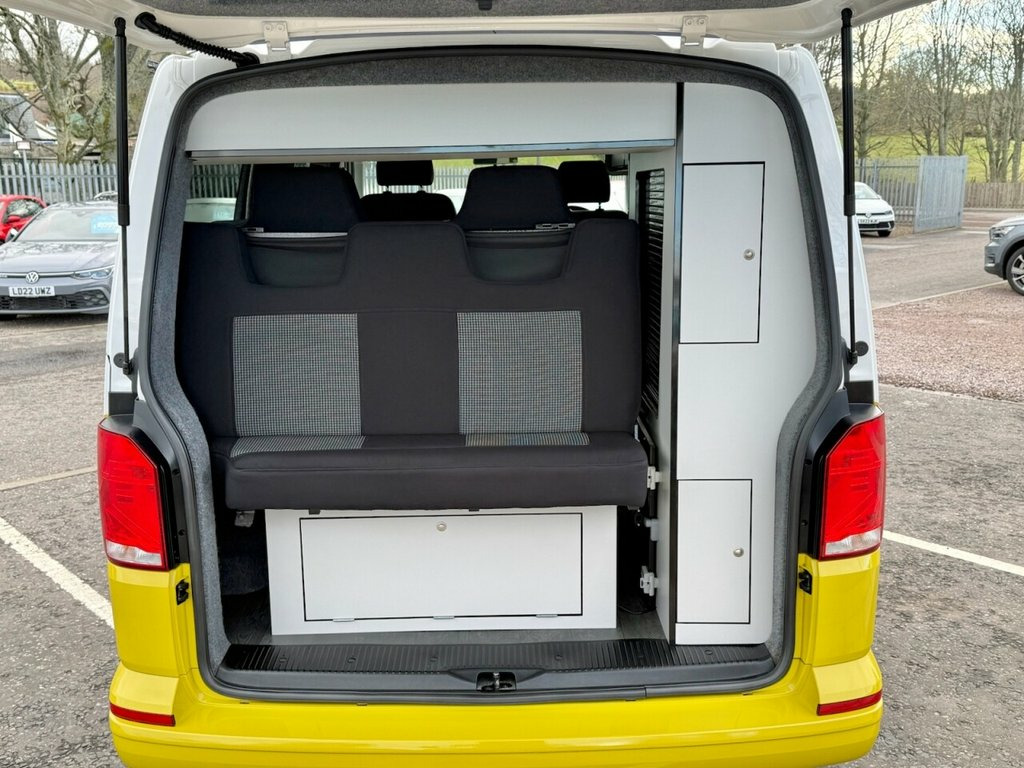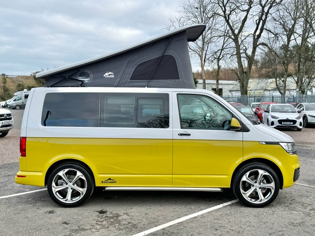 VOLKSWAGEN TRANSPORTER Xscape camper 2.0 TDI T30 Diesel Manual 110 bhp 4 berth ( POP TOP ROOF WITH DOUBLE BED, ELECTRIC REMOTE CONTROL ROCK N ROLL DOUBLE BED, 4 BERTH, 4 SEATBELTS, XSCAPE CAMPER BY WHITE ARCHES CONVERSION, PROPEX HEATING SYSTEM, END KITCHEN AREA, ) Comes in a upgrade stand out split Volkswagen grape yellow and pure white solid paint with matching contrast pop top roof, Upgrade 20 inch Volkswagen sports alloy wheels, Xscape camper body decals, Xscape camper body kit, Upgrade chrome side bars, Up and over tailgate, Power cable, Premium elevating roof with bed, Privacy glass, Electric windows, Electric adjustable wing mirrors, 5 speed manual gearbox, LED trip computer speedometer display, Central locking, Volkswagen black cloth pattern interior seats with contrast stitching throughout, 3 spoke leather steering wheel, Multi function steering wheel with cruise control, Volkswagen touch screen stereo unit, DAB radio, Bluetooth, AUX/USB ports, Swivel captain passenger seat, On board bespoke Xscape camper silver white units with grey stone matte worktops finished with stand out grape yellow inlays, Xscape camper carpeted rear walls, Xscape camper easy clean rear flooring, 2 burner gas hob and sink and tap, Small on board fridge with freezer department, On board grill, Water pump system with on board water tank, Full 12 and 240 volt electrical system, Propex heating system, Rear USB charging ports, Various storage cupboards, Van shade window screens, LED lighting thro 16in Steel Wheels - 20-Hole Style, ABS - Anti-Lock Braking System, ASR - Anti Slip Regulation, Allergen Filter, Armrest - Drivers, BAS - Brake Assist System, Basic Single Passenger Seat, Black Door Mirrors and Door Handles, Bumpers - Grey, Composition Colour DAB Plus Radio System, Crosswind Assist, Cruise Control with Speed Limiter, Dash Panel with Open Stowage Compartment, Dimming Breakaway Interior Rearview Mirr, Door Mirrors - Electrically Adjustable a, Driver Alert System, Drivers and Front Passengers Airbags wit, EDL - Electronic Differential Lock, ESP - Electronic Stability Programme, Electric Windows - Front, Electromechanical Speed Sensitive Power , Electronic Engine Immobiliser, Ele
