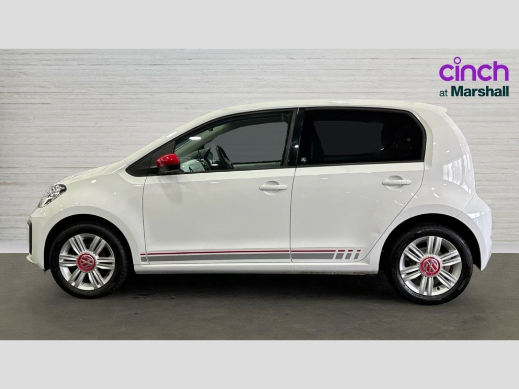 Volkswagen Up 1.0 75PS Up Beats 5dr 'Lights On' Reminder warning buzzer, Rev counter, Service interval indicator, Speed sensitive power steering, Trip computer, 6 speakers, Aux input, Composition colour media system Radio/CD/MP3 + Bluetooth, DAB digital radio module, SD card slot, Smartphone interface navigation with USB Connection, Body colour door handles, Body coloured bumpers, Chrome headlight surround, Daytime running lights, Electric front windows, Front wash/wipe with interval delay, Heat insulated tinted glass 65% light absorbing from B pillar back, Heated rear window, Range adjustable headlights, Rear windscreen washer and wiper with interval delay, 12V accessory power point in centre console, 2 cupholders, 3 spoke leather steering wheel/gearknob + handbrake grip, 60/40 split folding rear seat, Ambient lighting, Beats cloth upholstery, Chrome interior door handles, Delay courtesy light function, Driver seat height adjust, Driver's sunvisor with ticket holder, Front head restraints, Front/rear floor mats, Glovebox, Height adjustable rear head restraints, Height adjustable steering wheel, Isofix Preparation 2 Rear child seats, Luggage compartment cover, Luggage compartment lighting, Passenger sunvisor with illuminated vanity mirror, Storage compartment in front doors, Variable boot floor, 3 point height adj front seatbelts + pretensioners, ABS, Driver and passenger airbags, Driver/front passenger side airbags, ESP with EDL + ASR, Hill hold control, Hydraulic Brake Assist (HBA), Red seat belts, Seatbelt warning lamp and buzzer, Two 3 point rear seatbelts, Two tone horn, Tyre pressure warning, Anti-theft wheel bolts, Electronic engine immobiliser, Locking fuel filler cap, Remote central locking with 2 remote folding keys, 3D decorative inserts in dash, Chrome air vent surrounds, Chrome-plated light switch surround, 15" Radial alloy wheels, Tyre mobility system