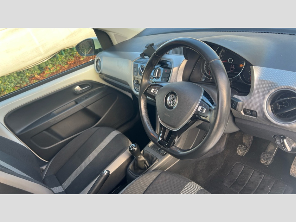 Volkswagen Up 1.0 High Up 5dr 'Lights On' Reminder warning buzzer, Multi function computer, Rev counter, Service interval indicator, Speed sensitive power steering, 6 speakers, Aux input, Composition colour media system Radio/CD/MP3 + Bluetooth, DAB digital radio module, SD card slot, Smartphone interface navigation with USB Connection, Body colour door handles, Body coloured bumpers, Chrome headlight surround, Daytime running lights, Electric front windows, Front wash/wipe with interval delay, Heated rear window, Range adjustable headlights, Rear windscreen washer and wiper with interval delay, 12V accessory power point in centre console, 2 cupholders, 60/40 split folding rear seat, Ambient lighting, Chrome interior door handles, Delay courtesy light function, Driver seat height adjust, Driver's sunvisor with ticket holder, Front head restraints, Glovebox, Height adjustable rear head restraints, Height adjustable steering wheel, Isofix Preparation 2 Rear child seats, Luggage compartment cover, Luggage compartment lighting, Multifunction leather steering wheel with leather gear knob/handbrake grip, Passenger sunvisor with illuminated vanity mirror, Storage compartment in front doors, Variable boot floor, Winter pack - Up, 3 point height adj front seatbelts + pretensioners, ABS, Driver and passenger airbags, Driver/front passenger side airbags, ESP with EDL + ASR, Hill hold control, Hydraulic Brake Assist (HBA), Seatbelt warning lamp and buzzer, Two 3 point rear seatbelts, Two tone horn, Tyre pressure warning, Anti-theft wheel bolts, Electronic engine immobiliser, Locking fuel filler cap, Remote central locking with 2 remote folding keys, Chrome air vent surrounds, Chrome-plated light switch surround, Full size steel spare wheel