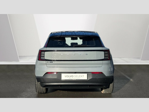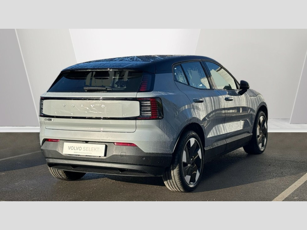 Whiplash injury protection, Inflatable Curtain, Rain sensor, NFC smart card key, Front load compartment, Over-the-air updates (OTA), Pedestrian and cyclist steering avoidance, Volvo EX30 App, Google Assistant. Google Maps and Google Play Store, Flexible load floor, Tailored sports steering wheel, Oncoming Lane Mitigation, Oncoming Mitigation by Braking, Intersection autobrake, Textile interior cabin floor mats, Large door pockets, Front storage, Removable rear storage box, Rear phone storage, Advanced sensing technology, Comfort chassis, Blind Spot Information System (BLIS), Charging station cable. 5m (22kW), 5 seats, Roof spoiler. high-gloss black, Door opening alert, Shift-by-wire single speed transmission, Rear-wheel drive (RWD), LED headlights with active high beam, Heat pump, LED headlights, Rear LED lights, Front and rear USB-C ports, Two-zone climate system, Seat track position sensors. driver and passenger, Air quality system, Air quality measurement and remote cabin air pre-cleaning, Post impact braking, Hill Start Assist, Speed limiter, Hill Descent Control, Manually adjustable driver seat, Manually adjustable passenger seat, Heated front seats, Fixed lumbar support, Textile & Nordico upholstery, Ambience themes, Interior illumination. high level, Temporary mobility kit, Summer tyres, 19? 5-spoke glossy black diamond cut, 5G capability, Collision avoidance and mitigation, Adaptive cruise control, Auto-dimmed inner and door mirrors, One pedal drive, Driver alert system, Lane Keeping Aid, Intelligent Speed Assist (ISA), Humidity sensor, Digital key plus, Power tailgate, Passenger airbag cut-off switch, Park assist. front and rear, Heated steering wheel, Alarm, Lane Departure Warning, Door mirror covers. high-gloss black, Child safety lock, Park assist camera. rear, Traffic Jam Assist, Double lock, Roof top. high-gloss black, Direct occupant sensing, Digital Audio Broadcasting (DAB+), Wireless Apple CarPlay and Android Auto, 12.3-inch centre display, Harman Kardon Premium Sound, Wireless phone charging, Key tag, Power outlet. load compartment, Driver airbag, Side impact protection, Dual-stage airbags. passenger, First-aid kit, Denim decor, Air vent decor. blue, Vanity mirrors, Warning triangle, Fog lamps. rear, LED illumination. load compartment, ISOFIX child seat attachment, Sliding cupholders and storage, Lane change assist, Rear Collision Warning, Rear Cross Traffic Alert with Autobrake, 11kw On-Board Charger (OBC), Road Sign Information, Alcohol lock software (not available in the UK), Door mirrors with ground lighting, Pilot Assist, Front Cross Traffic Alert, Run-off Road Mitigation, Flat-folding two-split rear seat, This car comes fully prepared under the Volvo Selekt programme so call us on 01962 881 414 to arrange a viewing or a personalised video walk around to watch from the comfort of your home!