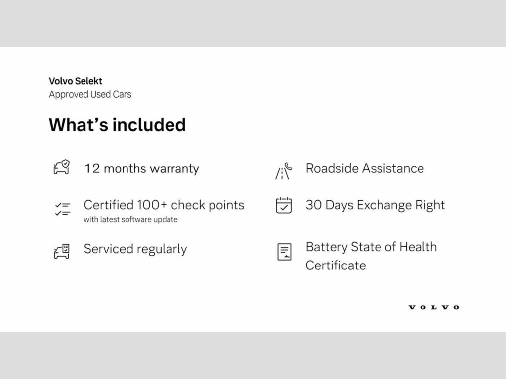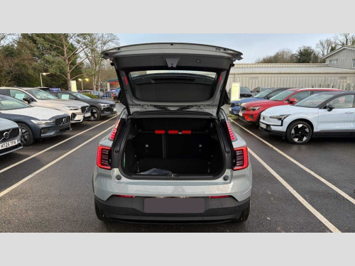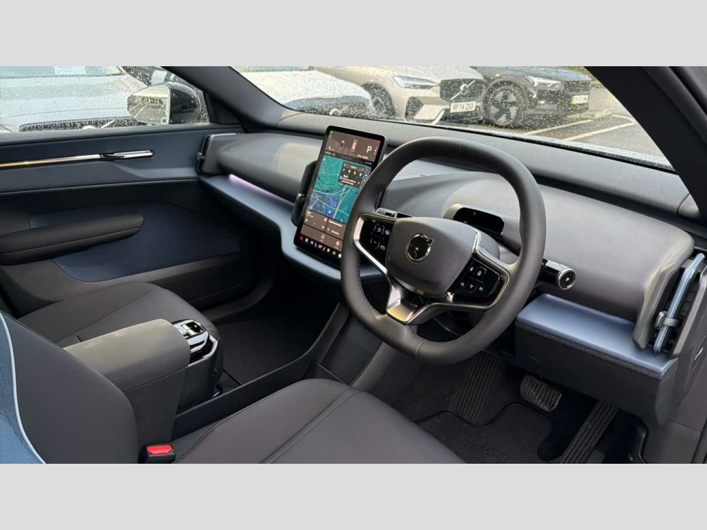Whiplash injury protection, Inflatable Curtain, Rain sensor, NFC smart card key, Front load compartment, Over-the-air updates (OTA), Pedestrian and cyclist steering avoidance, Volvo EX30 App, Google Assistant. Google Maps and Google Play Store, Flexible load floor, Tailored sports steering wheel, Oncoming Lane Mitigation, Oncoming Mitigation by Braking, Intersection autobrake, Textile interior cabin floor mats, Large door pockets, Front storage, Removable rear storage box, Rear phone storage, Advanced sensing technology, Comfort chassis, Blind Spot Information System (BLIS), Charging station cable. 5m (22kW), 5 seats, Roof spoiler. high-gloss black, Door opening alert, Shift-by-wire single speed transmission, Rear-wheel drive (RWD), LED headlights with active high beam, Heat pump, LED headlights, Rear LED lights, Front and rear USB-C ports, Two-zone climate system, Seat track position sensors. driver and passenger, Air quality system, Air quality measurement and remote cabin air pre-cleaning, Post impact braking, Hill Start Assist, Speed limiter, Hill Descent Control, Manually adjustable driver seat, Manually adjustable passenger seat, Heated front seats, Fixed lumbar support, Textile & Nordico upholstery, Ambience themes, Interior illumination. high level, Temporary mobility kit, Summer tyres, 19? 5-spoke glossy black diamond cut, 5G capability, Collision avoidance and mitigation, Adaptive cruise control, Auto-dimmed inner and door mirrors, One pedal drive, Driver alert system, Lane Keeping Aid, Intelligent Speed Assist (ISA), Humidity sensor, Digital key plus, Power tailgate, Passenger airbag cut-off switch, Park assist. front and rear, Heated steering wheel, Alarm, Lane Departure Warning, Door mirror covers. high-gloss black, Child safety lock, Park assist camera. rear, Traffic Jam Assist, Double lock, Roof top. high-gloss black, Direct occupant sensing, Digital Audio Broadcasting (DAB+), Wireless Apple CarPlay and Android Auto, 12.3-inch centre display, Harman Kardon Premium Sound, Wireless phone charging, Key tag, Power outlet. load compartment, Driver airbag, Side impact protection, Dual-stage airbags. passenger, First-aid kit, Denim decor, Air vent decor. blue, Vanity mirrors, Warning triangle, Fog lamps. rear, LED illumination. load compartment, ISOFIX child seat attachment, Sliding cupholders and storage, Lane change assist, Rear Collision Warning, Rear Cross Traffic Alert with Autobrake, 11kw On-Board Charger (OBC), Road Sign Information, Alcohol lock software (not available in the UK), Door mirrors with ground lighting, Pilot Assist, Front Cross Traffic Alert, Run-off Road Mitigation, Flat-folding two-split rear seat, This car comes fully prepared under the Volvo Selekt programme so call us on 01962 881 414 to arrange a viewing or a personalised video walk around to watch from the comfort of your home!