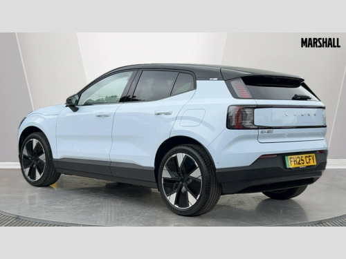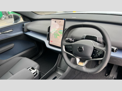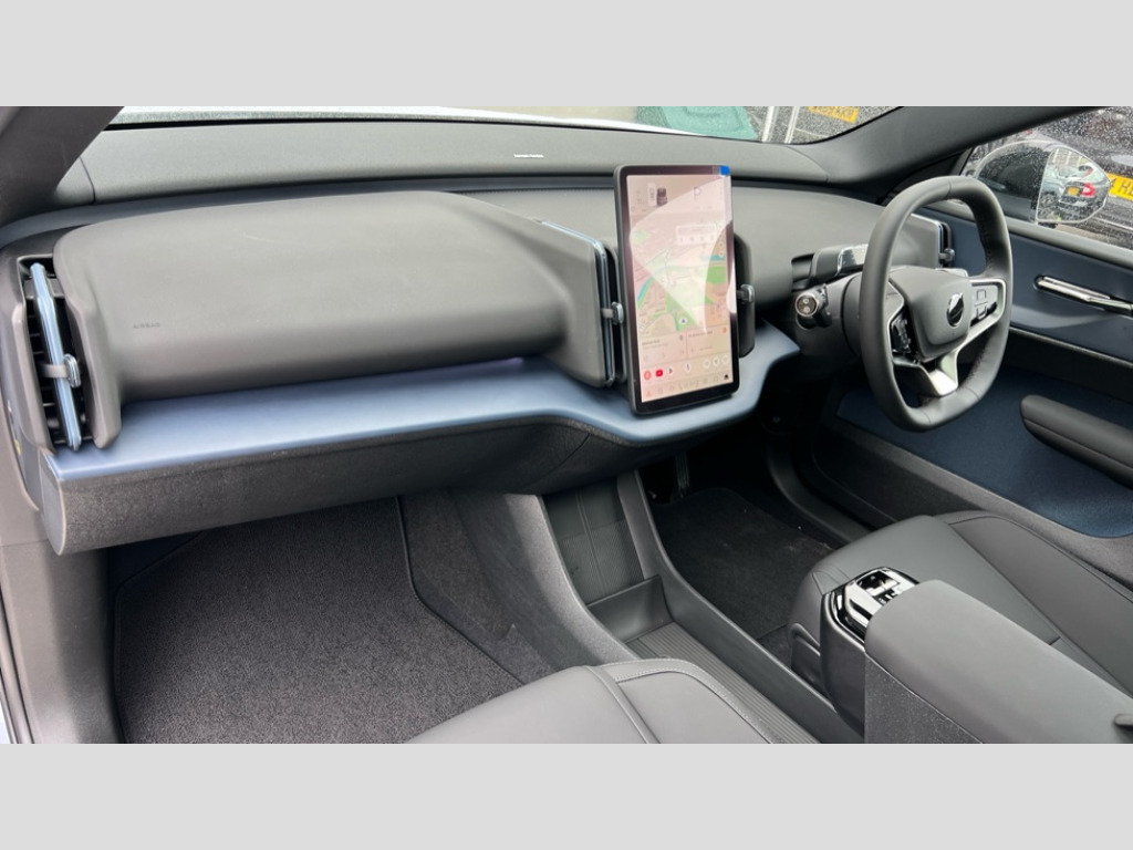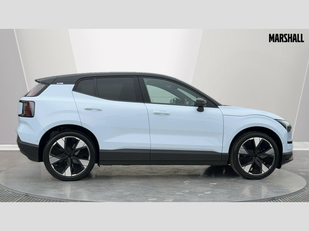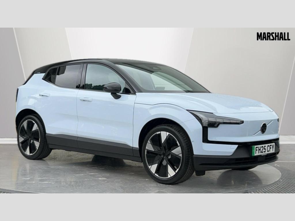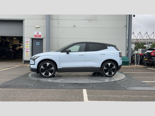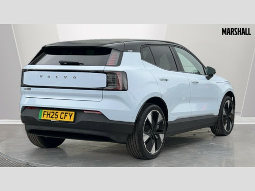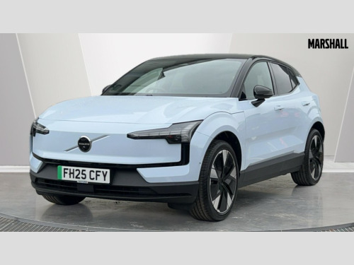 Volvo EX30 200kW SM Extended Range Ultra 69kWh 5dr Auto 12.3" centre console portrait touch screen, 3 x Front and 2 x rear radars plus front vision camera, 360 Degree camera with virtual 3D view, Adaptive cruise control, Android auto wireless, Blind spot information system with steer assist (BLIS), Bluetooth handsfree system, Collision avoidance at intersection, Cross traffic alert with brake support (Front and Rear), Driver alert control with lane keeping aid, Driver understanding system, Emergency call service, Forward collision warning, Front and rear park assist, Google automotive services - Enabled entertainment apps, navigation with google maps, voice recognition with google assistant, Intelligent speed assist, Park pilot assist, PAS, Power operated tailgate, Speed limiter, Volvo cars services with app, Wireless apple carplay, Wireless/Inductive Mobile Phone Charging, 3-Phase On Board Charger - 22kW, 5m 3 phase 32 amp type 2 / mode 3 charge cable, Comfort chassis, Plug and charge, Recharging port located in nearside rear wing, DAB Digital radio, Dirac unison, External couple subwoofer and load compartment subwoofer, Harman Kardon Premium 5.1 Surround Sound 1040W - (2xC type USB Front & rear Sockets,Dashboard Soundbar with 7 Speakers), Low speed exterior sound speaker, Quantum logic, Vehicle noise compensation, Auto dimming interior and driver's door mirror, Auto folding heated frameless power door mirrors, Automatic LED Headlights + Active high beam incorporating daytime running lights, Dark tinted windows - rear side windows and rear screen, Dual tone roof and mirror caps, Fixed panoramic glass sunroof, LED 3rd brake light, Metallic paint, Puddle lights, Rain sensor with automatic windscreen wiper activation, Rear side wing doors, Rear wiper, Variable intermittent wiper, 12V socket in luggage compartment, 2 zone electronic climate control with air purifier PM2.5, 3 seat bench in 2nd row, Central glovebox and storage, Fixed lumbar support, Flexible load floor, Floor mats, Front cupholders and storage, Front head restraints, Front load compartment (19 litres), Heat pump (Enhanced cabin heating and cooling efficiency with optimal vehicle range), Height/reach adjustable steering column, High level illumination (choise of 5 colour themes,central tunel,luggage,puddle,cabin,reading and front door panel pocket lights,instrument panel ), ISOFIX attachment on outer rear seats, Multifunction steering wheel, One pedal drive, Removable rear headrests, Single front passenger seat, Vehicle 2 load capability, Versatile split folding rear seat - 60/40, Climate pack - EX30, Power seat pack - EX30, 3 point rear seatbelts, Child locks on rear doors, Collision avoidance and mitigation by braking and steering, Door opening alert, Driver and passenger airbags, First aid kit, Hill descent control, Hill start assist, IC (Inflatable Curtains) - Full Length, Inner driver seat side airbag, Passenger airbag cut-off switch, Post-impact Braking, Rear collision warning and mitigation (RCWM), Road sign information display, Run off Road Mitigation, Seatbelt pretensioners and load limiters (Front and Outer Rear Seats), SIPS (Side Impact Protection System), Tyre pressure monitoring system, Warning triangle, WHIPS whiplash protection system - front, 2 x NFC Access cards, Anti-theft alarm including immobiliser/volume sensor + level sensor, Digital key plus with keytag, Locking wheel nuts, Remote door locking and unlocking, Tyre sealant kit and compressor
