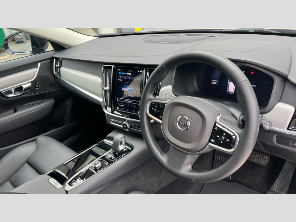 Volvo V90 2.0 T6 [350] PHEV Plus Dark 5dr AWD Auto 12.3" Progressive Driver Display, 360 degree surround view parking camera with side proximity sensors, 9" centre console touch screen, Adjustable steering wheel force, Apple CarPlay and Android Auto, Bluetooth handsfree system, Drive mode settings, Driver alert control with lane keeping aid, Driver assistance (pilot assist and adaptive cruise control), Driver awareness - Blind spot system + steer assist, cross traffic alert with autobrake, rear collision warning and mitigation, E-call, Emergency assist, Front and rear park assist, Google automotive services - Enabled entertainment apps, navigation with google maps, voice recognition with google assistant, Handsfree bootlid opening/closing, Intelligent speed assistance, Oncoming Lane Mitigation, Power operated tailgate/boot lid, Speed sensitive steering, Volvo on call app, 6m 3 phase 16amp Type 2 / mode 3 charge cable, 7m 10amp charge cable with 3 pin plug, 8 speed automatic transmission with start/stop + manual change functions, Dynamic chassis, Electric rear axle drive, Lithium-Ion Battery 18.8kWh, On board charger - 6.4 kW 2 phase/3.7kW single phase, Recharging port located in nearside front wing, DAB Radio (Digital Audio Broadcasting), Low speed exterior sound speaker, Premium Sound by Harman Kardon, dirac unison, dolby pro logic II surround sound, 13 speakers/600W output and fresh air subwoofer, Steering wheel remote infotainment controls, Adaptive brake lights with high level LED brake lights, Auto dimming interior + exterior mirrors, Automatic headlight levelling system, Automatic LED Headlights + Active high beam incorporating daytime running lights, Front and rear power windows, Heated windscreen, High gloss black door mirrors and window surround, High gloss black front and rear bumper decoratives, High gloss black mesh front grille and surround, Home safe and approach lighting, Integrated roof rails in high gloss black, Puddle lights, Rain sensor with automatic windscreen wiper activation, Rear LED lights with sequential indicators, Rear side wing doors, Rear wiper, Roof antenna, Roof spoiler, Variable front intermittent wipers, Visible VIN plate, 2 zone electronic climate control with Clean zone air quality system + pollen filter, 3 seat bench in 2nd row, 3 Spoke tailored steering wheel with chrome trim, Air purifier particulate matter (PM) 2.5 filter, Ambient door and instrument panel lighting, B Pillar ventilation, Boot lid/tailgate illumination, Bright metal luggage scuff plate, Cargo divider with grocery bag holder, Centre console cupholder and storage, Charcoal carpets and floor mats, Driver and front passenger seat power height adjustment, Extended front seat cushions, Front 12V socket tunnel console and cargo area, Front and rear cabin courtesy light, Front and rear door pocket lights, Front and rear footwell and side step illumination, Front and rear reading lights and centre armrest Storage Illumination, Front headrests, Glovebox compartment with illumination, Heated front seats, Heated rear seats outer positions, Heated steering wheel, Height/reach adjustable steering column, Illuminated luggage compartment, Illuminated recharge aluminium tread plates, Illuminated vanity mirrors + ticket holder, Inner door release handle illumination, Integrated sun curtains in rear doors, ISOFIX attachment on outer rear seats, Leather upholstery, Load cover, Load protection net, Luggage compartment load hooks, Memory function for drivers seat and exterior mirrors, Multi directional lumbar support, Power folding rear headrests, Rear armrest with cupholder, Single front passenger seat, Underfloor cargo storage, Versatile split folding rear seat - 60/40, 3x3 point rear seatbelts, Active bonnet, City safety with steering support with Pedestrian + cyclist + front collision warning with full auto brake and rear auto brake, Driver and front passenger airbags, Drivers knee airbag, Front seats SIPS airbags, Hill start assist, IC (Inflatable Curtains) - Full Length, Passenger airbag cut-off switch, Power child locks on rear doors, Power parking brake with auto hold function, Road sign information display, Run off Road Mitigation, Run off Road Protection, Seatbelt reminder and pretensioners for all seats, SIPS (Side Impact Protection System), Slippery road and hazard light alert, Stability and Traction Control with Spin control, Engine Drag Control and Corner Traction Control, Tyre pressure monitoring system, Vehicle deceleration control with Anti-lock Brake System, Electronic Brake Distribution and Emergency Brake Assist, Warning triangle and first aid kit, WHIPS whiplash protection system - front, 2x Key integrated remote control central locking + fuel flap with deadlocking system and auto open/close power windows, Anti-theft alarm including immobiliser/volume sensor + level sensor, Care key with user defined top speed, Keyless drive includes keyless entry and keyless start, Locking wheel nuts, Private locking for tailgate, Tailored Instrument Panel and Door Tops with Contrast Stitching, 19'' 8 spoke diamond cut black alloy wheels, Tyre sealant kit and compressor