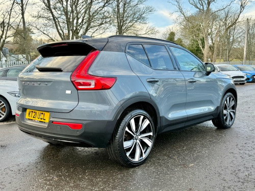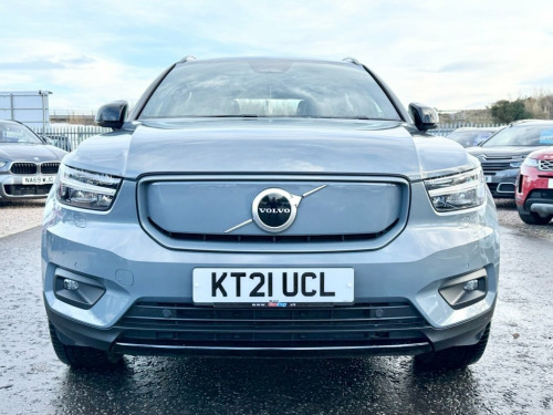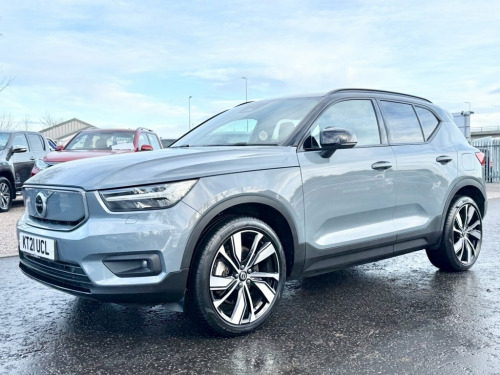The 2021 Volvo XC40 Recharge Twin P8 is a premium fully electric SUV offering exceptional performance, refinement and cutting-edge technology. Its dual-motor setup delivers an impressive 408 bhp, giving instant acceleration and effortless power in all conditions, supported by all-wheel drive for added confidence. The 78kWh battery provides strong real-world driving range and fast-charging capability, making it ideal for both daily commuting and longer trips. Inside, the XC40 Recharge offers a modern, high-quality cabin with minimalist Scandinavian design. It features a crisp digital driver display, Google-built-in infotainment with navigation, voice control and seamless smartphone integration. Comfort is excellent thanks to supportive seating, premium materials and clever interior storage, while the boot provides practical space for family use and travel. Volvo's reputation for safety is fully present, with advanced systems such as lane-keeping aid, adaptive cruise control, pilot assist, collision avoidance, 360° parking camera options and high-strength body engineering. The drive is smooth, quiet and refined, giving a genuinely premium electric-SUV experience. A powerful, practical and highly advanced EV that blends performance, luxury and everyday usability. Connect Textile-Microtech - Charcoal, Harman Kardon Premium Sound, Park Assist Package, 20" 5 V Spoke (Diamond Cut/Matt Gra, Climate Pack, Power Glass Tilt and Slide Panoramic Sun, Driver Assist Pack, 12.3 Progressive Driver Display, 12V Socket - Front Tunnel Console and Ca, 19in Alloy Wheels - 5 Spoke - Diamond Cu, 2-Zone Electronic Climate Control with R, 3-Spoke Tailored Sports Steering Wheel, 7m 10amp Charge Cable with 3-Pin Plug an, 9in Centre Console Portrait Touch Screen, A-Pillar Parking Ticket Holder, Adaptive Brake Lights including High Lev, Adjustable Steering Force, Anti-Theft Alarm including Immobiliser -, Autodimming Interior Mirror, Autofolding Heated Power Door Mirrors,