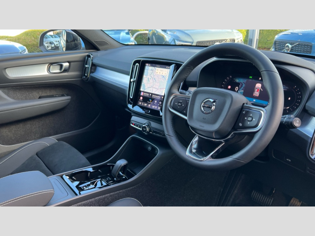 Volvo XC40 2.0 B4P Plus Black Edition 5dr Auto 12.3" Progressive Driver Display, 9" centre console portrait touch screen, Adjustable steering wheel force, Android auto (Wired), Apple carplay (wired), Bluetooth handsfree system, Driver alert control, Driver assistance (pilot assist and adaptive cruise control), Driver awareness - Blind spot information system with steer assist, cross traffic alert with autobrake and rear collision warning and mitigation, E-call, Front and rear parking sensors, Front park assist, Google automotive services - Enabled entertainment apps, navigation with google maps, voice recognition with google assistant, Hands free power tailgate, Intelligent speed assistance, Lane keeping aid, Oncoming Lane Mitigation, Speed sensitive steering, Volvo cars services with app - Driving journal, emergency and breakdown call, engine remote start, remote door locking/unlocking and vehicle dashboard, Wireless/Inductive Mobile Phone Charging, Automatic transmission with start/stop and manual change functions, Dynamic chassis, DAB Digital radio, Steering wheel mounted remote controls, Adaptive brake lights with high level LED brake lights, Auto dimming feature for exterior door mirrors, Auto dimming interior mirror, Auto folding and heated power door mirrors, Automatic headlamp levelling, Automatic LED Headlights + Active high beam incorporating daytime running lights, Dark tinted windows - rear side windows and rear screen, Front aluminium tread plates, Front and rear electric windows, High gloss black front and rear skid plate, High gloss black front bumper deco, High gloss black front grille strikethrough and ironmark, High gloss black rear model, engine and volvo logo badges, High gloss black window trim, Home safe and approach lighting, Integrated roof rails in high gloss black, LED front fog lights, Puddle lights, Rain sensor with automatic windscreen wiper activation, Rear side wing doors, Rear wiper, Roof antenna, Roof spoiler, Visible VIN plate, 12V socket in front tunnel console and luggage compartment, 2-Zone electronic climate control with CleanZone air quality system and pollen filter, 3 seat bench in 2nd row, 3 Spoke tailored steering wheel with chrome trim, 60/40 versatile split folding rear seat, Centre console cupholders and storage, Charcoal carpet and floor mats, Charcoal headlining, Connect suede textile/microtech upholstery, Flexible load floor and grocery bag holder, Front headrests, Front seat cushion extensions, Glovebox bag hook, Heated front seats, Height adjustable passenger seat, Height/reach adjustable steering column, High gloss centre tunnel deco, High level illumination - Front door pocket, front side step (under door), tailgate, instrument panel, front door inlay, rear courtesy&reading lights, Integrated waste bin, Isofix attachments on outer rear seats, Load cover, Load protection net, Mid level illumination - Front footwell, luggage & glovebox compartment,front cabin courtesy & reading lights,illuminated vanity mirrors+ticket holder, Multi directional lumbar support for driver and passenger seat, Power driver seat with memory + exterior mirrors memory, Rear armrest with cupholders, Rear headrests, Single front passenger seat, Underfloor luggage compartment storage, Climate pack without heated front seats - XC40, 3x3 point rear seatbelts, City safety with steering support with Pedestrian + cyclist + front collision warning with full auto brake and rear auto brake, Driver and passenger airbags, Drivers knee airbag, Electronic parking brake with auto hold, First aid kit, Front and outer rear seatbelt reminder and pretensioners, Front seats SIPS airbags, Hill descent control - Off-road drive mode, Hill start assist, IC (Inflatable Curtains) - Full Length, Passenger airbag cut-off device, Power child locks on rear doors, Road sign information display, Run off Road Protection, SIPS (Side Impact Protection System), Slippery road and hazard light alert, Stability and Traction Control with Spin control, Engine Drag Control and Corner Traction Control, Tyre pressure monitoring system, Vehicle deceleration control with Anti-lock Brake System, Electronic Brake Distribution and Emergency Brake Assist, Warning triangle, WHIPS whiplash protection system - front, 2 x Key integrated remote control central locking including with deadlocking system and auto open/close windows, Anti-theft alarm including immobiliser/volume sensor + level sensor, Keyless drive includes keyless entry and keyless start, Locking wheel nuts, 20" 5 spoke high gloss black alloy wheels