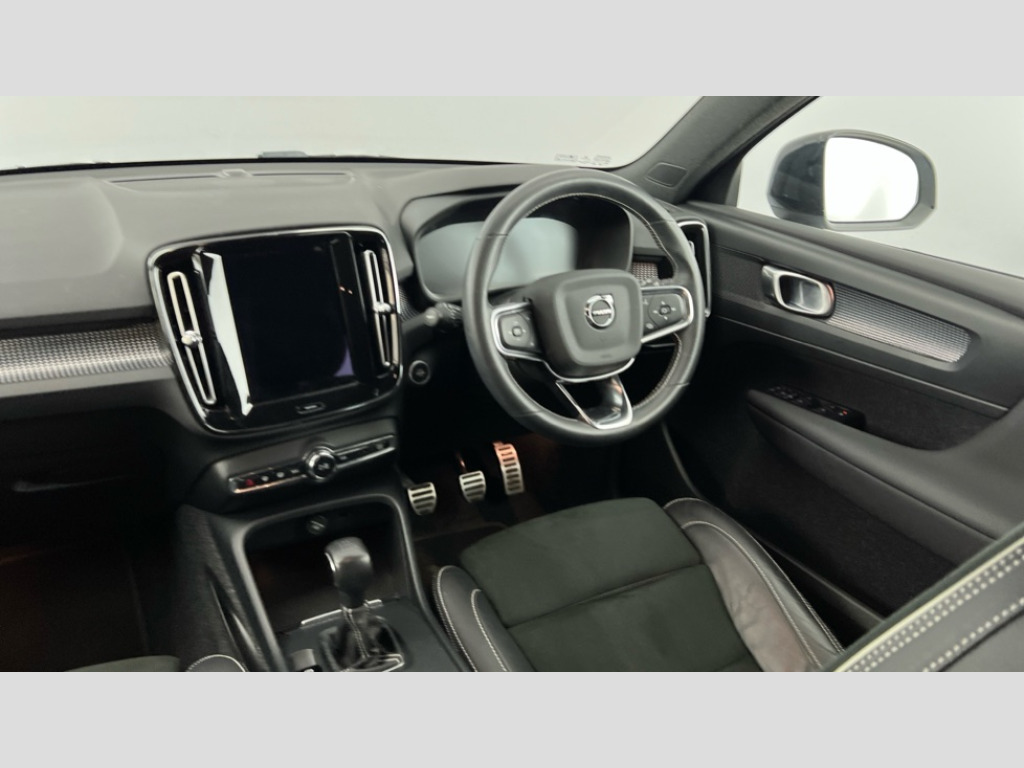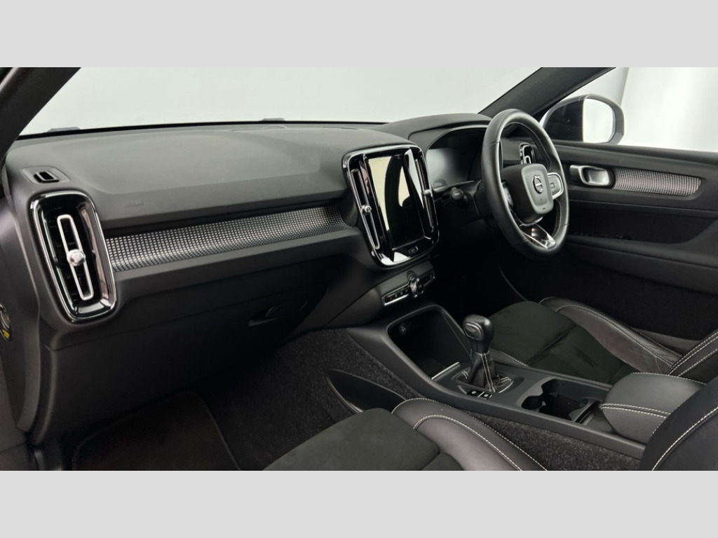 Volvo XC40 1.5 T3 [163] R DESIGN 5dr 12.3" Active TFT crystal driver's instrument display, 9" centre console portrait touch screen, Adjustable steering wheel force, Bluetooth hands free telephone kit, Drive mode selector, Lane keep assist with driver alert control, Oncoming Lane Mitigation, Power operated tailgate, Sensus navigation with European mapping and traffic information, Speed limiter, Speed sensitive steering, Voice activated control for key functions, Volvo on call, Sports chassis, DAB Digital radio, Steering wheel mounted remote controls, Adaptive brake lights with high level LED brake lights, Auto dimming interior mirror, Automatic headlamp levelling, Black stone door mirrors, Black stone roof, Colour coordinated auto folding and heated power door mirrors, Dark tinted windows for rear door side windows and cargo compartment, Dual integrated exhaust pipes with high gloss black surround, Front aluminium tread plates, Front and rear electric windows, High gloss black front and rear skid plate, High gloss black lower front bumper, High gloss black mesh front grille with high gloss black surround, High gloss black roof rails, High gloss black sensus surround deco, High gloss black window trim, Home safe and approach lighting, LED Headlights + Active high beam incorporating daytime running lights, Rain sensor with automatic windscreen wiper activation, Rear side wing doors, Rear wiper, Roof antenna, Roof spoiler, Visible VIN plate, 12V socket in front tunnel console and luggage compartment, 2 zone electronic climate control and rear air vent, 3 seat bench in 2nd row, 60/40 versatile split folding rear seat, A-pillar parking ticket holder, Centre console cupholders and storage, Charcoal headlining, Driver's side lower dashboard credit card storage compartment, Front footwell illumination, Front headrests, Front reading light and theatre lighting, Front seat cushion extensions, Glovebox bag hook, Height/reach adjustable steering column, Illuminated glovebox, Illuminated luggage compartment, Illuminated vanity mirrors, Isofix attachments on outer rear seats, Key integrated remote, Leather gearknob, Load protection net, Multi directional lumbar support, Rear armrest / integral cup holders / storage tray, Rear coat hook, Single front passenger seat, Sports floor mats, Sports pedals, Sports tailored steering wheel, Underfloor cargo storage, 3x3 point rear seatbelts, City safety includes pedestrian, cyclist and large animal detection and front collision warning with full auto brake, Drivers knee airbag, Dual stage driver/passenger airbags, Electronic parking brake with auto hold, First aid kit, Front and outer rear seatbelt reminder and pretensioners, Front seats SIPS airbags, Hill descent control, Hill start assist, Inflatable curtain, Passenger airbag cut-off device, Road sign information display, Run off Road Mitigation, Run off Road Protection, SIPS (Side Impact Protection System), Slippery road and hazard light alert, Stability and Traction Control with Spin control, Engine Drag Control and Corner Traction Control, Tyre pressure monitoring system, Vehicle deceleration control with Anti-lock Brake System, Electronic Brake Distribution and Emergency Brake Assist, Warning triangle, WHIPS whiplash protection system - front, Anti-theft alarm including immobiliser/volume sensor + level sensor, Care key with user defined top speed, Key integrated remote control central locking + fuel flap with deadlocking system and auto open/close power windows, Locking wheel nuts, Private locking for tailgate, Cutting edge aluminium inlay, Lower dashboard, tunnel console and door panel in charcoal