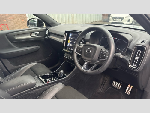 Volvo XC40 1.5 T3 [163] R DESIGN 5dr Geartronic 12.3" Active TFT crystal driver's instrument display, 9" centre console portrait touch screen, Adjustable steering wheel force, Bluetooth hands free telephone kit, Drive mode selector, E-call, Lane keep assist with driver alert control, Oncoming Lane Mitigation, Power operated tailgate, Sensus navigation with European mapping and traffic information, Speed limiter, Speed sensitive steering, Voice activated control for key functions, Volvo on call, Sports chassis, DAB Digital radio, Steering wheel mounted remote controls, Adaptive brake lights with high level LED brake lights, Auto dimming interior mirror, Automatic headlamp levelling, Automatic LED Headlights + Active high beam incorporating daytime running lights, Dark tinted windows for rear door side windows and cargo compartment, Electric adjustable/heated/auto folding door mirrors, Front aluminium tread plates, Front and rear electric windows, High gloss black front and rear skid plate, High gloss black lower front bumper, High gloss black mesh front grille with high gloss black surround, High gloss black sensus surround deco, High gloss black window trim, Home safe and approach lighting, Integrated roof rails in high gloss black, Rain sensor with automatic windscreen wiper activation, Rear side wing doors, Rear wiper, Roof antenna, Roof spoiler, Visible VIN plate, 12V socket in front tunnel console and luggage compartment, 2 zone electronic climate control and rear air vent, 3 seat bench in 2nd row, 60/40 versatile split folding rear seat, A-pillar parking ticket holder, Centre console cupholders and storage, Charcoal headlining, Front footwell illumination, Front headrests, Front reading light and theatre lighting, Front seat cushion extensions, Front tunnel net pocket and integrated waste bin, Glovebox bag hook, Height adjustable passenger seat, Height/reach adjustable steering column, Height/tilt adjustable driver's seat, High gloss centre tunnel deco, Illuminated glovebox, Illuminated luggage compartment, Illuminated vanity mirrors, Isofix attachments on outer rear seats, Leather gearknob, Load protection net, Multi directional lumbar support, Rear armrest / integral cup holders / storage tray, Rear coat hook, Rear headrests, Single front passenger seat, Sports floor mats, Sports pedals, Sports tailored steering wheel, Underfloor cargo storage, Vanity mirror with ticket holder, 3x3 point rear seatbelts, City safety includes pedestrian, cyclist and large animal detection and front collision warning with full auto brake, Drivers knee airbag, Dual stage driver/passenger airbags, Electronic parking brake with auto hold, First aid kit, Front and outer rear seatbelt reminder and pretensioners, Front seats SIPS airbags, Hill descent control, Hill start assist, Inflatable curtain, Passenger airbag cut-off device, Road sign information display, Run off Road Mitigation, Run off Road Protection, SIPS (Side Impact Protection System), Slippery road and hazard light alert, Stability and Traction Control with Spin control, Engine Drag Control and Corner Traction Control, Tyre pressure monitoring system, Vehicle deceleration control with Anti-lock Brake System, Electronic Brake Distribution and Emergency Brake Assist, Warning triangle, WHIPS whiplash protection system - front, Anti-theft alarm including immobiliser/volume sensor + level sensor, Care key with user defined top speed, Key integrated remote control central locking + fuel flap with deadlocking system and auto open/close power windows, Locking wheel nuts, Private locking for tailgate, Cutting edge aluminium inlay, Lower dashboard, tunnel console and door panel in charcoal