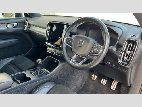 Volvo XC40 1.5 T3 [163] R DESIGN Pro 5dr 12.3" Active TFT crystal driver's instrument display, 9" centre console portrait touch screen, Adjustable steering wheel force, Bluetooth hands free telephone kit, Drive mode selector, Lane keep assist with driver alert control, Oncoming Lane Mitigation, Sensus navigation with European mapping and traffic information, Speed limiter, Speed sensitive steering, Voice activated control for key functions, Volvo on call, Sports chassis, DAB Digital radio, Steering wheel mounted remote controls, Active bending headlights, Adaptive brake lights with high level LED brake lights, Auto dimming interior mirror, Automatic headlamp levelling, Black stone door mirrors, Black stone roof, Colour coordinated auto folding and heated power door mirrors, Dark tinted windows for rear door side windows and cargo compartment, Dual integrated exhaust pipes with high gloss black surround, Front aluminium tread plates, Front and rear electric windows, High gloss black front and rear skid plate, High gloss black lower front bumper, High gloss black mesh front grille with high gloss black surround, High gloss black roof rails, High gloss black sensus surround deco, High gloss black window trim, Home safe and approach lighting, LED front fog lights with static cornering light function, LED Headlights + Active high beam incorporating daytime running lights, Rain sensor with automatic windscreen wiper activation, Rear side wing doors, Rear wiper, Roof antenna, Roof spoiler, Visible VIN plate, 12V socket in front tunnel console and luggage compartment, 2 zone electronic climate control and rear air vent, 3 seat bench in 2nd row, 60/40 split folding rear seat, Ambient front door and instrumental panel lighting, Bright metal luggage threshold, Centre console cupholders and storage, Charcoal headlining, Driver's side lower dashboard credit card storage compartment, Front door pocket and front cupholder illumination, Front footwell illumination, Front headrests, Front reading light and theatre lighting, Glovebox bag hook, Height/reach adjustable steering column, Illuminated glovebox, Illuminated luggage compartment, Illuminated tailgate, Illuminated vanity mirrors, Isofix attachments on outer rear seats, Key integrated remote, Leather gearknob, Load protection net, Multi directional lumbar support, Multicolour theatre lights, Rear armrest / integral cup holders / storage tray, Rear coat hook, Rear reading and courtesy lights, Single front passenger seat, Sports Leather steering wheel, Sports pedals, Underfloor cargo storage, 3x3 point rear seatbelts, City safety includes pedestrian, cyclist and large animal detection and front collision warning with full auto brake, Drivers knee airbag, Dual stage driver/passenger airbags, Electronic parking brake with auto hold, First aid kit, Front and outer rear seatbelt reminder and pretensioners, Front seats SIPS airbags, Hill descent control, Hill start assist, Inflatable curtain, Passenger airbag cut-off device, Road sign information display, Run off Road Mitigation, Run off Road Protection, SIPS (Side Impact Protection System), Slippery road and hazard light alert, Stability and Traction Control with Spin control, Engine Drag Control and Corner Traction Control, Tyre pressure monitoring system, Vehicle deceleration control with Anti-lock Brake System, Electronic Brake Distribution and Emergency Brake Assist, Warning triangle, WHIPS whiplash protection system - front, Anti-theft alarm including immobiliser/volume sensor + level sensor, Care key with user defined top speed, Key integrated remote control central locking + fuel flap with deadlocking system and auto open/close power windows, Locking wheel nuts, Private locking for tailgate, Cutting edge aluminium inlay