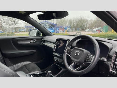 Volvo XC40 1.5 T3 [163] R DESIGN Pro 5dr Geartronic 12.3" Active TFT crystal driver's instrument display, 9" centre console portrait touch screen, Adjustable steering wheel force, Bluetooth hands free telephone kit, Drive mode selector, E-call, Lane keep assist with driver alert control, Oncoming Lane Mitigation, Power operated tailgate, Sensus navigation with European mapping and traffic information, Speed limiter, Speed sensitive steering, Voice activated control for key functions, Volvo on call, Sports chassis, DAB Digital radio, Steering wheel mounted remote controls, Adaptive brake lights with high level LED brake lights, Auto dimming interior mirror, Automatic headlamp levelling, Dark tinted windows for rear door side windows and cargo compartment, Electric adjustable/heated/auto folding door mirrors, Front aluminium tread plates, Front and rear electric windows, Heated front windscreen, High gloss black front and rear skid plate, High gloss black lower front bumper, High gloss black mesh front grille with high gloss black surround, High gloss black sensus surround deco, High gloss black window trim, Home safe and approach lighting, Integrated roof rails in high gloss black, LED Headlights + Active high beam incorporating daytime running lights, Rain sensor with automatic windscreen wiper activation, Rear side wing doors, Rear wiper, Roof antenna, Roof spoiler, Visible VIN plate, 12V socket in front tunnel console and luggage compartment, 2 zone electronic climate control and rear air vent, 3 seat bench in 2nd row, 60/40 versatile split folding rear seat, A-pillar parking ticket holder, Bright metal luggage threshold, Centre console cupholders and storage, Charcoal headlining, Front footwell illumination, Front headrests, Front reading light and theatre lighting, Front seat cushion extensions, Front tunnel net pocket and integrated waste bin, Glovebox bag hook, Heated front seats, Height/reach adjustable steering column, Height/tilt adjustable driver's seat, High gloss centre tunnel deco, Illuminated glovebox, Illuminated luggage compartment, Illuminated vanity mirrors, Isofix attachments on outer rear seats, Leather gearknob, Load protection net, Multi directional lumbar support, Power driver seat with memory + exterior mirrors memory, Rear armrest / integral cup holders / storage tray, Rear coat hook, Single front passenger seat, Sports floor mats, Sports pedals, Sports tailored steering wheel, Underfloor cargo storage, Vanity mirror with ticket holder, Lighting pack - XC40, 3x3 point rear seatbelts, City safety includes pedestrian, cyclist and large animal detection and front collision warning with full auto brake, Drivers knee airbag, Dual stage driver/passenger airbags, Electronic parking brake with auto hold, First aid kit, Front and outer rear seatbelt reminder and pretensioners, Front seats SIPS airbags, Hill descent control, Hill start assist, Inflatable curtain, Passenger airbag cut-off device, Road sign information display, Run off Road Mitigation, Run off Road Protection, SIPS (Side Impact Protection System), Slippery road and hazard light alert, Stability and Traction Control with Spin control, Engine Drag Control and Corner Traction Control, Tyre pressure monitoring system, Vehicle deceleration control with Anti-lock Brake System, Electronic Brake Distribution and Emergency Brake Assist, Warning triangle, WHIPS whiplash protection system - front, Anti-theft alarm including immobiliser/volume sensor + level sensor, Care key with user defined top speed, Key integrated remote control central locking + fuel flap with deadlocking system and auto open/close power windows, Locking wheel nuts, Private locking for tailgate, Cutting edge aluminium inlay, Lower dashboard, tunnel console and door panel in charcoal
