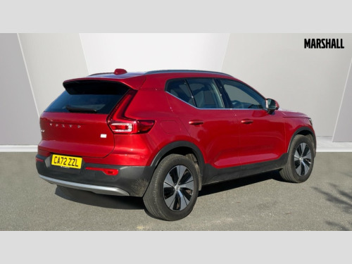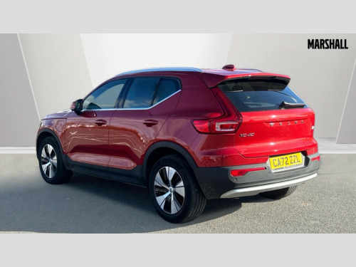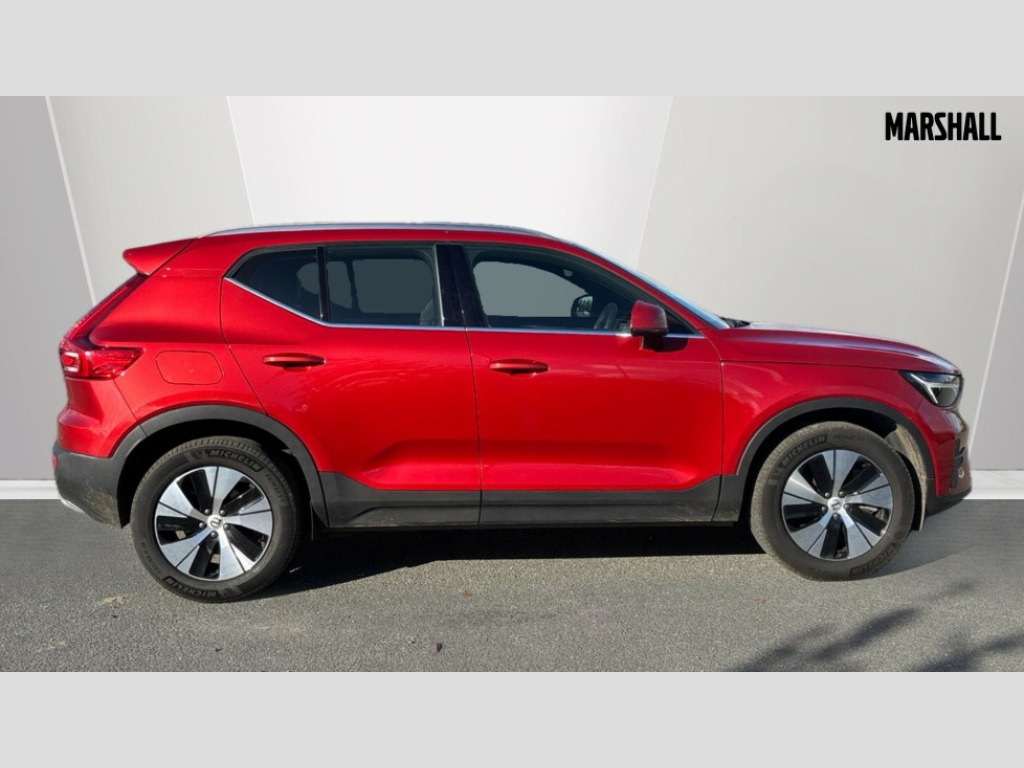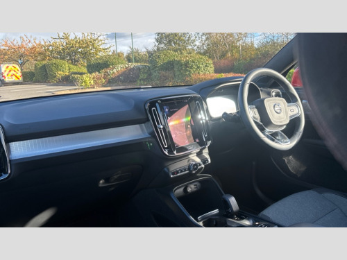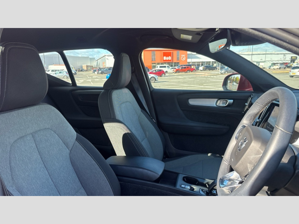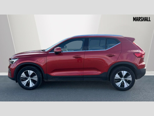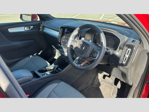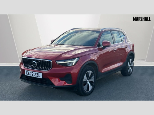 Volvo XC40 1.5 T4 Recharge PHEV Core Bright 5dr Auto 12.3" Active TFT crystal driver's instrument display, 9" centre console portrait touch screen, Adjustable steering wheel force, Bluetooth hands free telephone kit, Cruise control, Drive mode selector, E-call, Lane keep assist with driver alert control, Oncoming Lane Mitigation, Power operated tailgate, Rear park assist, Sensus navigation with European mapping and traffic information, Speed limiter, Speed sensitive steering, Voice activated control for key functions, Wireless Smartphone Integration includes Apple CarPlay and Android auto, Wireless/Inductive Mobile Phone Charging, 3.7 kW monophase on board charger, 7m 10amp charge cable with 3 pin plug and 7m 1 phase 16amp type 2/mode 3 charge cable, Dynamic chassis, Electric front axle drive, Recharging port located in nearside front wing, DAB Digital radio, Low speed exterior sound speaker, Sensus connect with high performance sound, 8 speakers/250W, front USB and 2 rear type C USB, Steering wheel mounted remote controls, Adaptive brake lights with high level LED brake lights, Auto dimming interior mirror, Automatic headlamp levelling, Automatic LED Headlights + Active high beam incorporating daytime running lights, Chrome window trim, Colour coordinated auto folding and heated power door mirrors, Front and rear electric windows, Front recharge aluminium tread plates, High gloss black front grille with chrome inserts, High Gloss silver front and rear skid plate, Home safe and approach lighting, Integrated roof rails in silver, Rain sensor with automatic windscreen wiper activation, Rear side wing doors, Rear wiper, Roof antenna, Roof spoiler, Visible VIN plate, 12V socket in front tunnel console and luggage compartment, 2-Zone electronic climate control with CleanZone air quality system and pollen filter, 3 seat bench in 2nd row, 3 Spoke tailored steering wheel with chrome trim, 60/40 versatile split folding rear seat, A-pillar parking ticket holder, C-pillar Recharge logo, Centre console cupholders and storage, Charcoal headlining, City block textile upholstery, Floor mats, Front footwell illumination, Front headrests, Front reading light and theatre lighting, Front tunnel pocket, Glovebox bag hook, Heated front seats, Height adjustable passenger seat, Height/reach adjustable steering column, Height/tilt adjustable driver's seat, High gloss black centre screen surround deco, Illuminated glovebox, Illuminated luggage compartment, Illuminated vanity mirrors, Isofix attachments on outer rear seats, Leather gearknob, Load protection net, Multi directional lumbar support, Rear armrest / integral cup holders / storage tray, Rear headrests, Single front passenger seat, Sports steering wheel, Underfloor cargo storage, 3x3 point rear seatbelts, City safety includes pedestrian, cyclist and large animal detection and front collision warning with full auto brake, Drivers knee airbag, Dual stage driver/passenger airbags, Electronic parking brake with auto hold, First aid kit, Front and outer rear seatbelt reminder and pretensioners, Front seats SIPS airbags, Hill descent control, Hill start assist, Inflatable curtain, Passenger airbag cut-off device, Power child locks on rear doors, Road sign information display, Run off Road Mitigation, Run off Road Protection, SIPS (Side Impact Protection System), Slippery road and hazard light alert, Stability and Traction Control with Spin control, Engine Drag Control and Corner Traction Control, Tyre pressure monitoring system, Vehicle deceleration control with Anti-lock Brake System, Electronic Brake Distribution and Emergency Brake Assist, Warning triangle, WHIPS whiplash protection system - front, Anti-theft alarm including immobiliser/volume sensor + level sensor, Care key with user defined top speed, Key integrated remote control central locking + fuel flap with deadlocking system and auto open/close power windows, Keyless Start, Locking wheel nuts, Private locking for tailgate