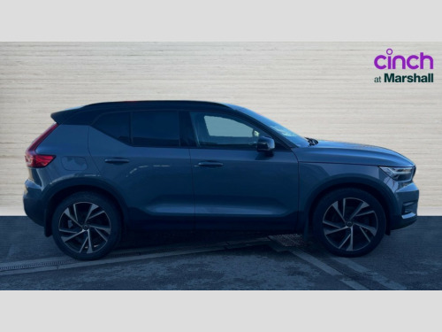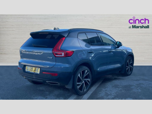 Volvo XC40 1.5 T5 [262] Hybrid R DESIGN Pro 5dr Geartronic 12.3" Active TFT crystal driver's instrument display, 9" centre console portrait touch screen, Adjustable steering wheel force, Bluetooth hands free telephone kit, Drive mode selector, E-call, Lane keep assist with driver alert control, Oncoming Lane Mitigation, Sensus navigation with European mapping and traffic information, Speed limiter, Speed sensitive steering, Voice control system, Volvo on call, Electric front axle drive, Recharging port located in nearside front wing, Sports chassis, DAB Digital radio, Steering wheel mounted remote controls, Active bending headlights, Adaptive brake lights with high level LED brake lights, Auto dimming interior mirror, Automatic headlamp levelling, Black stone door mirrors, Black stone roof, Colour coordinated auto folding and heated power door mirrors, Dark tinted glass for rear windows + rear screen + side luggage area window, Dual integrated exhaust pipes with high gloss black surround, Electrically adjustable and heated door mirrors, Embossed rear side roof pillar, Front and rear electric windows, Front tread plates, Headlamp cleaning system, Heated front windscreen, Heated washer nozzles, High gloss black front and rear skid plate, High gloss black lower front bumper, High gloss black mesh front grille with high gloss black surround, High gloss black roof rails, High gloss black window trim, Home safe and approach lighting, LED front fog lights with static cornering light function, LED Headlights + Active high beam incorporating daytime running lights, Rain sensor windscreen wipers, Rear wiper, Roof antenna, Roof spoiler, Visible VIN plate, 12V socket in front tunnel console and luggage compartment, 2 zone electronic climate control with Clean zone air quality system + pollen filter + cooled glovebox, 3 spoke leather steering wheel with chrome trim, 60/40 split folding rear seat, A-pillar parking ticket holder, Ambient front door and instrumental panel lighting, Black headlining, Bright metal luggage threshold, Centre console cupholders and storage, Driver seat height/tilt/lumbar adjust, Driver's side lower dashboard credit card storage compartment, Extended front seat cushions, Front door pocket and front cupholder illumination, Front footwell illumination, Glovebox bag hook, Heated front seats, Height/reach adjustable steering column, High gloss centre tunnel deco, Illuminated luggage compartment, Illuminated tailgate, Illuminated vanity mirrors + ticket holder, Isofix attachments on outer rear seats, Leather coloured key integrated remote, Leather/nubuck upholstery, Load protection net, Lockable/illuminated glovebox, Multicolour theatre lights, Passenger seat adjustable for lumbar support, Perforated leather gearknob, Perforated leather steering wheel with gearshift paddles, Power driver seat with memory + exterior mirrors memory, Rear armrest / integral cup holders / storage tray, Rear reading and courtesy lights, Sports pedals, Underfloor stowage compartment, 3x3 point rear seatbelts, City safety, Drivers knee airbag, DSTC-Dynamic Stability and Traction Control, Dual stage driver/passenger airbags, Electronic parking brake with auto hold, Fasten seatbelt reminder, First aid kit, Hill descent control, Hill start assist, Inflatable curtain, Passenger airbag cut-off device, Road sign information display, Run off Road Mitigation, Run off Road Protection, Seatbelt reminder and pretensioners, Slippery road and hazard light alert, Tyre pressure monitoring system, Vehicle deceleration control with Anti-lock Brake System, Electronic Brake Distribution and Emergency Brake Assist, Warning triangle, WHIPS whiplash protection system - front, Anti-theft alarm including immobiliser/volume sensor + level sensor, Key integrated remote control central locking, Locking wheel nuts, Private locking for tailgate, Cutting edge aluminium inlay, 20'' 5 double spoke diamond cut matt black alloy wheels