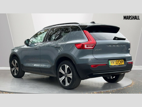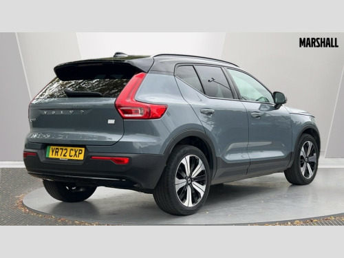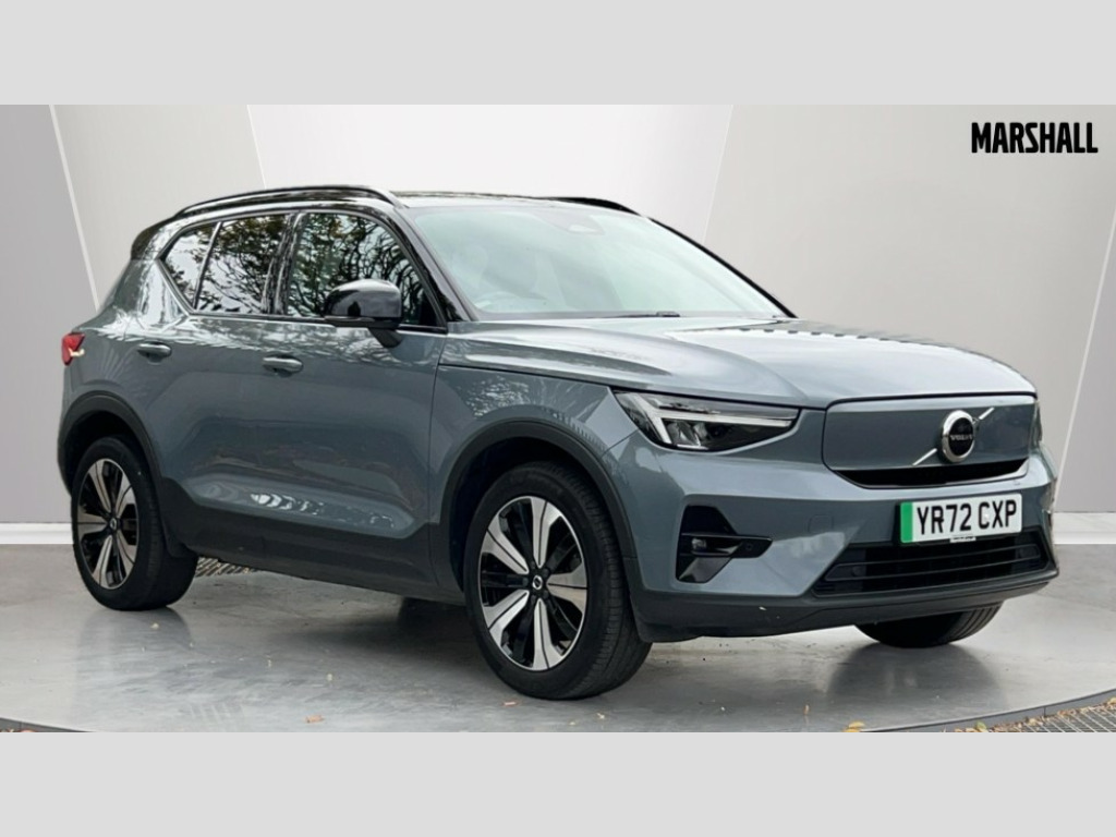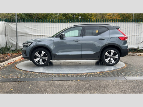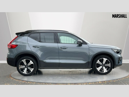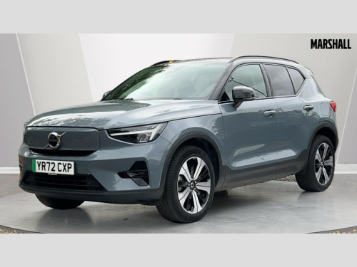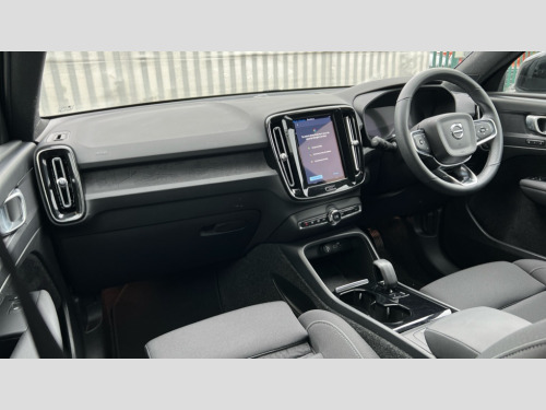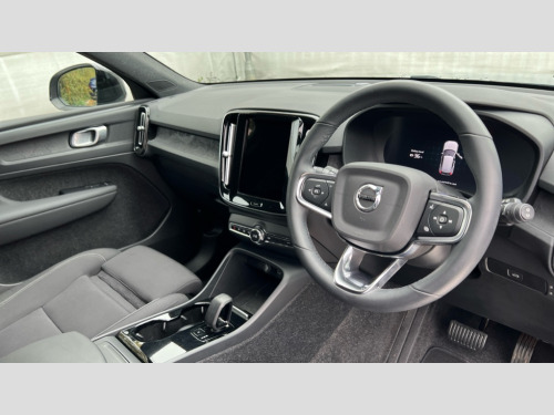 Volvo XC40 170kW Recharge Plus 69kWh 5dr Auto 12.3" Progressive Driver Display, 9" centre console portrait touch screen, Adjustable steering wheel force, Bluetooth handsfree system, Driver assistance (pilot assist and adaptive cruise control), Driver awareness - Blind spot information system with steer assist, cross traffic alert with autobrake and rear collision warning and mitigation, Emergency services call system, Front park assist, Google automatic services - Nav with google maps, apple carplay/android auto, voice recognition with google assistant, Hands free power tailgate, Lane keep assist with driver alert control, Oncoming Lane Mitigation, Rear park assist, Rear park assist camera, Speed limiter, Speed sensitive steering, Volvo cars services with app, Volvo on call with charge station locations and route planning and pre climatisation, Wireless Smartphone Integration includes Apple CarPlay and Android auto, Wireless/Inductive Mobile Phone Charging, 11 kW AC onboard charger, 4.5m Type 2/mode 3 charge cable, 7m 10amp charging cable with 3 pin plug and 4.5m 3 phase 32 amp type 2 / mode 3 charge cable, Charging port located in nearside rear wing, Electric front axle drive, Lithium-ion battery, Recharging port located in nearside rear wing, Touring chassis, DAB Digital radio, High performance sound, 8 speakers/250W, front USB and 2 rear type C USB, Low speed exterior sound speaker, Steering wheel remote infotainment controls, Adaptive brake lights with high level LED brake lights, Auto dimming exterior rear view mirror, Auto dimming interior mirror, Automatic headlamp levelling, Automatic LED Headlights + Active high beam incorporating daytime running lights, Colour co-ordinated front grille and surround, Dark tinted windows for rear door side windows and cargo compartment, Electric adjustable/heated/auto folding door mirrors, Front and rear electric windows, Front recharge tread plates, High gloss black front and rear skid plate, High gloss black lower front bumper, High gloss black window trim, Home safe and approach lighting, Integrated roof rails in high gloss black, LED front fog lamps, Puddle lights, Rain sensor with automatic windscreen wiper activation, Rear side wing doors, Rear wiper, Recharge embossed rear side roof pillar, Roof antenna, Visible VIN plate, 12V socket in front tunnel console and luggage compartment, 2 zone electronic climate control and rear air vent with clean zone air quality system and pollen filter, 3 bench rear seats in 2nd row, 3 spoke sports tailored steering wheel, 60/40 versatile split folding rear seat, A-pillar parking ticket holder, Centre console cupholders and storage, Charcoal headlining, Flexible load floor and grocery bag holder, Floor mats, Front footwell illumination, Front headrests, Front load compartment (31 litres), Front reading light and theatre lighting, Front seat cushion extensions, Front tunnel net pocket and integrated waste bin, Glovebox bag hook, Heat pump (Enhanced cabin heating and cooling efficiency with optimal vehicle range), Height/reach adjustable steering column, High gloss black centre tunnel and centre screen surround deco, Illuminated glovebox, Illuminated luggage compartment, Illuminated vanity mirrors + ticket holder, Load protection net, Multi directional lumbar support, Power driver seat with memory + exterior mirrors memory, Power passenger seat, Rear armrest with cupholder, Rear coat hook, Rear headrests, Single front passenger seat, Underfloor cargo storage, Climate pack - C40/XC40, 3x3 point rear seatbelts, City safety includes pedestrain and cyclist detection, front collision warning with full and rear auto brake, Drivers knee airbag, Dual stage driver/passenger airbags, Electronic parking brake with auto hold, First aid kit, Front and outer rear seatbelt reminder and pretensioners, Front seats SIPS airbags, Hill descent control, Hill start assist, Inflatable curtain, ISOFIX attachment (Front passenger and Rear outer seats), Passenger airbag cut-off device, Power child locks on rear doors, Road sign information display, Run off Road Mitigation, Run off Road Protection, SIPS (Side Impact Protection System), Slippery road and hazard light alert, Stability and traction control includes spin control and corner traction control, Tyre pressure monitoring system, Vehicle deceleration control with Anti-lock Brake System, Electronic Brake Distribution and Emergency Brake Assist, Warning triangle, WHIPS whiplash protection system - front, Anti-theft alarm including immobiliser/volume sensor + level sensor, Care key with user defined top speed, Convenient entry and start, Key integrated remote control central locking + fuel flap with deadlocking system and auto open/close power windows, Keyless drive plus handsfree tailgate opening/closing, Locking wheel nuts, Private locking for tailgate, Origin inlay, Tyre sealant kit + 12v compressor