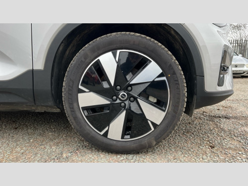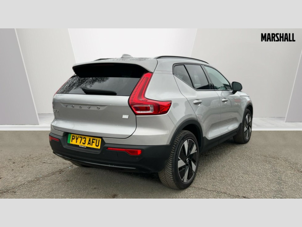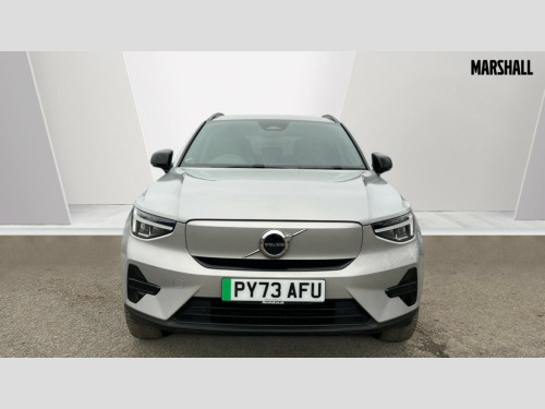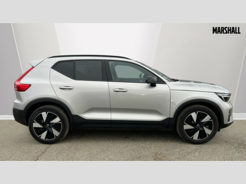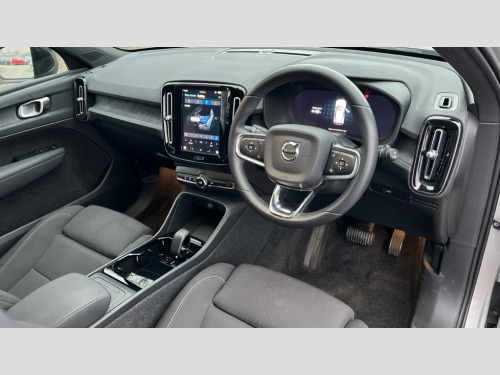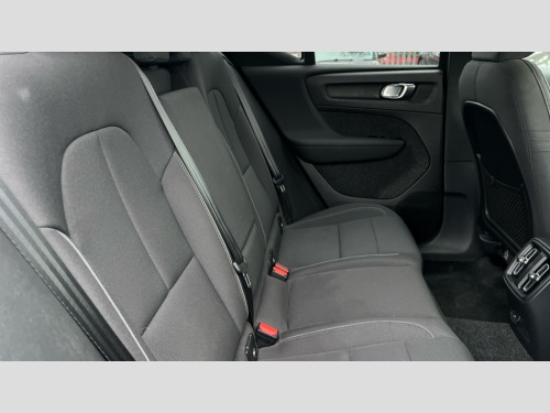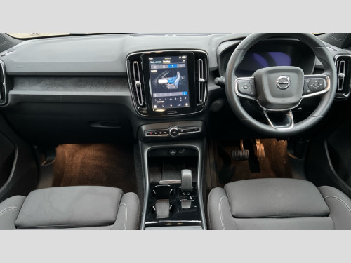 Volvo XC40 175kW Recharge Core 69kWh 5dr Auto 12.3" Progressive Driver Display, 9" centre console portrait touch screen, Adjustable steering wheel force, Bluetooth handsfree system, Cruise control, Driver alert control with lane keeping aid, Emergency services call system, Google automatic services - Nav with google maps, apple carplay/android auto, voice recognition with google assistant, Oncoming Lane Mitigation, Power operated tailgate, Rear park assist, Speed limiter, Speed sensitive steering, Volvo cars services with app, Volvo on call with charge station locations and route planning and pre climatisation, Wired Apple CarPlay, Wireless/Inductive Mobile Phone Charging, 3.7 kW monophase on board charger, 7m 10amp charging cable with 3 pin plug and 4.5m 3 phase 32 amp type 2 / mode 3 charge cable, Electric rear axle drive, Lithium-ion battery, Recharging port located in nearside rear wing, Touring chassis, DAB Digital radio, High performance sound, 8 speakers/250W, 2 front USB and 2 rear type C USB, Low speed exterior sound speaker, Steering wheel remote infotainment controls, Adaptive brake lights with high level LED brake lights, Auto dimming interior mirror, Automatic headlamp levelling, Automatic LED Headlights + Active high beam incorporating daytime running lights, Black stone boot spoiler, Black stone door mirrors, Colour co-ordinated front grille and surround, Dark tinted windows for rear door side windows and cargo compartment, Electric adjustable/heated/auto folding door mirrors, Front and rear electric windows, Front recharge tread plates, High gloss black front and rear skid plate, High gloss black lower front bumper, High gloss black window trim, Home safe and approach lighting, Integrated roof rails in high gloss black, Rain sensor with automatic windscreen wiper activation, Rear side wing doors, Rear wiper, Recharge embossed rear side roof pillar, Roof antenna, Visible VIN plate, 12V socket in front tunnel console, 2 zone electronic climate control and rear air vent with clean zone air quality system and pollen filter, 3 bench rear seats in 2nd row, 3 spoke sports tailored steering wheel, 60/40 versatile split folding rear seat, A-pillar parking ticket holder, Centre console cupholders and storage, Charcoal headlining, Charcoal lower dashboard, upper tunnel console and armrest, Floor mats, Front footwell illumination, Front headrests, Front load compartment (31 litres), Front reading light and theatre lighting, Front seat cushion extensions, Front tunnel net pocket and integrated waste bin, Glovebox bag hook, Heated front seats, Height adjustable passenger seat, Height/reach adjustable steering column, Height/tilt adjustable driver's seat, High gloss black centre tunnel and centre screen surround deco, Illuminated glovebox, Illuminated luggage compartment, Illuminated vanity mirrors + ticket holder, Load protection net, Multi directional lumbar support, One pedal drive mode, Rear armrest with cupholder, Rear coat hook, Rear headrests, Single front passenger seat, Textile cloth upholstery, Underfloor cargo storage, 3x3 point rear seatbelts, City safety includes pedestrain and cyclist detection, front collision warning with full and rear auto brake, Drivers knee airbag, Dual stage driver/passenger airbags, Electronic parking brake with auto hold, First aid kit, Front and outer rear seatbelt reminder and pretensioners, Front seats SIPS airbags, Hill descent control, Hill start assist, IC (Inflatable Curtains) - Full Length, ISOFIX attachment (Front passenger and Rear outer seats), Passenger airbag cut-off device, Power child locks on rear doors, Road sign information display, Run off Road Mitigation, Run off Road Protection, SIPS (Side Impact Protection System), Slippery road and hazard light alert, Stability and traction control includes spin control and corner traction control, Tyre pressure monitoring system, Vehicle deceleration control with Anti-lock Brake System, Electronic Brake Distribution and Emergency Brake Assist, Warning triangle, WHIPS whiplash protection system - front, 2 x Key integrated remote control central locking including recharging port with deadlocking system and auto open/close power windows, Anti-theft alarm including immobiliser/volume sensor + level sensor, Care key with user defined top speed, Convenient entry and start, Locking wheel nuts, Private locking for tailgate, Remote door locking and unlocking, 19" 5 Spoke diamond cut/black alloy wheels, All season tyres, Tyre sealant kit + 12v compressor