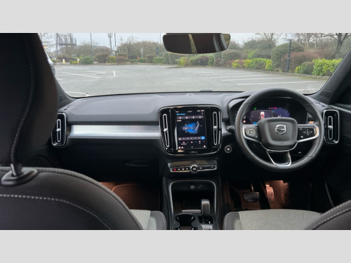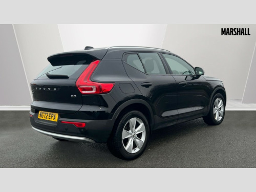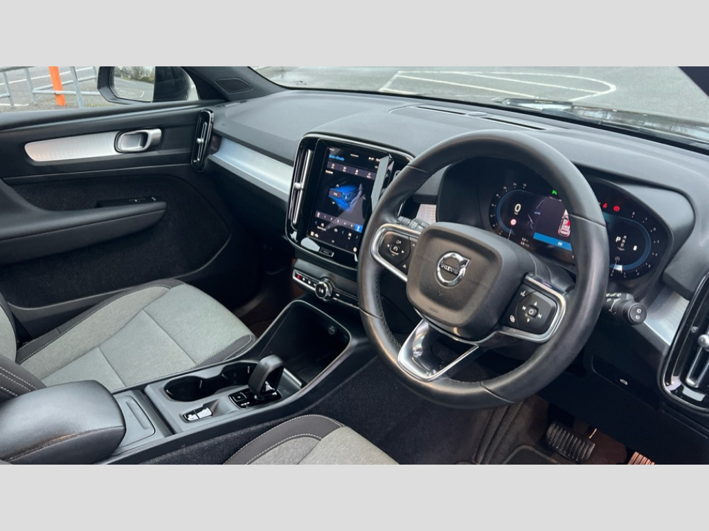 Volvo XC40 2.0 B3P Core 5dr Auto 12.3" Progressive Driver Display, 9" centre console portrait touch screen, Adjustable steering wheel force, Bluetooth hands free telephone kit, Cruise control, E-call, Google automatic services - Nav with google maps, apple carplay/android auto, voice recognition with google assistant, Lane keep assist with driver alert control, Oncoming Lane Mitigation, Power operated tailgate, Rear park assist, Speed limiter, Speed sensitive steering, Wireless/Inductive Mobile Phone Charging, Dynamic chassis, DAB Digital radio, High performance sound, 8 speakers/250W, front USB and 2 rear type C USB, Steering wheel mounted remote controls, Adaptive brake lights with high level LED brake lights, Auto dimming interior mirror, Automatic headlamp levelling, Automatic LED Headlights + Active high beam incorporating daytime running lights, Colour coordinated auto folding and heated power door mirrors, Dark grey front grille with chrome surround, Front and rear electric windows, High Gloss silver front and rear skid plate, Home safe and approach lighting, Integrated roof rails in silver, Rain sensor with automatic windscreen wiper activation, Rear side wing doors, Rear wiper, Roof antenna, Roof spoiler, Visible VIN plate, 12V socket in front tunnel console and luggage compartment, 2-Zone electronic climate control with CleanZone air quality system and pollen filter, 3 seat bench in 2nd row, 3 Spoke tailored steering wheel with chrome trim, 60/40 versatile split folding rear seat, A-pillar parking ticket holder, Centre console cupholders and storage, Charcoal headlining, City block textile upholstery, Floor mats, Front footwell illumination, Front headrests, Front reading light and theatre lighting, Front tunnel pocket, Glovebox bag hook, Heated front seats, Height adjustable passenger seat, Height/reach adjustable steering column, Height/tilt adjustable driver's seat, High gloss black centre screen surround deco, Illuminated glovebox, Illuminated luggage compartment, Illuminated vanity mirrors, Integrated waste bin, Isofix attachments on outer rear seats, Leather gearknob, Load protection net, Multi directional lumbar support, Rear armrest / integral cup holders / storage tray, Rear headrests, Single front passenger seat, Sports steering wheel, Underfloor cargo storage, 3x3 point rear seatbelts, City safety with steering support with Pedestrian + cyclist + front collision warning with full auto brake and rear auto brake, Drivers knee airbag, Dual stage driver/passenger airbags, Electronic parking brake with auto hold, First aid kit, Front and outer rear seatbelt reminder and pretensioners, Front seats SIPS airbags, Hill descent control, Hill start assist, Inflatable curtain, Passenger airbag cut-off device, Power child locks on rear doors, Road sign information display, Run off Road Mitigation, Run off Road Protection, SIPS (Side Impact Protection System), Slippery road and hazard light alert, Stability and Traction Control with Spin control, Engine Drag Control and Corner Traction Control, Tyre pressure monitoring system, Vehicle deceleration control with Anti-lock Brake System, Electronic Brake Distribution and Emergency Brake Assist, Warning triangle, WHIPS whiplash protection system - front, Anti-theft alarm including immobiliser/volume sensor + level sensor, Key integrated remote control central locking + fuel flap with deadlocking system and auto open/close power windows, Keyless start, Locking wheel nuts