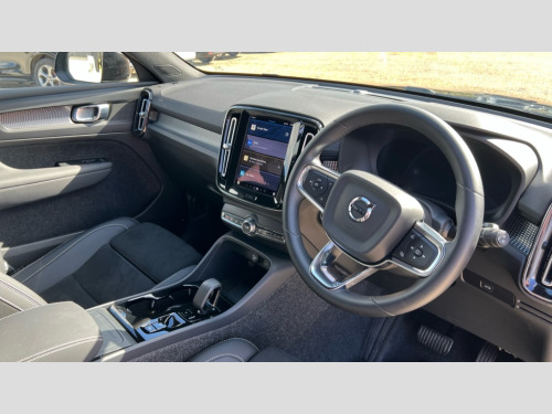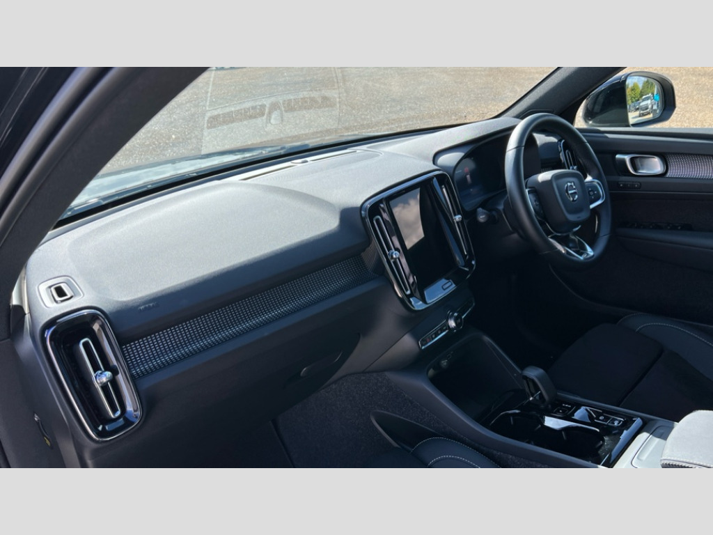 Volvo XC40 2.0 B3P Plus Dark 5dr Auto 12.3" Progressive Driver Display, 9" centre console portrait touch screen, Adjustable steering wheel force, Android auto (Wired), Apple carplay (wired), Bluetooth handsfree system, Driver alert control, Driver assistance (pilot assist and adaptive cruise control), Driver awareness - Blind spot information system with steer assist, cross traffic alert with autobrake and rear collision warning and mitigation, E-call, Front park assist, Google automotive services - Enabled entertainment apps, navigation with google maps, voice recognition with google assistant, Hands free power tailgate, Intelligent speed assistance, Lane keeping aid, Oncoming Lane Mitigation, Rear park assist, Speed sensitive steering, Volvo cars services with app - Driving journal, emergency and breakdown call, engine remote start, remote door locking/unlocking and vehicle dashboard, Wireless/Inductive Mobile Phone Charging, Automatic transmission with start/stop and manual change functions, Dynamic chassis, DAB Digital radio, Steering wheel mounted remote controls, Adaptive brake lights with high level LED brake lights, Auto dimming feature for exterior door mirrors, Auto dimming interior mirror, Automatic headlamp levelling, Automatic LED Headlights + Active high beam incorporating daytime running lights, Front aluminium tread plates, Front and rear electric windows, High gloss black front and rear skid plate, High gloss black front bumper deco, High gloss black mesh front grille with high gloss black surround, High gloss black window trim, Home safe and approach lighting, Integrated roof rails in high gloss black, LED front fog lights, Puddle lights, Rain sensor with automatic windscreen wiper activation, Rear side wing doors, Rear wiper, Roof antenna, Roof spoiler, Visible VIN plate, 12V socket in front tunnel console and luggage compartment, 2-Zone electronic climate control with CleanZone air quality system and pollen filter, 3 seat bench in 2nd row, 3 Spoke tailored steering wheel with chrome trim, 60/40 versatile split folding rear seat, Centre console cupholders and storage, Charcoal headlining, Connect textile/microtech upholstery, Flexible load floor and grocery bag holder, Floor mats, Front cabin courtesy lights, Front door pocket, front cupholder, ambient front door, rear reading, rear courtesy, instrument panel and tailgate lighting, Front footwell illumination, Front headrests, Front reading lights, Front seat cushion extensions, Front side step illumination (under door), Glovebox bag hook, Heated front seats, Height adjustable passenger seat, Height/reach adjustable steering column, High gloss centre tunnel deco, Illuminated glovebox, Illuminated luggage compartment, Illuminated vanity mirrors + ticket holder, Integrated waste bin, Isofix attachments on outer rear seats, Load cover, Load protection net, Multi directional lumbar support for driver and passenger seat, Power driver seat with memory + exterior mirrors memory, Rear armrest with cupholders, Rear headrests, Single front passenger seat, Underfloor cargo storage, Climate pack without heated front seats - XC40, 3x3 point rear seatbelts, City safety with steering support with Pedestrian + cyclist + front collision warning with full auto brake and rear auto brake, Driver and passenger airbags, Drivers knee airbag, Electronic parking brake with auto hold, First aid kit, Front and outer rear seatbelt reminder and pretensioners, Front seats SIPS airbags, Hill descent control, Hill start assist, Inflatable curtain, Passenger airbag cut-off device, Power child locks on rear doors, Road sign information display, Run off Road Protection, SIPS (Side Impact Protection System), Slippery road and hazard light alert, Stability and Traction Control with Spin control, Engine Drag Control and Corner Traction Control, Tyre pressure monitoring system, Vehicle deceleration control with Anti-lock Brake System, Electronic Brake Distribution and Emergency Brake Assist, Warning triangle, WHIPS whiplash protection system - front, 2 x Key integrated remote control central locking including with deadlocking system and auto open/close windows, Anti-theft alarm including immobiliser/volume sensor + level sensor, Keyless drive includes keyless entry and keyless start, Locking wheel nuts