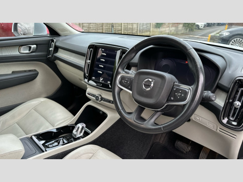 Volvo XC40 2.0 B4P Inscription 5dr Auto 12.3" Active TFT crystal driver's instrument display, 9" centre console portrait touch screen, Adjustable steering wheel force, Bluetooth hands free telephone kit, Drive mode selector, Lane keep assist with driver alert control, Oncoming Lane Mitigation, Sensus navigation with European mapping and traffic information, Speed limiter, Speed sensitive steering, Voice activated control for key functions, Volvo on call, Dynamic chassis, DAB Digital radio, Steering wheel mounted remote controls, Adaptive brake lights with high level LED brake lights, Auto dimming interior mirror, Automatic headlamp levelling, Chrome window surround, Colour coordinated auto folding and heated power door mirrors, Dual exhaust pipes, Front aluminium tread plates, Front and rear electric windows, High gloss black front grille with chrome inserts, High gloss black sensus surround deco, High Gloss silver front and rear skid plate, Home safe and approach lighting, LED front fog lights, LED Headlights + Active high beam incorporating daytime running lights, Rain sensor with automatic windscreen wiper activation, Rear side wing doors, Rear wiper, Roof antenna, Roof spoiler, Silver roof rails, Visible VIN plate, 12V socket in front tunnel console and luggage compartment, 2 zone electronic climate control and rear air vent, 3 seat bench in 2nd row, 3 spoke leather steering wheel with chrome trim, 60/40 split folding rear seat, Ambient front door and instrumental panel lighting, Bright metal luggage threshold, Centre console cupholders and storage, Driver's side lower dashboard credit card storage compartment, Front door pocket and front cupholder illumination, Front footwell illumination, Front headrests, Front reading light and theatre lighting, Front tunnel net pocket and integrated waste bin, Glovebox bag hook, Height/reach adjustable steering column, High gloss centre tunnel deco, Illuminated glovebox, Illuminated luggage compartment, Illuminated tailgate, Illuminated vanity mirrors, Isofix attachments on outer rear seats, Key integrated remote, Leather faced upholstery, Load protection net, Luxury floor mats, Multi directional lumbar support, Multicolour theatre lights, Orrefors Crystal gear lever knob, Rear armrest / integral cup holders / storage tray, Rear coat hook, Rear reading and courtesy lights, Single front passenger seat, Underfloor cargo storage, 3x3 point rear seatbelts, City safety includes pedestrian, cyclist and large animal detection and front collision warning with full auto brake, Drivers knee airbag, Dual stage driver/passenger airbags, Electronic parking brake with auto hold, First aid kit, Front and outer rear seatbelt reminder and pretensioners, Front seats SIPS airbags, Hill descent control, Hill start assist, Inflatable curtain, Passenger airbag cut-off device, Road sign information display, Run off Road Mitigation, Run off Road Protection, SIPS (Side Impact Protection System), Slippery road and hazard light alert, Stability and Traction Control with Spin control, Engine Drag Control and Corner Traction Control, Tyre pressure monitoring system, Vehicle deceleration control with Anti-lock Brake System, Electronic Brake Distribution and Emergency Brake Assist, Warning triangle, WHIPS whiplash protection system - front, Anti-theft alarm including immobiliser/volume sensor + level sensor, Care key with user defined top speed, Key integrated remote control central locking + fuel flap with deadlocking system and auto open/close power windows, Locking wheel nuts, Private locking for tailgate, Driftwood inlays