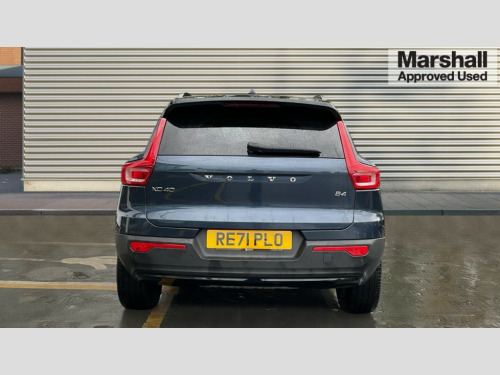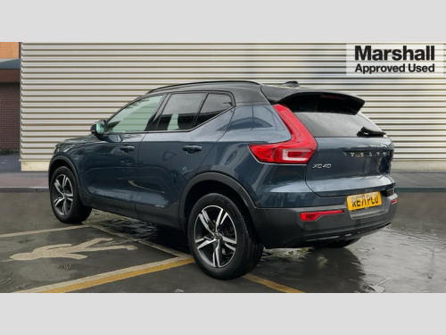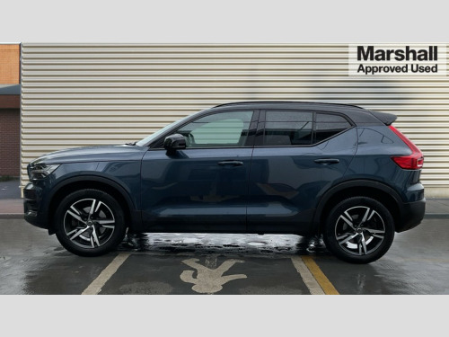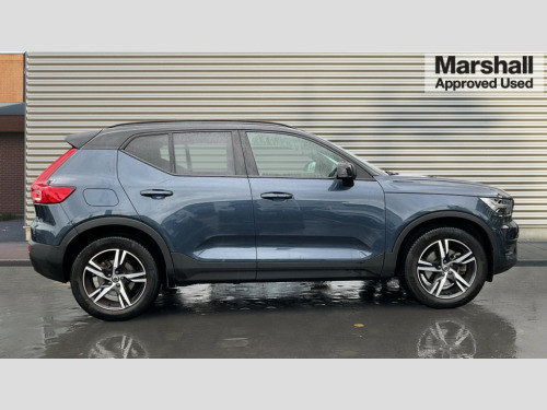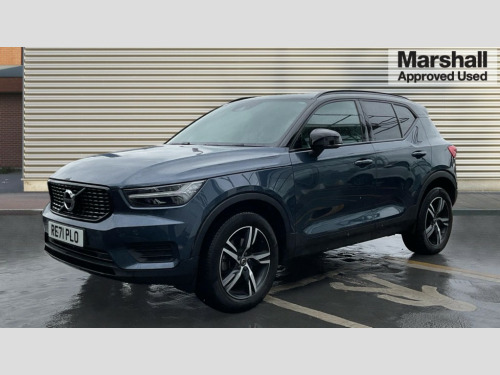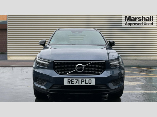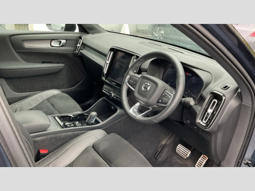 Volvo XC40 2.0 B4P R DESIGN 5dr Auto 12.3" Active TFT crystal driver's instrument display, 9" centre console portrait touch screen, Adjustable steering wheel force, Bluetooth hands free telephone kit, Drive mode selector, E-call, Lane keep assist with driver alert control, Oncoming Lane Mitigation, Power operated tailgate, Sensus navigation with European mapping and traffic information, Speed limiter, Speed sensitive steering, Voice activated control for key functions, Volvo on call, Sports chassis, DAB Digital radio, Steering wheel mounted remote controls, Adaptive brake lights with high level LED brake lights, Auto dimming interior mirror, Automatic headlamp levelling, Dark tinted windows for rear door side windows and cargo compartment, Electric adjustable/heated/auto folding door mirrors, Front aluminium tread plates, Front and rear electric windows, High gloss black front and rear skid plate, High gloss black lower front bumper, High gloss black mesh front grille with high gloss black surround, High gloss black sensus surround deco, High gloss black window trim, Home safe and approach lighting, Integrated roof rails in high gloss black, LED Headlights + Active high beam incorporating daytime running lights, Rain sensor with automatic windscreen wiper activation, Rear side wing doors, Rear wiper, Roof antenna, Roof spoiler, Visible VIN plate, 12V socket in front tunnel console and luggage compartment, 2 zone electronic climate control and rear air vent, 3 seat bench in 2nd row, 60/40 versatile split folding rear seat, A-pillar parking ticket holder, Centre console cupholders and storage, Charcoal headlining, Front footwell illumination, Front headrests, Front reading light and theatre lighting, Front seat cushion extensions, Front tunnel net pocket and integrated waste bin, Glovebox bag hook, Height/reach adjustable steering column, High gloss centre tunnel deco, Illuminated glovebox, Illuminated luggage compartment, Illuminated vanity mirrors, Isofix attachments on outer rear seats, Leather gearknob, Load protection net, Multi directional lumbar support, Rear armrest / integral cup holders / storage tray, Rear coat hook, Single front passenger seat, Sports floor mats, Sports pedals, Sports tailored steering wheel, Underfloor cargo storage, Vanity mirror with ticket holder, 3x3 point rear seatbelts, City safety includes pedestrian, cyclist and large animal detection and front collision warning with full auto brake, Drivers knee airbag, Dual stage driver/passenger airbags, Electronic parking brake with auto hold, First aid kit, Front and outer rear seatbelt reminder and pretensioners, Front seats SIPS airbags, Hill descent control, Hill start assist, Inflatable curtain, Passenger airbag cut-off device, Road sign information display, Run off Road Mitigation, Run off Road Protection, SIPS (Side Impact Protection System), Slippery road and hazard light alert, Stability and Traction Control with Spin control, Engine Drag Control and Corner Traction Control, Tyre pressure monitoring system, Vehicle deceleration control with Anti-lock Brake System, Electronic Brake Distribution and Emergency Brake Assist, Warning triangle, WHIPS whiplash protection system - front, Anti-theft alarm including immobiliser/volume sensor + level sensor, Care key with user defined top speed, Key integrated remote control central locking + fuel flap with deadlocking system and auto open/close power windows, Locking wheel nuts, Private locking for tailgate, Cutting edge aluminium inlay, Lower dashboard, tunnel console and door panel in charcoal