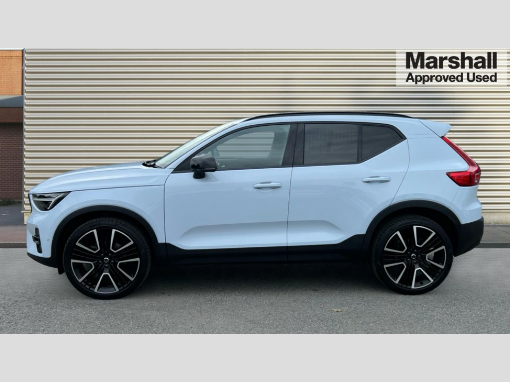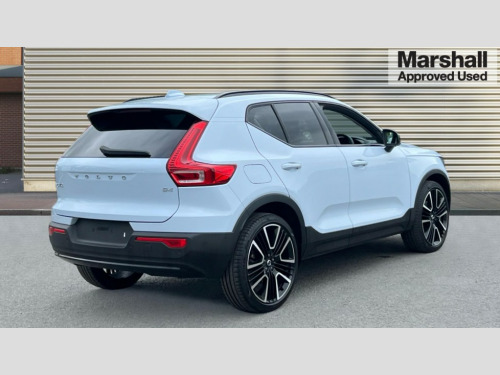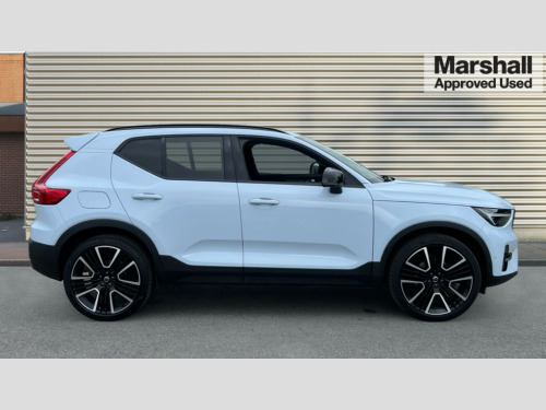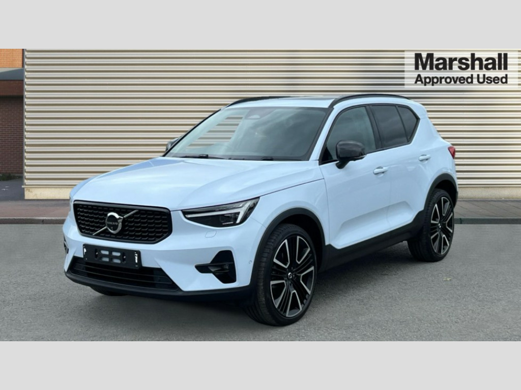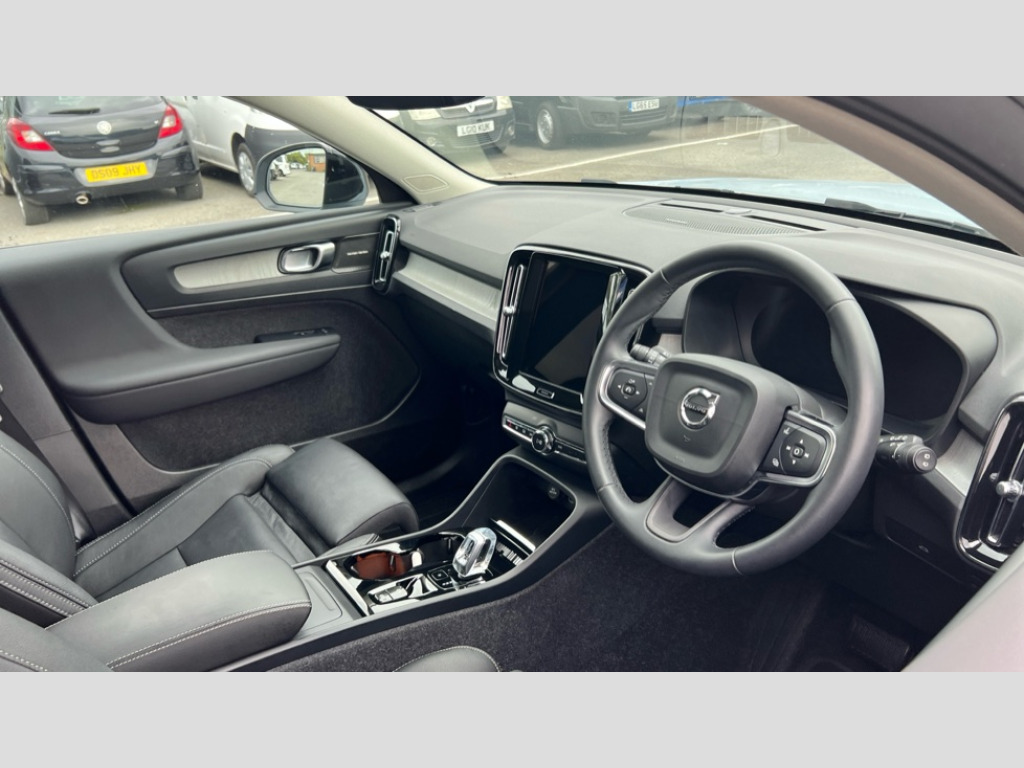 Volvo XC40 2.0 B4P Ultra Dark 5dr Auto 12.3" Progressive Driver Display, 360 degree surround view parking camera with side proximity sensors, 9" centre console portrait touch screen, Adjustable steering wheel force, Apple carplay (wired), Bluetooth handsfree system, Driver alert control, Driver assistance (pilot assist and adaptive cruise control), Driver awareness - Blind spot information system with steer assist, cross traffic alert with autobrake and rear collision warning and mitigation, E-call, Google automotive services - Enabled entertainment apps, navigation with google maps, voice recognition with google assistant, Hands free power tailgate, Intelligent speed assistance, Lane keeping aid, Oncoming Lane Mitigation, Speed sensitive steering, Volvo cars services with app - Driving journal, emergency and breakdown call, engine remote start, remote door locking/unlocking and vehicle dashboard, Wireless/Inductive Mobile Phone Charging, Automatic transmission with start/stop and manual change functions, Dynamic chassis, DAB Digital radio, Premium Sound by Harman Kardon, Dolby Pro Logic II Surround Sound, Dirac Unison,12 speakers/600W and subwoofer, Steering wheel mounted remote controls, Active bending pixel LED headlights with adaptive shadow technology, Active high beam incorporating daytime running lights, Adaptive brake lights with high level LED brake lights, Auto dimming feature for exterior door mirrors, Auto dimming interior mirror, Automatic headlamp levelling, Dark tinted windows - rear side windows and rear screen, Front aluminium tread plates, Front and rear electric windows, Headlight cleaning system, High gloss black front and rear skid plate, High gloss black front bumper deco, High gloss black mesh front grille with high gloss black surround, High gloss black window trim, Home safe and approach lighting, Integrated roof rails in high gloss black, LED front fog lights with cornering function, Power glass tilt and slide panoramic sunroof with sun curtain, Puddle lights, Rain sensor with automatic windscreen wiper activation, Rear side wing doors, Rear wiper, Roof antenna, Roof spoiler, Visible VIN plate, 12V socket in front tunnel console and luggage compartment, 2-Zone electronic climate control with CleanZone air quality system and pollen filter, 3 seat bench in 2nd row, 3 Spoke tailored steering wheel with chrome trim, 60/40 versatile split folding rear seat, A-pillar parking ticket holder, Centre console cupholders and storage, Flexible load floor and grocery bag holder, Floor mats, Front cabin courtesy lights, Front door pocket, front cupholder, ambient front door, rear reading, rear courtesy, instrument panel and tailgate lighting, Front footwell illumination, Front headrests, Front reading lights, Front seat cushion extensions, Front side step illumination (under door), Glovebox bag hook, Heated front seats, Height/reach adjustable steering column, High gloss centre tunnel deco, Illuminated glovebox, Illuminated luggage compartment, Illuminated vanity mirrors + ticket holder, Integrated waste bin, Isofix attachments on outer rear seats, Load cover, Load protection net, Multi directional lumbar support for driver and passenger seat, Power driver seat with memory + exterior mirrors memory, Power folding rear headrests, Power passenger seat, Rear armrest with cupholders, Single front passenger seat, Underfloor cargo storage, Climate pack without heated front seats - XC40, 3x3 point rear seatbelts, City safety with steering support with Pedestrian + cyclist + front collision warning with full auto brake and rear auto brake, Driver and passenger airbags, Drivers knee airbag, Electronic parking brake with auto hold, First aid kit, Front and outer rear seatbelt reminder and pretensioners, Front seats SIPS airbags, Hill descent control, Hill start assist, Inflatable curtain, Passenger airbag cut-off device, Power child locks on rear doors, Road sign information display, Run off Road Protection, SIPS (Side Impact Protection System), Slippery road and hazard light alert, Stability and Traction Control with Spin control, Engine Drag Control and Corner Traction Control, Tyre pressure monitoring system, Vehicle deceleration control with Anti-lock Brake System, Electronic Brake Distribution and Emergency Brake Assist, Warning triangle, WHIPS whiplash protection system - front, 2 x Key integrated remote control central locking including with deadlocking system and auto open/close windows and sunroof, Anti-theft alarm including immobiliser/volume sensor + level sensor, Keyless drive includes keyless entry and keyless start, Locking wheel nuts