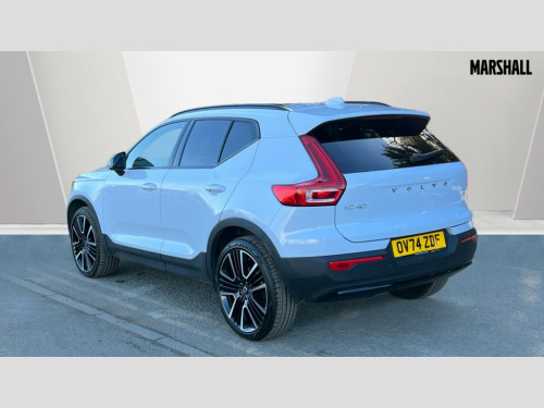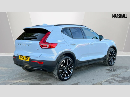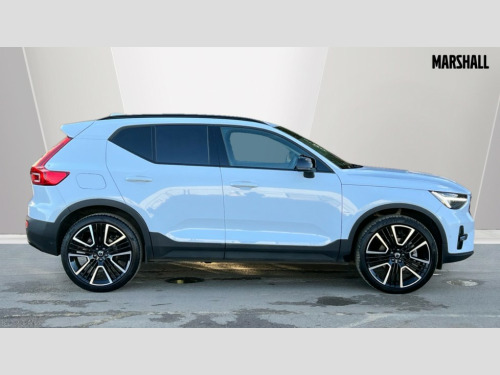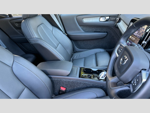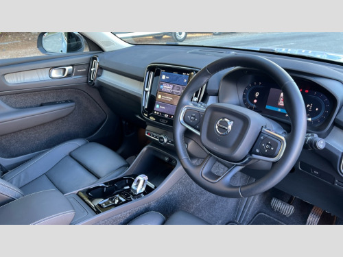 Volvo XC40 2.0 B4P Ultra Dark 5dr Auto 12.3" Progressive Driver Display, 360 degree surround view parking camera with side proximity sensors, 9" centre console portrait touch screen, Adjustable steering wheel force, Apple carplay (wired), Bluetooth handsfree system, Driver alert control, Driver assistance (pilot assist and adaptive cruise control), Driver awareness - Blind spot information system with steer assist, cross traffic alert with autobrake and rear collision warning and mitigation, E-call, Google automotive services - Enabled entertainment apps, navigation with google maps, voice recognition with google assistant, Hands free power tailgate, Intelligent speed assistance, Lane keeping aid, Oncoming Lane Mitigation, Speed sensitive steering, Volvo cars services with app - Driving journal, emergency and breakdown call, engine remote start, remote door locking/unlocking and vehicle dashboard, Wireless/Inductive Mobile Phone Charging, Automatic transmission with start/stop and manual change functions, Dynamic chassis, DAB Digital radio, Premium Sound by Harman Kardon, Dolby Pro Logic II Surround Sound, Dirac Unison,12 speakers/600W and subwoofer, Steering wheel mounted remote controls, Active bending pixel LED headlights with adaptive shadow technology, Active high beam incorporating daytime running lights, Adaptive brake lights with high level LED brake lights, Auto dimming feature for exterior door mirrors, Auto dimming interior mirror, Automatic headlamp levelling, Dark tinted windows - rear side windows and rear screen, Front aluminium tread plates, Front and rear electric windows, Headlight cleaning system, High gloss black front and rear skid plate, High gloss black front bumper deco, High gloss black mesh front grille with high gloss black surround, High gloss black window trim, Home safe and approach lighting, Integrated roof rails in high gloss black, LED front fog lights with cornering function, Power glass tilt and slide panoramic sunroof with sun curtain, Puddle lights, Rain sensor with automatic windscreen wiper activation, Rear side wing doors, Rear wiper, Roof antenna, Roof spoiler, Visible VIN plate, 12V socket in front tunnel console and luggage compartment, 2-Zone electronic climate control with CleanZone air quality system and pollen filter, 3 seat bench in 2nd row, 3 Spoke tailored steering wheel with chrome trim, 60/40 versatile split folding rear seat, Centre console cupholders and storage, Flexible load floor and grocery bag holder, Floor mats, Front cabin courtesy lights, Front door pocket, front cupholder, ambient front door, rear reading, rear courtesy, instrument panel and tailgate lighting, Front footwell illumination, Front headrests, Front reading lights, Front seat cushion extensions, Front side step illumination (under door), Glovebox bag hook, Heated front seats, Height/reach adjustable steering column, High gloss centre tunnel deco, Illuminated glovebox, Illuminated luggage compartment, Illuminated vanity mirrors + ticket holder, Integrated waste bin, Isofix attachments on outer rear seats, Load cover, Load protection net, Multi directional lumbar support for driver and passenger seat, Power driver seat with memory + exterior mirrors memory, Power folding rear headrests, Power passenger seat, Rear armrest with cupholders, Single front passenger seat, Underfloor cargo storage, Climate pack without heated front seats - XC40, 3x3 point rear seatbelts, City safety with steering support with Pedestrian + cyclist + front collision warning with full auto brake and rear auto brake, Driver and passenger airbags, Drivers knee airbag, Electronic parking brake with auto hold, First aid kit, Front and outer rear seatbelt reminder and pretensioners, Front seats SIPS airbags, Hill descent control, Hill start assist, Inflatable curtain, Passenger airbag cut-off device, Power child locks on rear doors, Road sign information display, Run off Road Protection, SIPS (Side Impact Protection System), Slippery road and hazard light alert, Stability and Traction Control with Spin control, Engine Drag Control and Corner Traction Control, Tyre pressure monitoring system, Vehicle deceleration control with Anti-lock Brake System, Electronic Brake Distribution and Emergency Brake Assist, Warning triangle, WHIPS whiplash protection system - front, 2 x Key integrated remote control central locking including with deadlocking system and auto open/close windows and sunroof, Anti-theft alarm including immobiliser/volume sensor + level sensor, Keyless drive includes keyless entry and keyless start, Locking wheel nuts