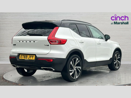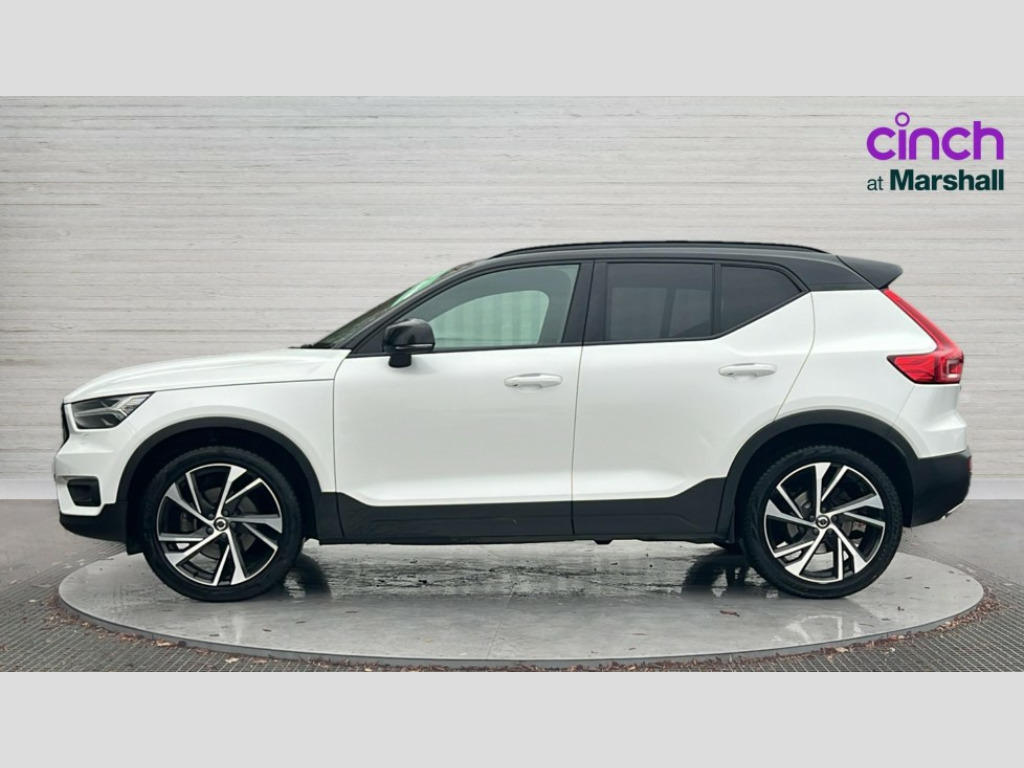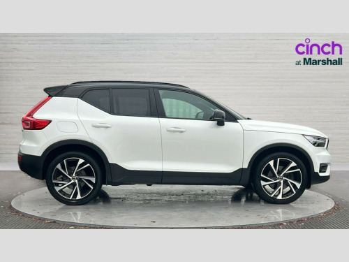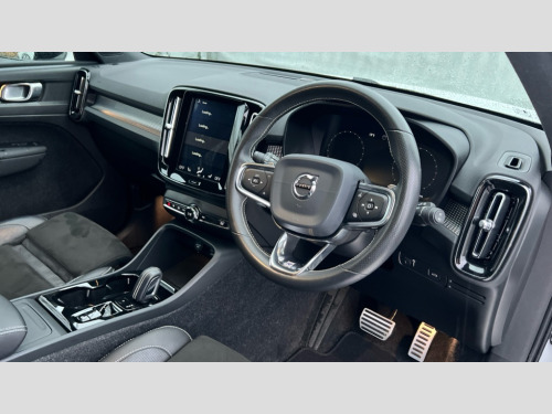 Volvo XC40 2.0 T4 R DESIGN Pro 5dr AWD Geartronic 12.3" Active TFT crystal driver's instrument display, 9" centre console portrait touch screen, Adjustable steering wheel force, Bluetooth hands free telephone kit, Drive mode selector, E-call, Lane keep assist with driver alert control, Oncoming Lane Mitigation, Sensus navigation with European mapping and traffic information, Speed limiter, Speed sensitive steering, Voice control system, Volvo on call, DAB Digital radio, Steering wheel mounted remote controls, Active bending headlights, Adaptive brake lights with high level LED brake lights, Auto dimming interior mirror, Automatic headlamp levelling, Black stone door mirrors, Black stone roof, Colour coordinated auto folding and heated power door mirrors, Dark tinted glass for rear windows + rear screen + side luggage area window, Dual integrated exhaust pipes with high gloss black surround, Electrically adjustable and heated door mirrors, Embossed rear side roof pillar, Front and rear electric windows, Front tread plates, Headlamp cleaning system, Heated front windscreen, Heated washer nozzles, High gloss black front and rear skid plate, High gloss black lower front bumper, High gloss black mesh front grille with high gloss black surround, High gloss black roof rails, High gloss black window trim, Home safe and approach lighting, LED front fog lights with static cornering light function, LED Headlights + Active high beam incorporating daytime running lights, Rain sensor windscreen wipers, Rear wiper, Roof antenna, Roof spoiler, Visible VIN plate, 12V socket in front tunnel console and luggage compartment, 2 zone electronic climate control with Clean zone air quality system + pollen filter + cooled glovebox, 3 spoke leather steering wheel with chrome trim, 60/40 split folding rear seat, A-pillar parking ticket holder, Ambient front door and instrumental panel lighting, Black headlining, Bright metal luggage threshold, Centre console cupholders and storage, Driver seat height/tilt/lumbar adjust, Driver's side lower dashboard credit card storage compartment, Extended front seat cushions, Front door pocket and front cupholder illumination, Front footwell illumination, Front tunnel net pocket and integrated waste bin, Glovebox bag hook, Heated front seats, Height/reach adjustable steering column, High gloss centre tunnel deco, Illuminated luggage compartment, Illuminated tailgate, Illuminated vanity mirrors + ticket holder, Isofix attachments on outer rear seats, Leather coloured key integrated remote, Leather/nubuck upholstery, Load protection net, Lockable/illuminated glovebox, Multicolour theatre lights, Passenger seat adjustable for lumbar support, Perforated leather gearknob, Perforated leather steering wheel with gearshift paddles, Power driver seat with memory + exterior mirrors memory, Rear armrest / integral cup holders / storage tray, Rear reading and courtesy lights, Sports pedals, Underfloor stowage compartment, 3x3 point rear seatbelts, City safety, Drivers knee airbag, DSTC-Dynamic Stability and Traction Control, Dual stage driver/passenger airbags, Electronic parking brake with auto hold, Fasten seatbelt reminder, First aid kit, Hill descent control, Hill start assist, Inflatable curtain, Passenger airbag cut-off device, Road sign information display, Run off Road Mitigation, Run off Road Protection, Seatbelt reminder and pretensioners, SIPS (Side Impact Protection System), SIPS airbags, Slippery road and hazard light alert, Tyre pressure monitoring system, Vehicle deceleration control with Anti-lock Brake System, Electronic Brake Distribution and Emergency Brake Assist, Warning triangle, WHIPS whiplash protection system - front, Anti-theft alarm including immobiliser/volume sensor + level sensor, Fuel flap with deadlocking system, Key integrated remote control central locking, Locking wheel nuts, Private locking for tailgate, Cutting edge aluminium inlay