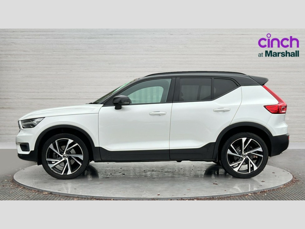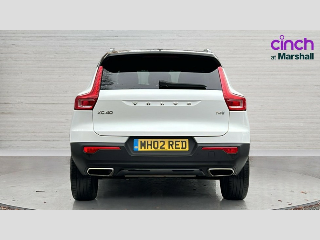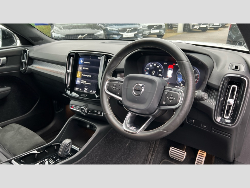 Volvo XC40 2.0 T4 R DESIGN Pro 5dr Geartronic 12.3" Active TFT crystal driver's instrument display, 9" centre console portrait touch screen, Adjustable steering wheel force, Bluetooth hands free telephone kit, Drive mode selector, E-call, Lane keep assist with driver alert control, Oncoming Lane Mitigation, Sensus navigation with European mapping and traffic information, Speed limiter, Speed sensitive steering, Voice control system, Volvo on call, DAB Digital radio, Steering wheel mounted remote controls, Active bending headlights, Adaptive brake lights with high level LED brake lights, Auto dimming interior mirror, Automatic headlamp levelling, Black stone door mirrors, Black stone roof, Colour coordinated auto folding and heated power door mirrors, Dark tinted glass for rear windows + rear screen + side luggage area window, Dual integrated exhaust pipes with high gloss black surround, Electrically adjustable and heated door mirrors, Embossed rear side roof pillar, Front and rear electric windows, Front tread plates, Headlamp cleaning system, Heated front windscreen, Heated washer nozzles, High gloss black front and rear skid plate, High gloss black lower front bumper, High gloss black mesh front grille with high gloss black surround, High gloss black roof rails, High gloss black window trim, Home safe and approach lighting, LED front fog lights with static cornering light function, LED Headlights + Active high beam incorporating daytime running lights, Rain sensor windscreen wipers, Rear wiper, Roof antenna, Roof spoiler, Visible VIN plate, 12V socket in front tunnel console and luggage compartment, 2 zone electronic climate control with Clean zone air quality system + pollen filter + cooled glovebox, 3 spoke leather steering wheel with chrome trim, 60/40 split folding rear seat, A-pillar parking ticket holder, Ambient front door and instrumental panel lighting, Black headlining, Bright metal luggage threshold, Centre console cupholders and storage, Driver seat height/tilt/lumbar adjust, Driver's side lower dashboard credit card storage compartment, Extended front seat cushions, Front door pocket and front cupholder illumination, Front footwell illumination, Front tunnel net pocket and integrated waste bin, Glovebox bag hook, Heated front seats, Height/reach adjustable steering column, High gloss centre tunnel deco, Illuminated luggage compartment, Illuminated tailgate, Illuminated vanity mirrors + ticket holder, Isofix attachments on outer rear seats, Leather coloured key integrated remote, Leather/nubuck upholstery, Load protection net, Lockable/illuminated glovebox, Multicolour theatre lights, Passenger seat adjustable for lumbar support, Perforated leather gearknob, Perforated leather steering wheel with gearshift paddles, Power driver seat with memory + exterior mirrors memory, Rear armrest / integral cup holders / storage tray, Rear reading and courtesy lights, Sports pedals, Underfloor stowage compartment, 3x3 point rear seatbelts, City safety, Drivers knee airbag, DSTC-Dynamic Stability and Traction Control, Dual stage driver/passenger airbags, Electronic parking brake with auto hold, Fasten seatbelt reminder, First aid kit, Hill descent control, Hill start assist, Inflatable curtain, Passenger airbag cut-off device, Road sign information display, Run off Road Mitigation, Run off Road Protection, Seatbelt reminder and pretensioners, SIPS (Side Impact Protection System), SIPS airbags, Slippery road and hazard light alert, Tyre pressure monitoring system, Vehicle deceleration control with Anti-lock Brake System, Electronic Brake Distribution and Emergency Brake Assist, Warning triangle, WHIPS whiplash protection system - front, Anti-theft alarm including immobiliser/volume sensor + level sensor, Fuel flap with deadlocking system, Key integrated remote control central locking, Locking wheel nuts, Private locking for tailgate, Cutting edge aluminium inlay