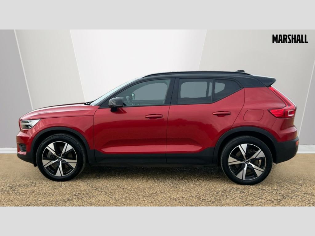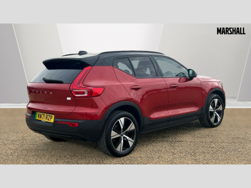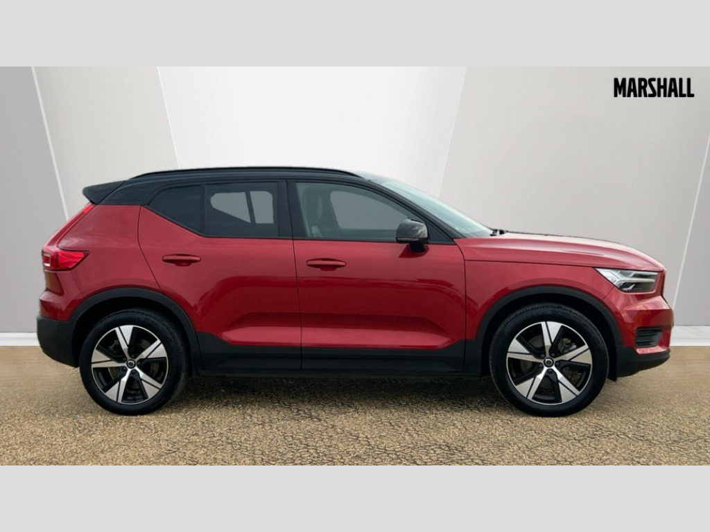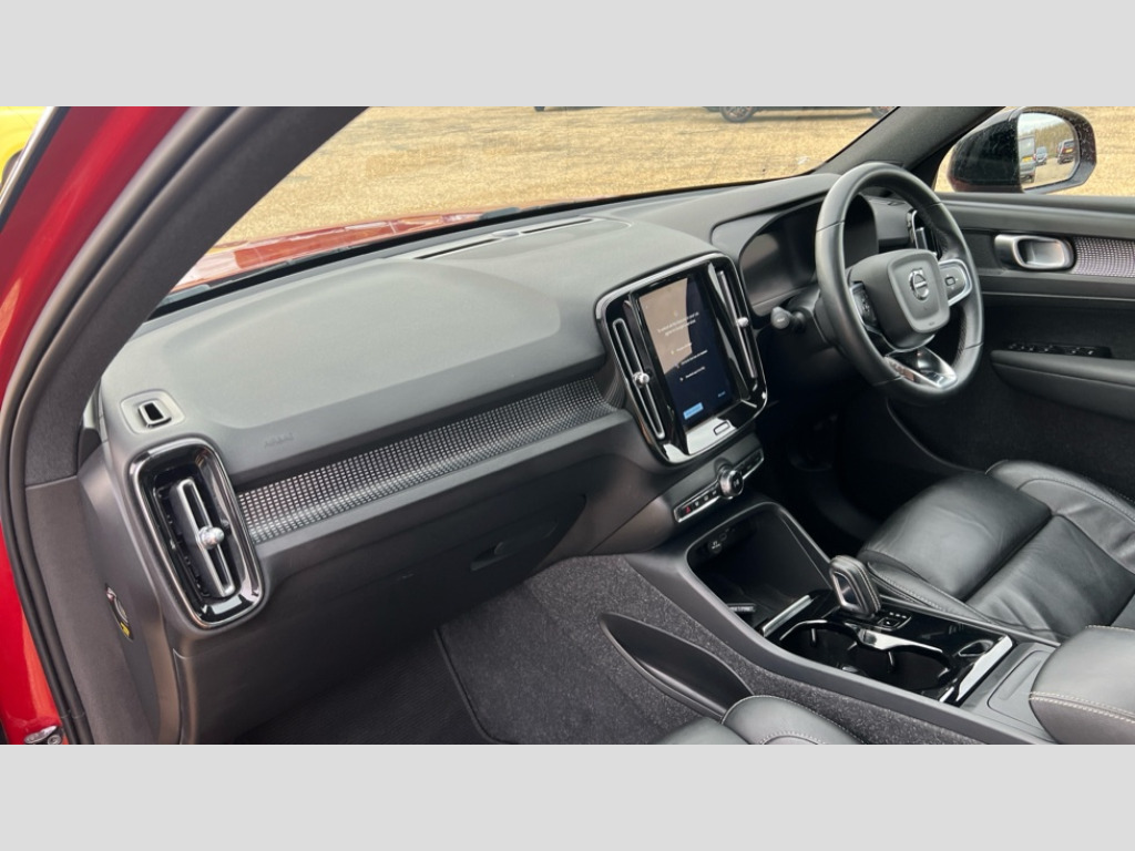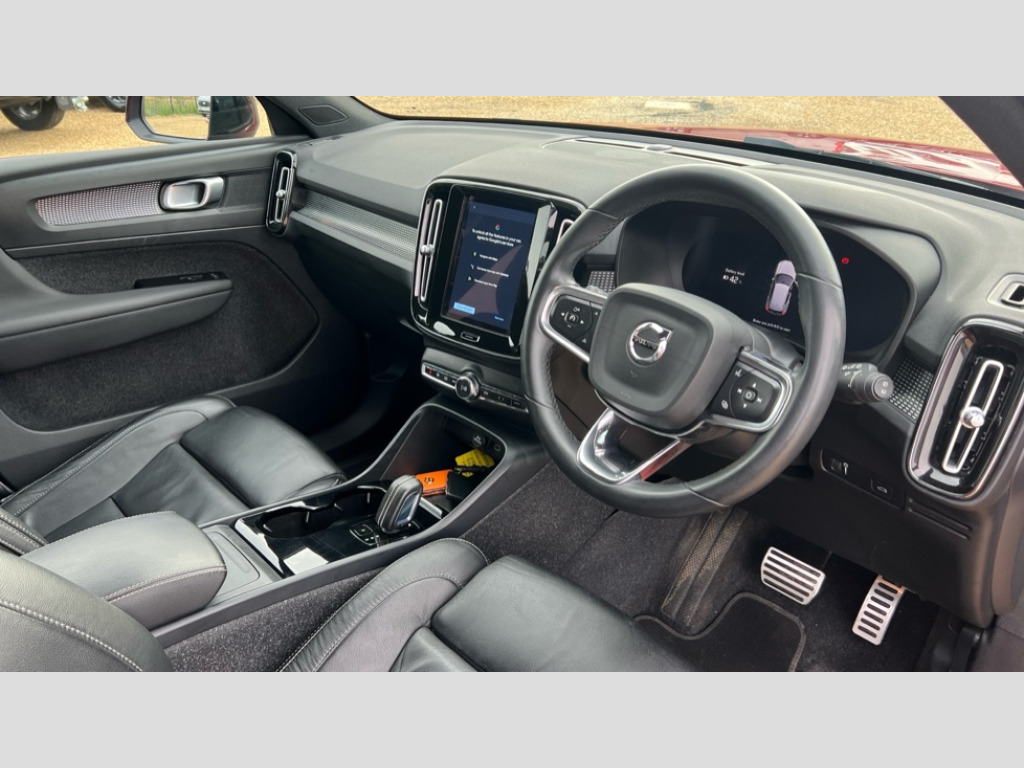 Volvo XC40 300kW Recharge Twin 78kWh 5dr AWD Auto 12.3" Progressive Driver Display, 9" centre console portrait touch screen, Adjustable steering wheel force, Bluetooth hands free telephone kit, Cruise control, Google automatic services - Nav with google maps, apple carplay/android auto, voice recognition with google assistant, Lane keep assist with driver alert control, Oncoming Lane Mitigation, Power operated tailgate, Rear park assist, Speed limiter, Speed sensitive steering, Volvo on call with charge station locations and route planning and pre climatisation, Wireless Smartphone Integration includes Apple CarPlay and Android auto, Wireless/Inductive Mobile Phone Charging, 11 kW AC onboard charger, 7m 10amp charge cable with 3 pin plug, Dynamic chassis, Electric front and rear axle drive, Recharging port located in nearside front wing, DAB Digital radio, High performance sound, 8 speakers/250W, front USB and 2 rear type C USB, Steering wheel mounted remote controls, Adaptive brake lights with high level LED brake lights, Auto dimming interior mirror, Automatic headlamp levelling, Black stone door mirrors, Black stone roof, Colour co-ordinated front grille and surround, Colour coordinated auto folding and heated power door mirrors, Dark tinted windows for rear door side windows and cargo compartment, Embossed rear side roof pillar, Front and rear electric windows, Front recharge tread plates, High gloss black front and rear skid plate, High gloss black lower front bumper, High gloss black roof rails, High gloss black sensus surround deco, High gloss black window trim, Home safe and approach lighting, LED Headlights + Active high beam incorporating daytime running lights, Rain sensor with automatic windscreen wiper activation, Rear wiper, Roof antenna, Roof spoiler, Visible VIN plate, 12V socket in front tunnel console and luggage compartment, 2 zone electronic climate control and rear air vent with clean zone air quality system and pollen filter, 3 spoke sports tailored steering wheel, 60/40 versatile split folding rear seat, A-pillar parking ticket holder, Ambient front door and instrumental panel lighting, Centre console cupholders and storage, Charcoal headlining, Driver's side lower dashboard credit card storage compartment, Extended front seat cushions, Flexible load floor and grocery bag holder, Floor mats, Front and Rear reading and courtesy lights, Front footwell illumination, Front headrests, Front load compartment (31 litres), Front tunnel net pocket and integrated waste bin, Glovebox bag hook, Height adjustable passenger seat, Height/reach adjustable steering column, Height/tilt adjustable driver's seat, High gloss centre tunnel deco, Illuminated glovebox, Illuminated luggage compartment, Illuminated tailgate, Illuminated vanity mirrors + ticket holder, Isofix attachments on outer rear seats, Load protection net, Multi directional lumbar support, Multicolour theatre lights, Rear armrest / integral cup holders / storage tray, Rear coat hook, Rear headrests, Sports pedals, Tailored gearknob, Underfloor cargo storage, 3x3 point rear seatbelts, City safety includes pedestrain detection and front collision warning with full auto brake, Drivers knee airbag, Dual stage driver/passenger airbags, Electronic parking brake with auto hold, First aid kit, Front and outer rear seatbelt reminder and pretensioners, Front seats SIPS airbags, Hill descent control, Hill start assist, Inflatable curtain, Passenger airbag cut-off device, Power child locks on rear doors, Road sign information display, Run off Road Mitigation, Run off Road Protection, SIPS (Side Impact Protection System), Slippery road and hazard light alert, Stability and Traction Control with Spin control, Engine Drag Control and Corner Traction Control, Tyre pressure monitoring system, Vehicle deceleration control with Anti-lock Brake System, Electronic Brake Distribution and Emergency Brake Assist, Warning triangle, WHIPS whiplash protection system - front, Anti-theft alarm including immobiliser/volume sensor + level sensor, Care key with user defined top speed, Convenient entry and start, Key integrated remote control central locking + fuel flap with deadlocking system and auto open/close power windows, Keyless drive plus handsfree tailgate opening/closing, Locking wheel nuts, Private locking for tailgate, Cutting edge aluminium inlay, 19" 5 Spoke diamond cut/high gloss black alloy wheels, Tyre sealant kit + 12v compressor