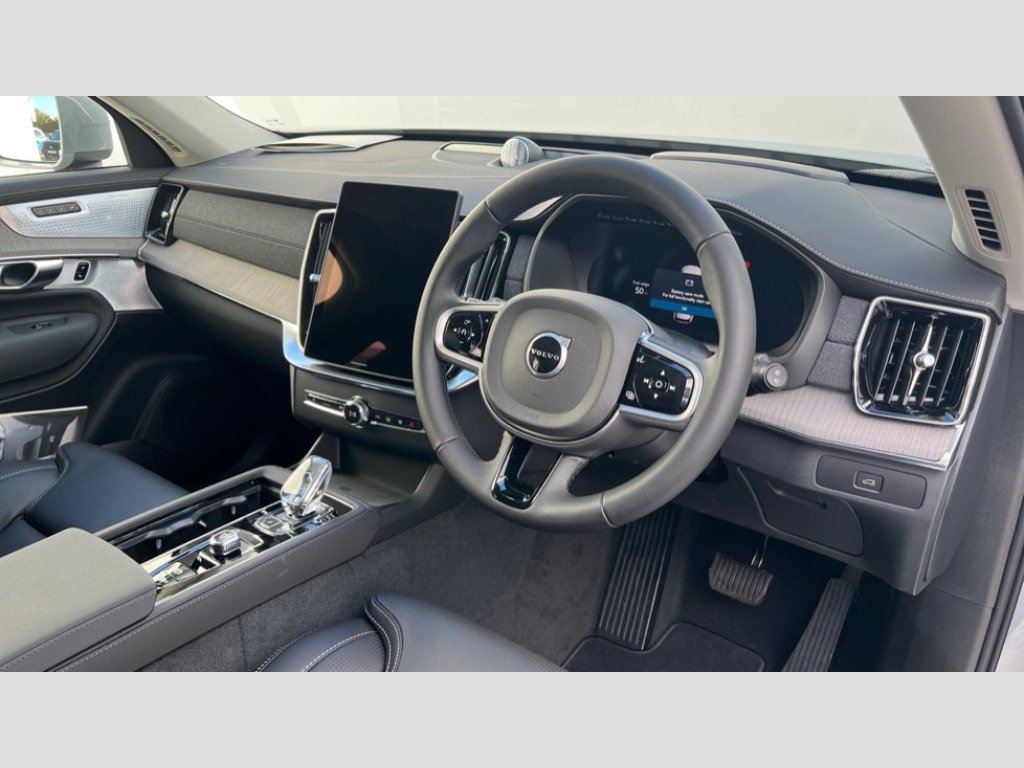 Volvo XC90 2.0 B5P Ultra Dark 5dr AWD Geartronic 11.2" centre console touch screen, 12.3" Progressive Driver Display, 360 degree surround view parking camera with side proximity sensors, Adjustable steering wheel force, Apple carplay (wired), Bluetooth handsfree system, Driver alert control with lane keeping aid, Driver assistance (pilot assist and adaptive cruise control), Driver awareness - Blind spot information system with steer assist, cross traffic alert with autobrake and rear collision warning and mitigation, Emergency call service, Front and rear park assist, Google Automotive Services - Navigation with Voice recoginition and google assistant, Handsfree power tailgate opening and closing, Intelligent speed assistance, Oncoming Lane Mitigation, PAS, Power operated tailgate, Service interval indicator, Speed sensitive steering, Trip computer, Volvo on call, Wireless/Inductive Mobile Phone Charging, 8 speed automatic transmission with start/stop + manual change functions, Active four C chassis - four corner adaptive dampers with electronic air suspension, DAB Radio (Digital Audio Broadcasting), Premium Sound by Bowers and Wilkins, dirac live, dolby pro logic II surround sound, 18 speakers/1400W output and fresh air subwoofer, Steering wheel remote infotainment controls, Adaptive brake lights with high level LED brake lights, Auto dimming interior + exterior mirrors, Auto folding and heated power door mirrors, Automatic headlight levelling system, Automatic matrix LED headlights with Adaptive shadow technology and Active high beam, incorporating Day running lights, Body colour bumpers, Bright chrome front grille and deco, Chrome front and rear bumper deco, Chrome lower side mouldings, Chrome window surround, Colour coordinated door mirrors, Dark tinted windows - rear side windows and rear screen, Front and rear power windows, Headlight cleaning system, Home safe and approach lighting, Integrated roof rails in Chrome, Laminated side and rear windows, Power glass tilt and slide panoramic sunroof with sun curtain, Puddle lights, Rain sensor with automatic windscreen wiper activation, Rear side wing doors, Rear wash/wipe with intermittent wipe setting, Roof antenna, Roof spoiler, Visible VIN plate, 12V socket in luggage compartment, 2nd Row centre armrest with and cupholders, 3 Spoke tailored sport steering wheel with chrome trim, 4 zone electronic climate control with Clean zone air quality system + pollen filter, A-pillar parking ticket holder, Air conditioning for 3rd row of seats, Air purifier PM2.5, Ambient door and instrument panel lighting, B Pillar ventilation, Bright metal luggage scuff plate, Centre console cupholders and storage, Floor mats, Front and rear courtesy lights, Front and rear door pocket illumination, Front footwell and side step illumination, Front headrests, Front reading lights, Front seat cushion extensions, Front tunnel storage illumination, Glovebox compartment light, Heated front seats, Heated rear seats, Heated steering wheel, Height/reach adjustable steering column, Illuminated front and rear aluminium tread plates, Illuminated luggage compartment, Illuminated tailgate, Illuminated vanity mirrors + ticket holder, Inner door release handle illumination, Integrated sun curtains in rear doors, Isofix outer rear child seat preparation in 2nd row, Load cover, Load protection net, Lockable glovebox compartment, Luggage compartment divider with grocery bag holder, Outboard armrest with cupholder and storage for third row passengers, Power driver seat with multi directional lumbar support and memory for seat and exterior mirrors, Power folding 2nd row headrests, Power passenger seat with multi directional lumbar support and memory, Rear footwell and side step illumination, Rear headrests, Rear reading lights, Second row integrated child seat for centre seat, Single front passenger seat, Three 2nd row individual folding passenger seats with fore/aft adjustment, Two 3rd row individual folding passenger seats, Underfloor luggage compartment storage, 7 three point seatbelts, City safety with steering support includes pedestrian, cyclist detection, front collision warning with full auto brake and rear auto brake, Driver and passenger airbags, Drivers knee airbag, First aid kit, Front seats SIPS airbags, Hill descent control - off drive mode, Hill start assist, IC (Inflatable Curtains) - Full Length, Passenger airbag cut-off switch, Power child locks on rear doors, Power parking brake with auto hold function, Road sign information display, Run off Road Protection, Seatbelt reminder and pretensioners for all seats, SIPS (Side Impact Protection System), Slippery road and hazard light alert, Stability and Traction Control with Spin control, Engine Drag Control and Corner Traction Control, Tyre pressure monitoring system, Vehicle deceleration control with Anti-lock Brake System, Electronic Brake Distribution and Emergency Brake Assist, Warning triangle, WHIPS whiplash protection system - front, 2x Key integrated remote control central locking + deadlocking system and auto open/close windows, Anti-theft alarm including immobiliser/volume sensor + level sensor, Keyless drive includes keyless entry and keyless start, Locking wheel nuts, Tailored instrument panel and door tops, Tempa spare wheel and jack