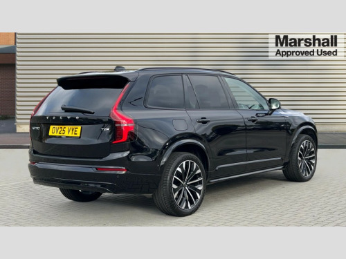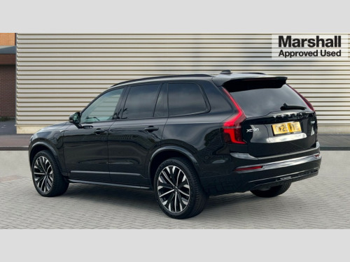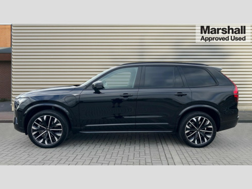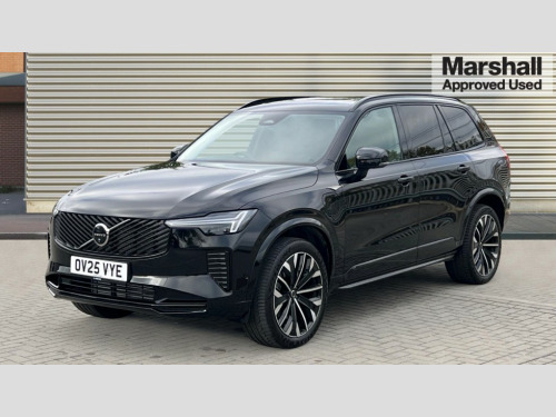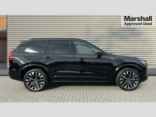 Volvo XC90 2.0 T8 PHEV Plus Dark 5dr AWD Geartronic 12.3" Progressive Driver Display, 360 degree surround view parking camera with side proximity sensors, 9" centre console portrait touch screen, Adjustable steering wheel force, Bluetooth hands free telephone connection, Drive mode settings, Driver alert control with lane keeping aid, Driver assistance (pilot assist and adaptive cruise control), Driver awareness - Blind spot information system with steer assist, cross traffic alert with autobrake and rear collision warning and mitigation, Emergency call service, Front and rear park assist, Google Automotive Services - Navigation with Voice recoginition and google assistant, Handsfree power tailgate opening and closing, Oncoming Lane Mitigation, Power operated tailgate, Service interval indicator, Speed limiter, Speed sensitive steering, Trip computer, Volvo on call, Wireless Mobile Phone Charger, 6m 3 phase 16amp Type 2 / mode 3 charge cable, 7m 10amp charge cable with 3 pin plug, 8 speed automatic transmission with start/stop + manual change functions, Electric rear axle drive, Lithium-ion battery, On board charger - 6.4 kW 2 phase/3.7kW single phase, Recharging port located in nearside front wing, Touring chassis, DAB Radio (Digital Audio Broadcasting), Low speed exterior sound speaker, Premium Sound by Harman Kardon, dirac unison, dolby pro logic II surround sound, 13 speakers/600W output and fresh air subwoofer, Steering wheel remote infotainment controls, Active bending headlights with adaptive shadow technology, Adaptive brake lights with high level LED brake lights, Auto dimming interior + exterior mirrors, Auto folding and heated power door mirrors, Automatic headlight levelling system, Automatic LED Headlights + Active high beam incorporating daytime running lights, Body colour bumpers, Front and rear power windows, Headlight cleaning system, Heated front windscreen, High gloss black door mirrors and window surround, High gloss black front and rear bumper deco, High gloss black mesh front grille with surround, Home safe and approach lighting, Integrated roof rails in high gloss black, Power glass tilt and slide panoramic sunroof with sun curtain, Puddle lights, Rain sensor with automatic windscreen wiper activation, Rear side wing doors, Rear wash/wipe with intermittent wipe setting, Roof antenna, Roof spoiler, Visible VIN plate, 12V socket front tunnel console, rear passenger compartment and cargo area, 2 seat bench in 3rd row, 2nd Row centre armrest with and cupholders, 3 seat bench in 2nd row, 4 zone electronic climate control with Clean zone air quality system + pollen filter, A-pillar parking ticket holder, Advanced interior air cleaner PM2.5, Air conditioning for 3rd row of seats, Ambient door and instrument panel lighting, B Pillar ventilation, Bright metal luggage threshold, Centre console cupholders and storage, Floor mats, Front and rear door pocket and front cupholder illumination, Front and rear reading lights, Theatre lighting and centre armrest storage illumination, Front footwell and side step illumination, Front headrests, Front seat cushion extensions, Heated front seats, Heated rear seats, Heated steering wheel, Height/reach adjustable steering column, Illuminated front and rear tread plates, Illuminated luggage compartment, Illuminated tailgate, Illuminated vanity mirrors + ticket holder, Illumination lockable glovebox compartment, Integrated sun curtains in rear doors, Isofix outer rear child seat preparation in 2nd row, Load protection net, Luggage compartment divider with grocery bag holder, Outboard armrest with cupholder and storage for third row passengers, Power driver seat with multi directional lumbar support and memory for seat and exterior mirrors, Power folding 2nd row headrests, Power passenger seat with multi directional lumbar support and memory, Rear footwell and side step illumination, Rear headrests, Semi automatic load cover, Single front passenger seat, Underfloor luggage compartment storage, 7 three point seatbelts, City safety with steering support includes pedestrian, cyclist and large animal detection and front collision warning with full auto brake, Drivers knee airbag, Dual stage driver/passenger airbags, First aid kit, Front seats SIPS airbags, Hill descent control - off drive mode, Hill start assist, IC (Inflatable Curtains) - Full Length, Passenger airbag cut-off switch, Power child locks on rear doors, Power parking brake with auto hold function, Road sign information display, Run off Road Mitigation, Run off Road Protection, Seatbelt reminder and pretensioners for all seats, SIPS (Side Impact Protection System), Slippery road and hazard light alert, Stability and Traction Control with Spin control, Engine Drag Control and Corner Traction Control, Tyre pressure monitoring system, Vehicle deceleration control with Anti-lock Brake System, Electronic Brake Distribution and Emergency Brake Assist, Warning triangle, WHIPS whiplash protection system - front, Anti-theft alarm including immobiliser/volume sensor + level sensor, Care key with user defined top speed, Key integrated remote control central locking + fuel flap with deadlocking system and auto open/close power windows, Keyless drive includes keyless entry and keyless start, Locking wheel nuts, Private locking for glovebox and tailgate, Tailored Instrument Panel and Door Tops with Contrast Stitching, Tyre sealant kit and compressor
