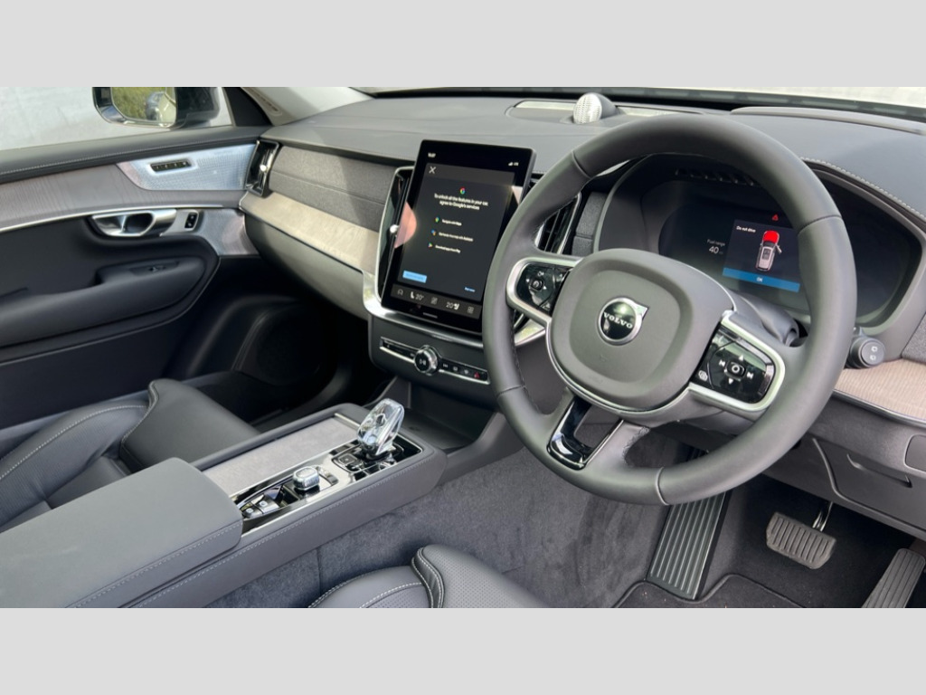 Volvo XC90 2.0 T8 PHEV Ultra Dark 5dr AWD Geartronic 11.2" centre console touch screen, 12.3" Progressive Driver Display, 360 degree surround view parking camera with side proximity sensors, Adjustable steering wheel force, Apple carplay (wired), Bluetooth handsfree system, Drive mode settings, Driver alert control with lane keeping aid, Driver assistance (pilot assist and adaptive cruise control), Driver awareness - Blind spot information system with steer assist, cross traffic alert with autobrake and rear collision warning and mitigation, Emergency call service, Front and rear park assist, Google Automotive Services - Navigation with Voice recoginition and google assistant, Handsfree power tailgate opening and closing, Intelligent speed assistance, Oncoming Lane Mitigation, PAS, Power operated tailgate, Service interval indicator, Speed sensitive steering, Trip computer, Volvo on call, Wireless/Inductive Mobile Phone Charging, 6m 3 phase 16amp Type 2 / mode 3 charge cable, 8 speed automatic transmission with start/stop + manual change functions, Active four C chassis - four corner adaptive dampers with electronic air suspension, Electric rear axle drive, Lithium-ion battery, On board charger - 6.4 kW 2 phase/3.7kW single phase, Recharging port located in nearside front wing, DAB Radio (Digital Audio Broadcasting), Low speed exterior sound speaker, Premium Sound by Bowers and Wilkins, dirac live, dolby pro logic II surround sound, 18 speakers/1400W output and fresh air subwoofer, Steering wheel remote infotainment controls, Adaptive brake lights with high level LED brake lights, Auto dimming interior + exterior mirrors, Auto folding and heated power door mirrors, Automatic headlight levelling system, Automatic matrix LED headlights with Adaptive shadow technology and Active high beam, incorporating Day running lights, Body colour bumpers, Dark tinted windows - rear side windows and rear screen, Front and rear power windows, Headlight cleaning system, High gloss black door mirrors and window surround, High gloss black front and rear bumper deco, High gloss black front grille and deco, Home safe and approach lighting, Integrated roof rails in high gloss black, Laminated side and rear windows, Power glass tilt and slide panoramic sunroof with sun curtain, Puddle lights, Rain sensor with automatic windscreen wiper activation, Rear side wing doors, Rear wash/wipe with intermittent wipe setting, Roof antenna, Roof spoiler, Visible VIN plate, 12V socket in luggage compartment, 2nd Row centre armrest with and cupholders, 3 Spoke tailored sport steering wheel with chrome trim, 4 zone electronic climate control with Clean zone air quality system + pollen filter, A-pillar parking ticket holder, Air conditioning for 3rd row of seats, Air purifier PM2.5, Ambient door and instrument panel lighting, B Pillar ventilation, Bright metal luggage scuff plate, Centre console cupholders and storage, Floor mats, Front and rear courtesy lights, Front and rear door pocket illumination, Front footwell and side step illumination, Front headrests, Front reading lights, Front seat cushion extensions, Front tunnel storage illumination, Glovebox compartment light, Heated front seats, Heated rear seats, Heated steering wheel, Height/reach adjustable steering column, Illuminated front and rear aluminium tread plates, Illuminated luggage compartment, Illuminated tailgate, Illuminated vanity mirrors + ticket holder, Inner door release handle illumination, Integrated sun curtains in rear doors, Isofix outer rear child seat preparation in 2nd row, Load cover, Load protection net, Lockable glovebox compartment, Luggage compartment divider with grocery bag holder, Outboard armrest with cupholder and storage for third row passengers, Power driver seat with multi directional lumbar support and memory for seat and exterior mirrors, Power folding 2nd row headrests, Power passenger seat with multi directional lumbar support and memory, Rear footwell and side step illumination, Rear headrests, Rear reading lights, Second row integrated child seat for centre seat, Single front passenger seat, Three 2nd row individual folding passenger seats with fore/aft adjustment, Two 3rd row individual folding passenger seats, Underfloor luggage compartment storage, 7 three point seatbelts, City safety with steering support includes pedestrian, cyclist detection, front collision warning with full auto brake and rear auto brake, Driver and passenger airbags, Drivers knee airbag, First aid kit, Front seats SIPS airbags, Hill descent control - off drive mode, Hill start assist, IC (Inflatable Curtains) - Full Length, Passenger airbag cut-off switch, Power child locks on rear doors, Power parking brake with auto hold function, Road sign information display, Run off Road Protection, Seatbelt reminder and pretensioners for all seats, SIPS (Side Impact Protection System), Slippery road and hazard light alert, Stability and Traction Control with Spin control, Engine Drag Control and Corner Traction Control, Tyre pressure monitoring system, Vehicle deceleration control with Anti-lock Brake System, Electronic Brake Distribution and Emergency Brake Assist, Warning triangle, WHIPS whiplash protection system - front, 2x Key integrated remote control central locking + deadlocking system and auto open/close windows, Anti-theft alarm including immobiliser/volume sensor + level sensor, Keyless drive includes keyless entry and keyless start, Locking wheel nuts, Tailored instrument panel and door tops, Tyre sealant kit and compressor
