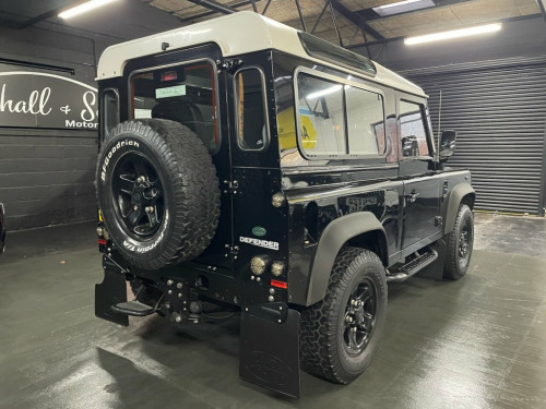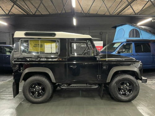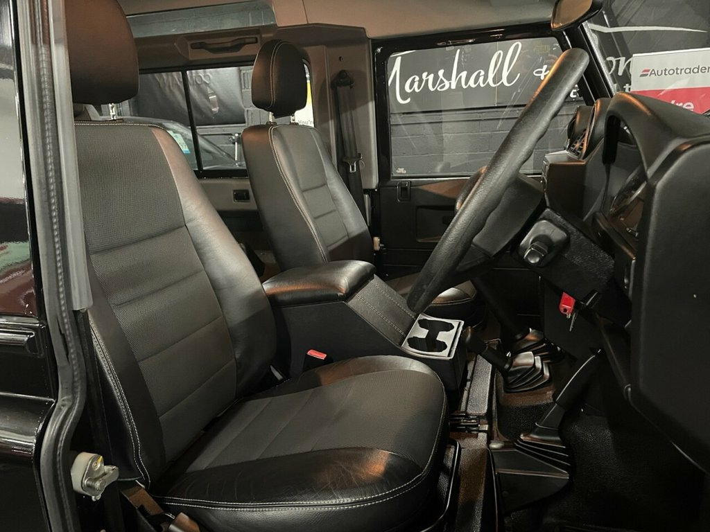 STUNNING LOOKING DEFENDER 90 IN SANTORINI BLACK, 2.4 TDCI, 12 SERVICE STAMOS TO 104K, HALF LEATHER, FORWARD FACING REAR SEATS, 16 INCH GLOSS BLACK BOOST ALLOYS WITH ALL TERRAIN TYRES, SIDE STEPS, MUD GUARDS, UPGRADED LED HEADLIGHTS, FRONT FOG LIGHTS, CONTRAST WHITE ROOF, TOW BAR, UNDERRIDE PROTECTION BAR, FULL SIZE SPARE WHEEL, LEATHER CENTRE ARMREST CUBBY CUBBY BOX, ELECTRIC WINDOWS. 16in Steel Wheels, Delete Rear Seats, Folding Rear step, Low line cubby box, Michelin XPC 750x16 Tyres, Radio Pre-wiring, Rear rubber mats, Santorini Black, Under-ride protection bar