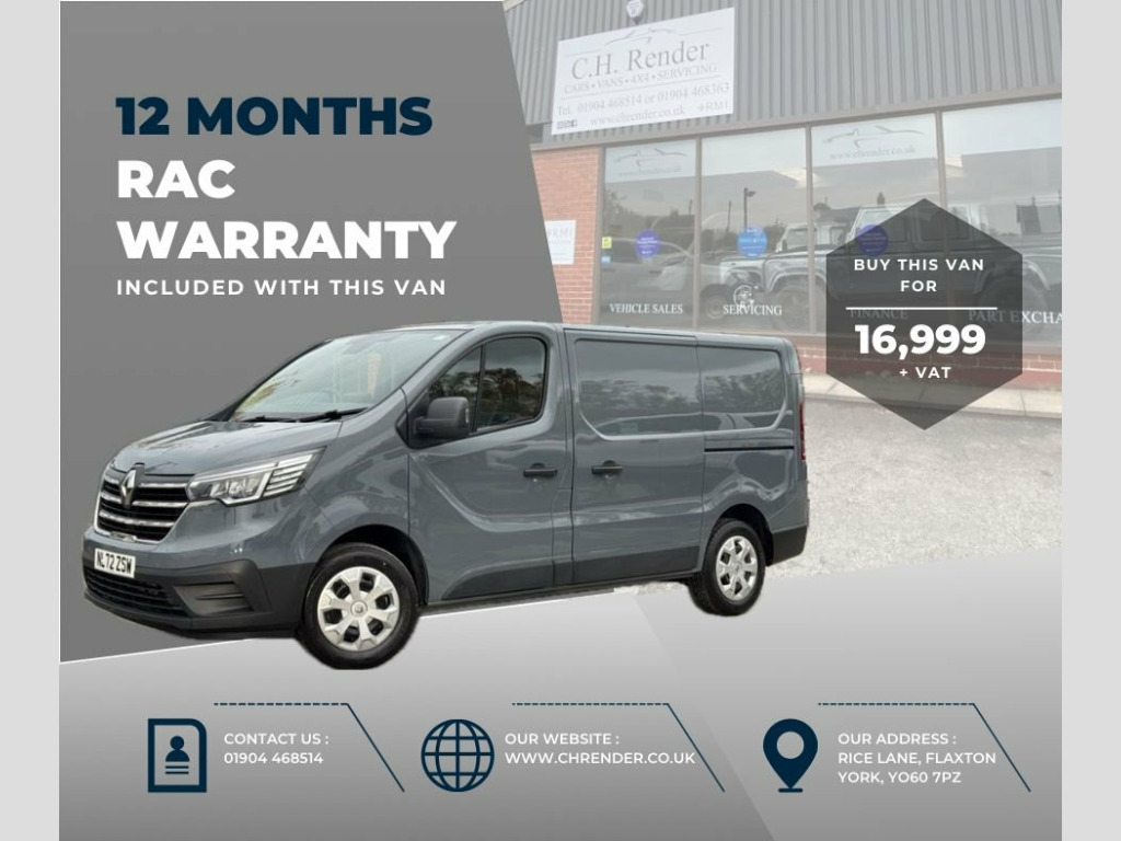 *** SPECIAL OFFER FOR DECEMBER - 12 MONTHS PLATINUM RAC WARRANTY WITH 12 MONTHS RAC BREAKDOWN COVER INCLUDED IN THE SALE PRICE *** 2022 22 RENAULT TRAFIC 2.0 dCi Blue SL28 Business+ Panel Van 5dr Diesel Manual L1 H1 Euro 6 (s/s) (130 ps) One former keeper, Two keys, Service history, Parking Sensor(s), Air Conditioning, Cruise control with speed limiter, , Smart phone integration with Android auto & Apple CarPlay, Electric front windows with one touch drivers window, Full LED headlights with Cshaped DRL,, Heated with electric adjustment door mirrors and external temperature sensors, Cloth Trim - Grey Kompo, Solid Paint - Urban Grey, Max. Towing Weight Braked 2500KG, Payload 911KG, Three seats, good condition inside and out. For more details, please contact either Daniel or Linda on 01904 468514 FINANCE AVAILABLE 12V Power Socket - Load Area, 16in Steel Wheels - Siras - Large Wheel , 3.5in Monochrome TFT Driver Information , ABS with EBD - Electronic Brake Force Di, Airbags - Driver, Alarm, Anchorage Points x16, Black Door Mirrors, Body Coloured Door Rail, Body Coloured Front Bumper, Body-Coloured Rear Tail Column, Bulkhead - Full Steel with Load-Through , Chrome Grille, Closed Glovebox, Cruise Control with Speed Limiter, Dashboard with Geometric Grain, Deadlocking, Door Mirrors - Heated with Electric Adju, Drivers Seat with Armrest - Height Adjus, EASY LINK Display with 8in Touchscreen, EASY LINK Navigation with 8in Touchscree, Eco Mode Button, Electric Front Windows - Drivers Side - , Electronic En